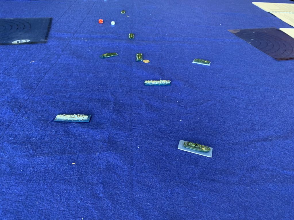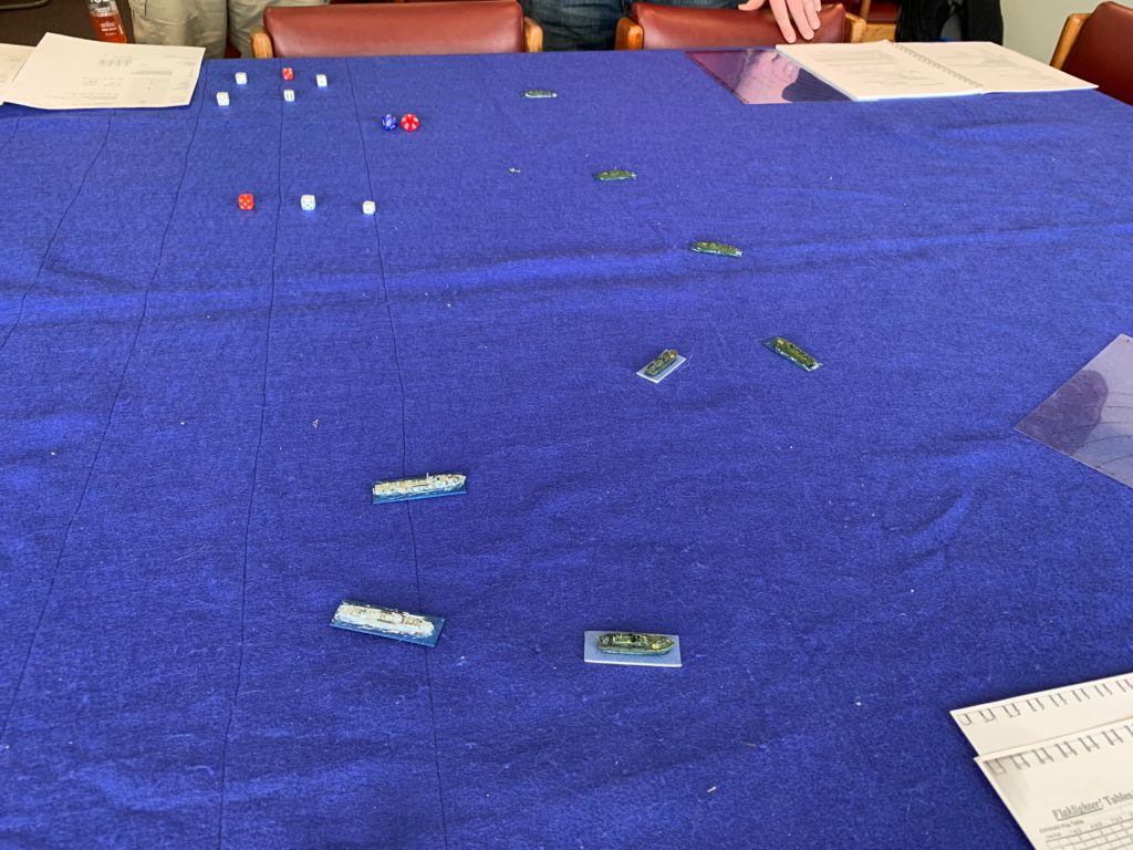 As Germans we split our forces. The first thing to note is the wake markers. Those indicate the speed. 1 knot == 1cm on the table. No inches in this game. Initiative is via the drawing of dice from a bag. One die per boat. In a game like this, that’s 4 Brit dice vs 2 German in the bag.