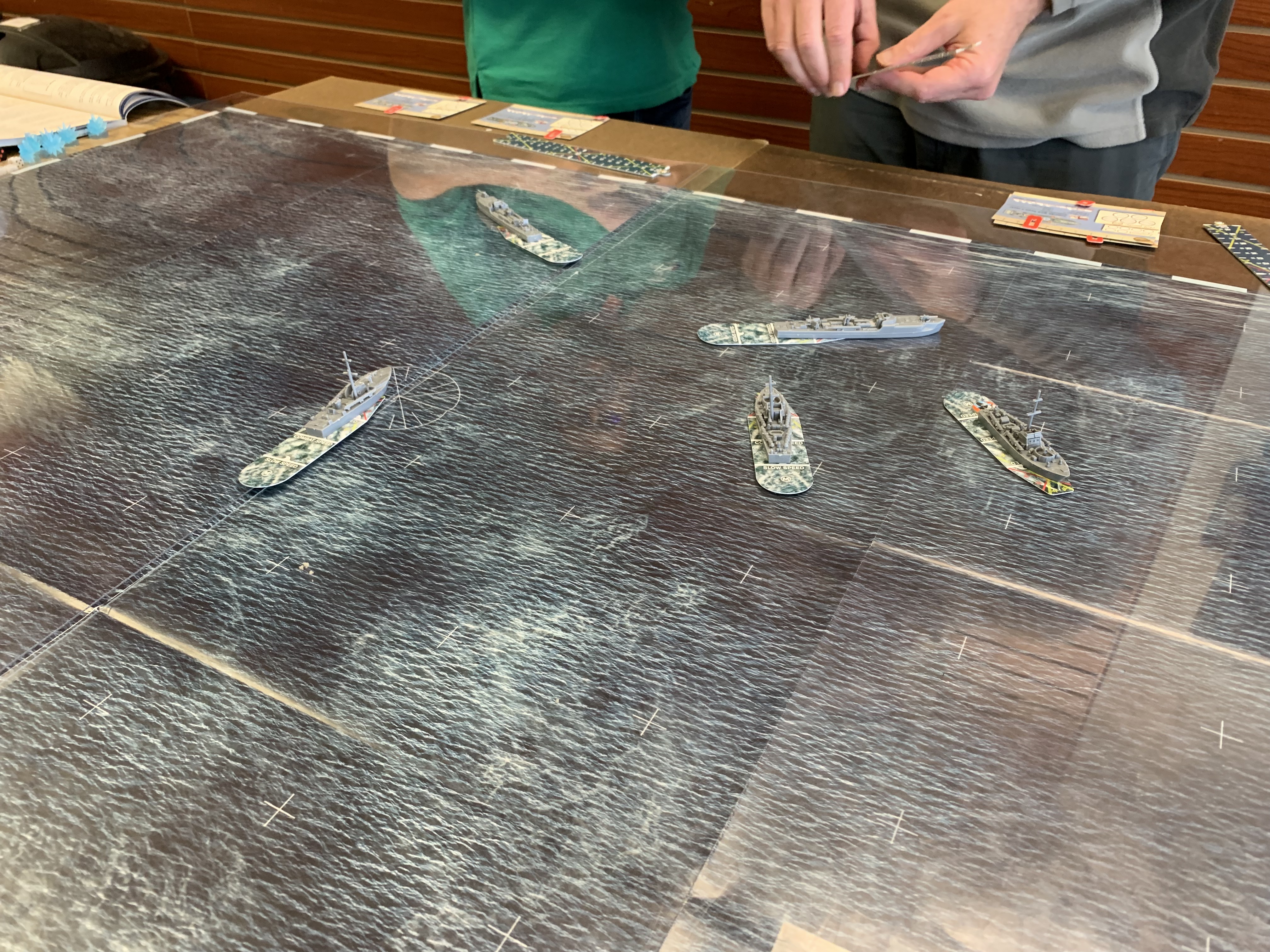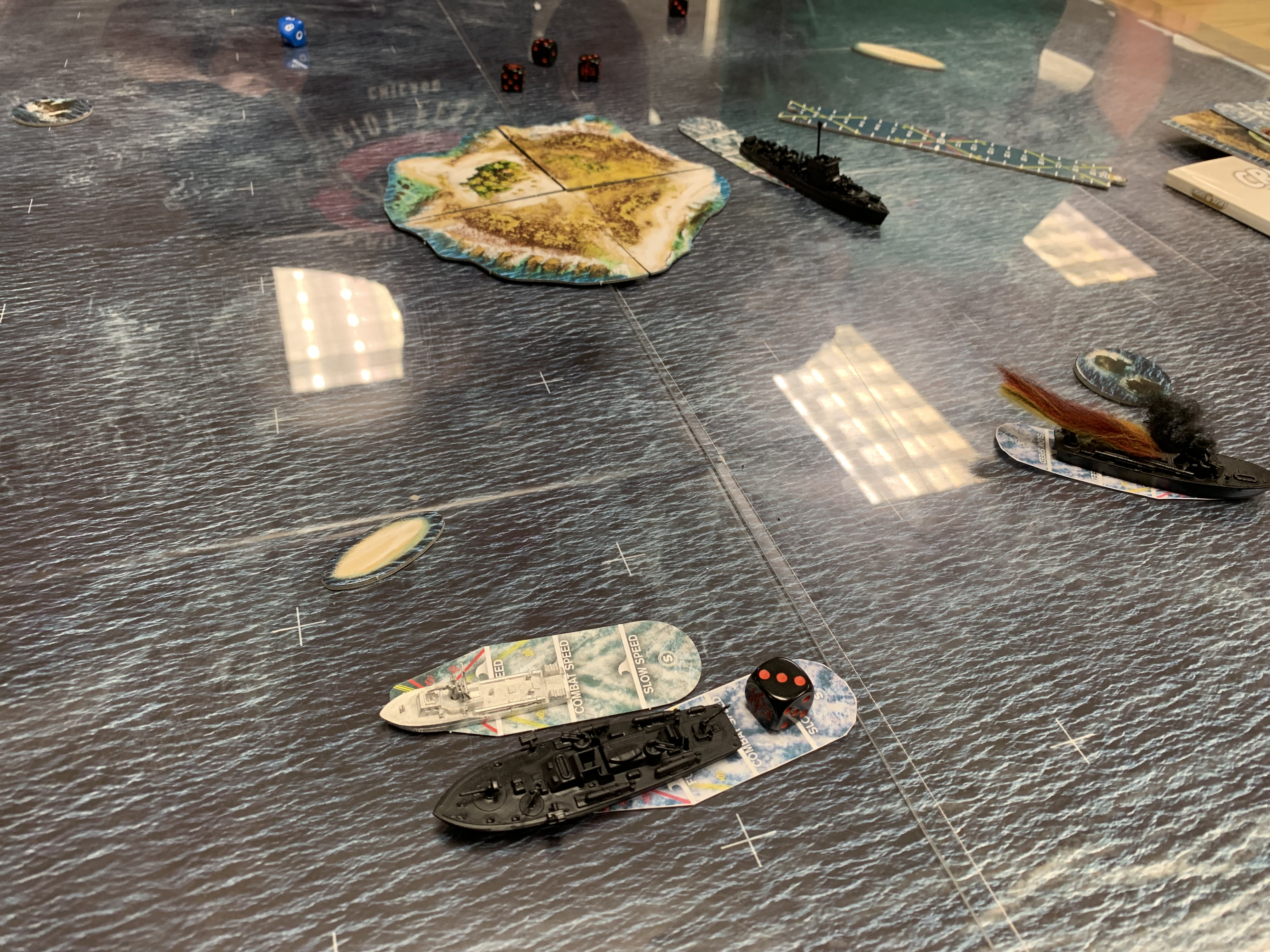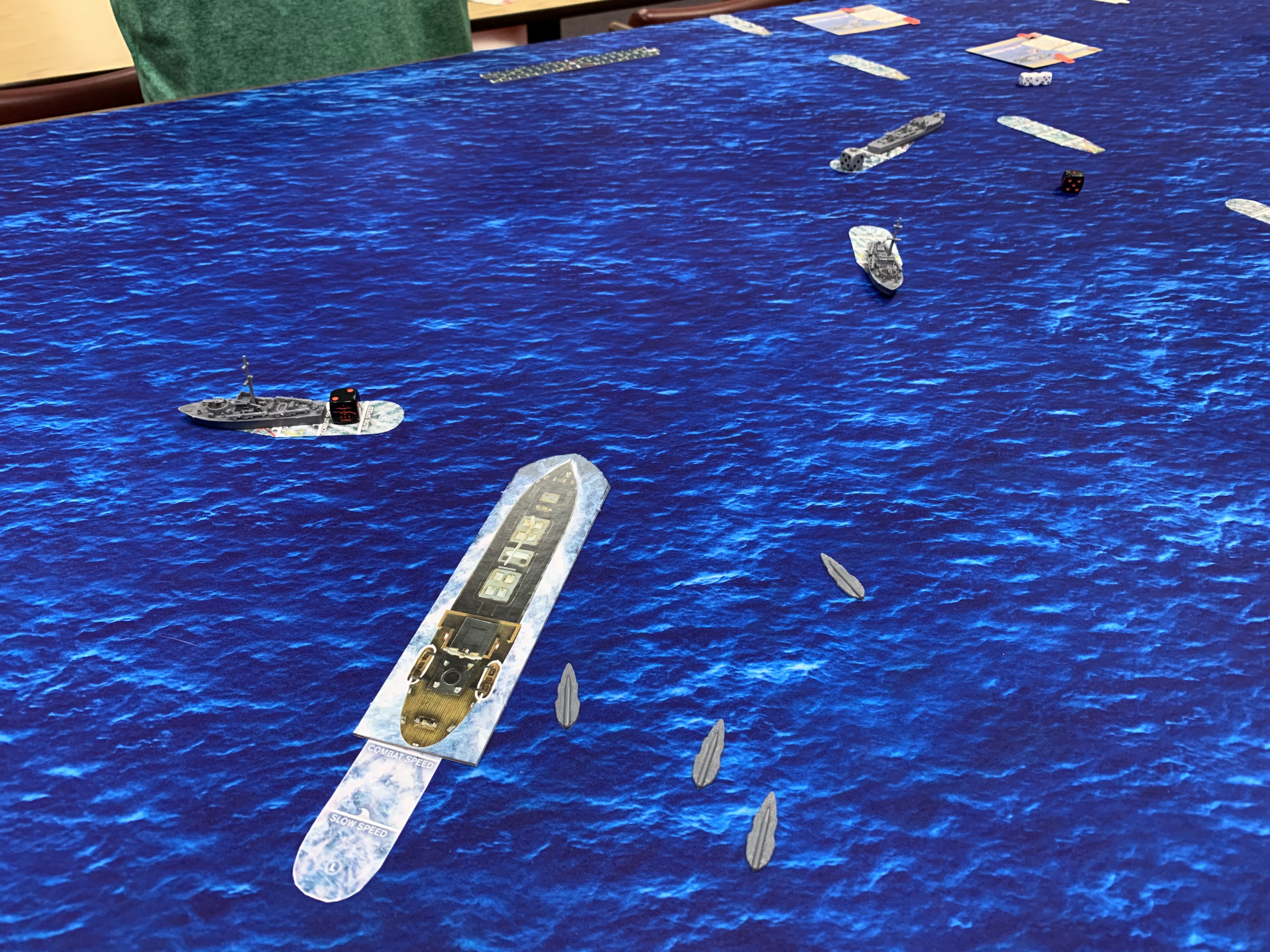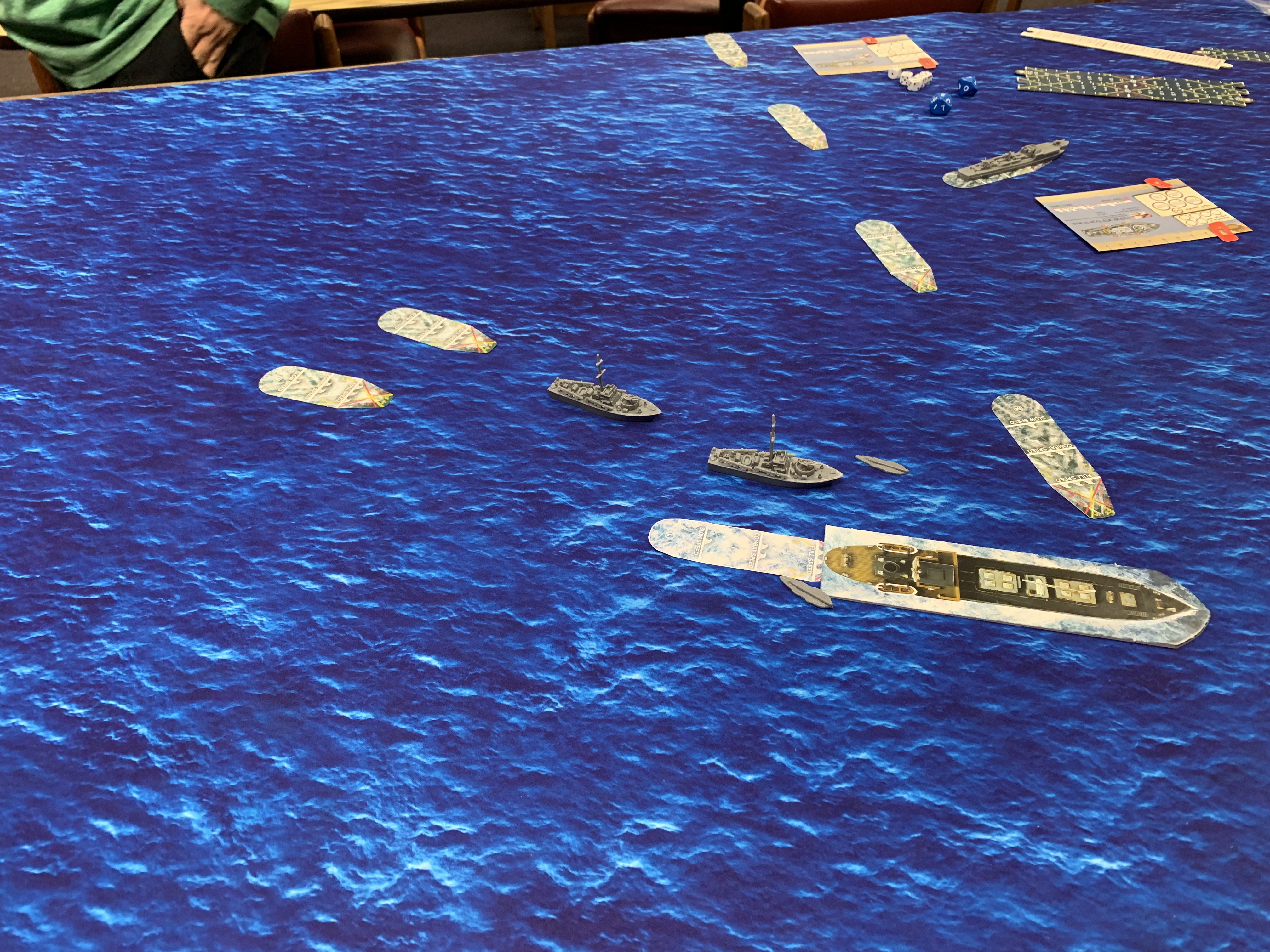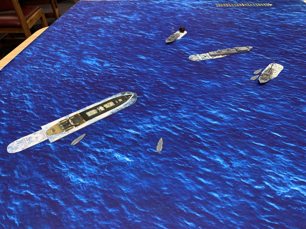 With torps in the water I steered direct into their path. Torps drop into the water at the end of activation for the boat firing them. Then when that boat activates the next turn they move 40 knots in a straight direction. You’re able to fire up to 30 degrees off the bow so you have some ability to compensate for your ability to pilot.