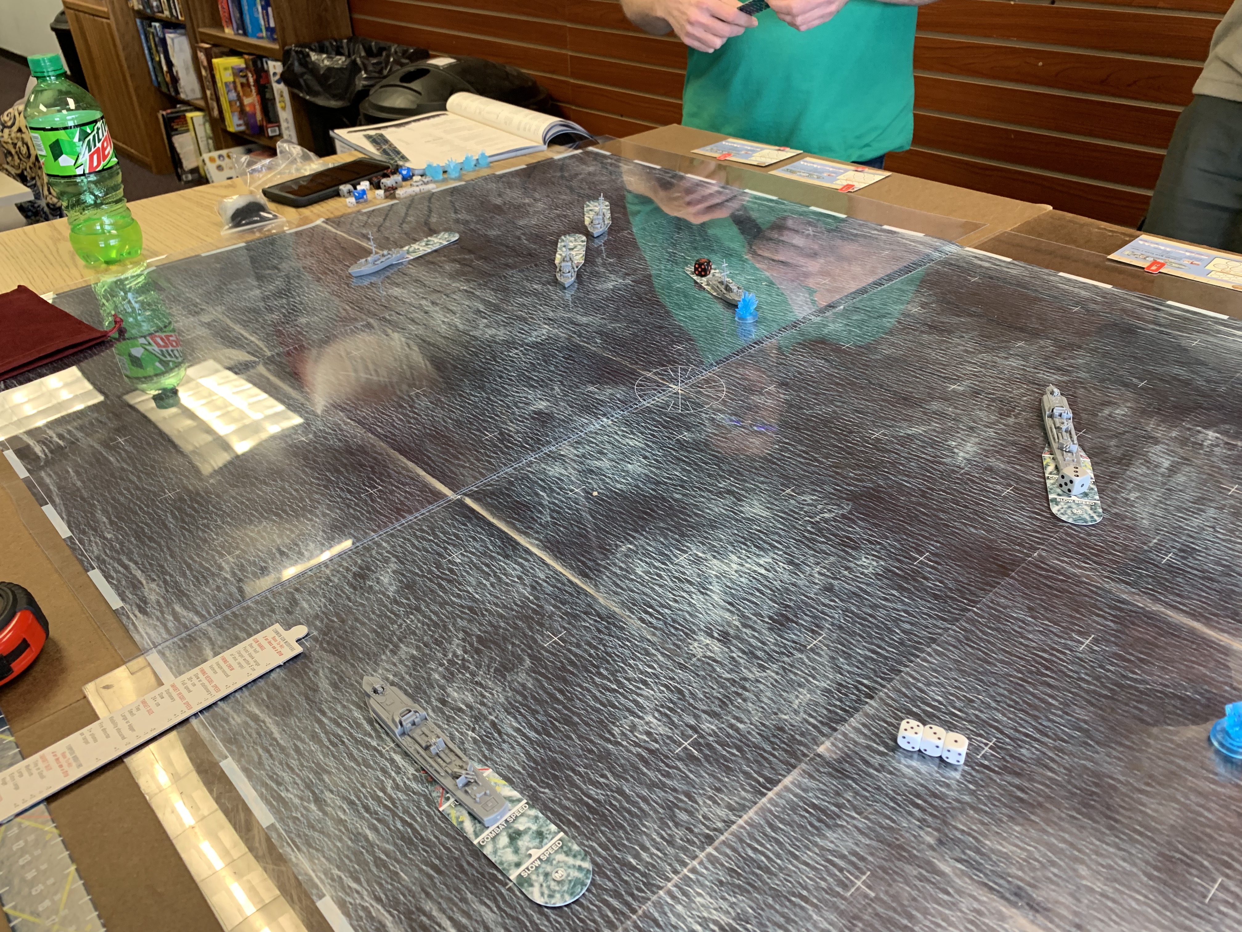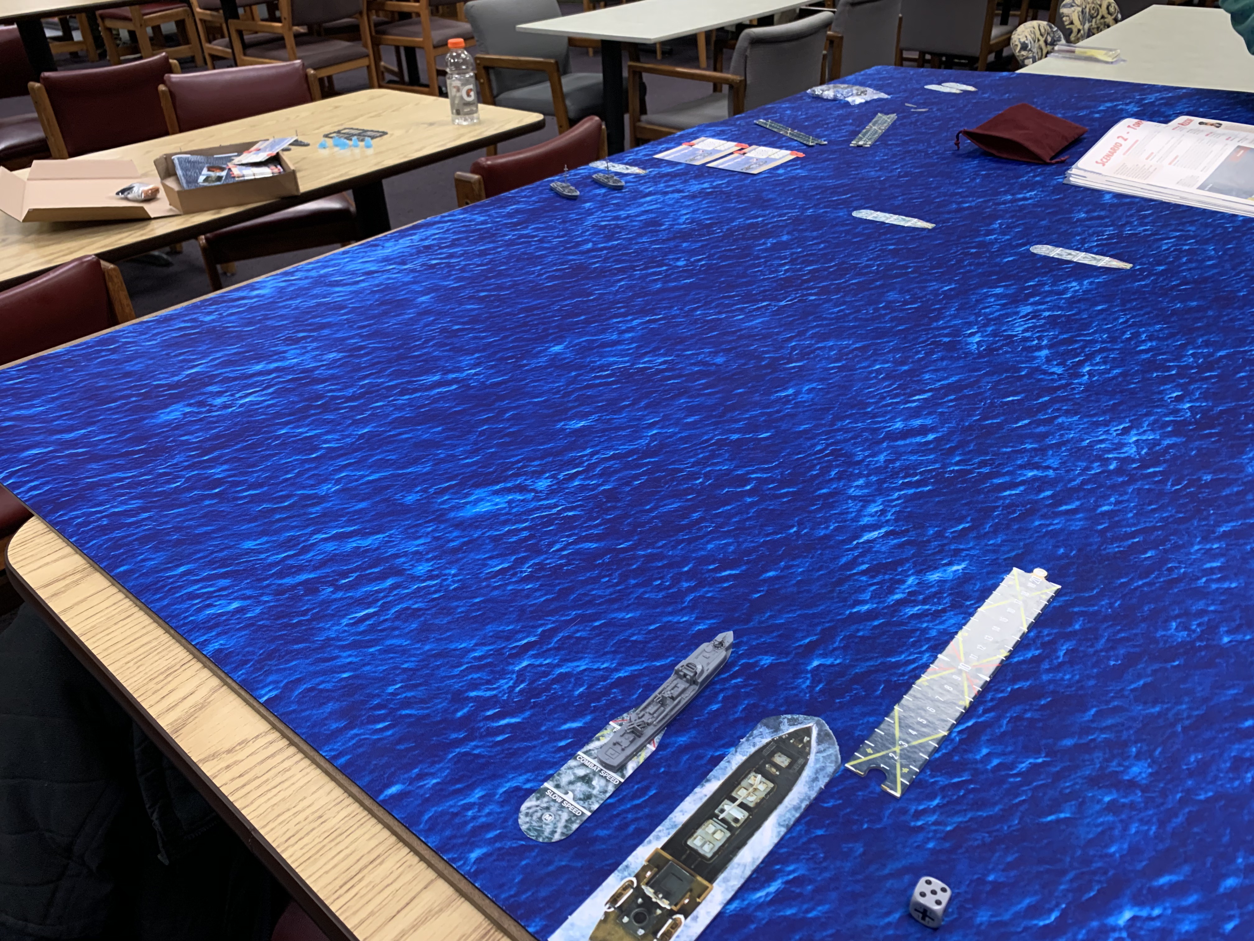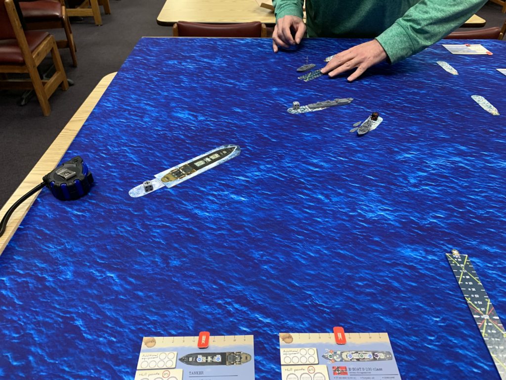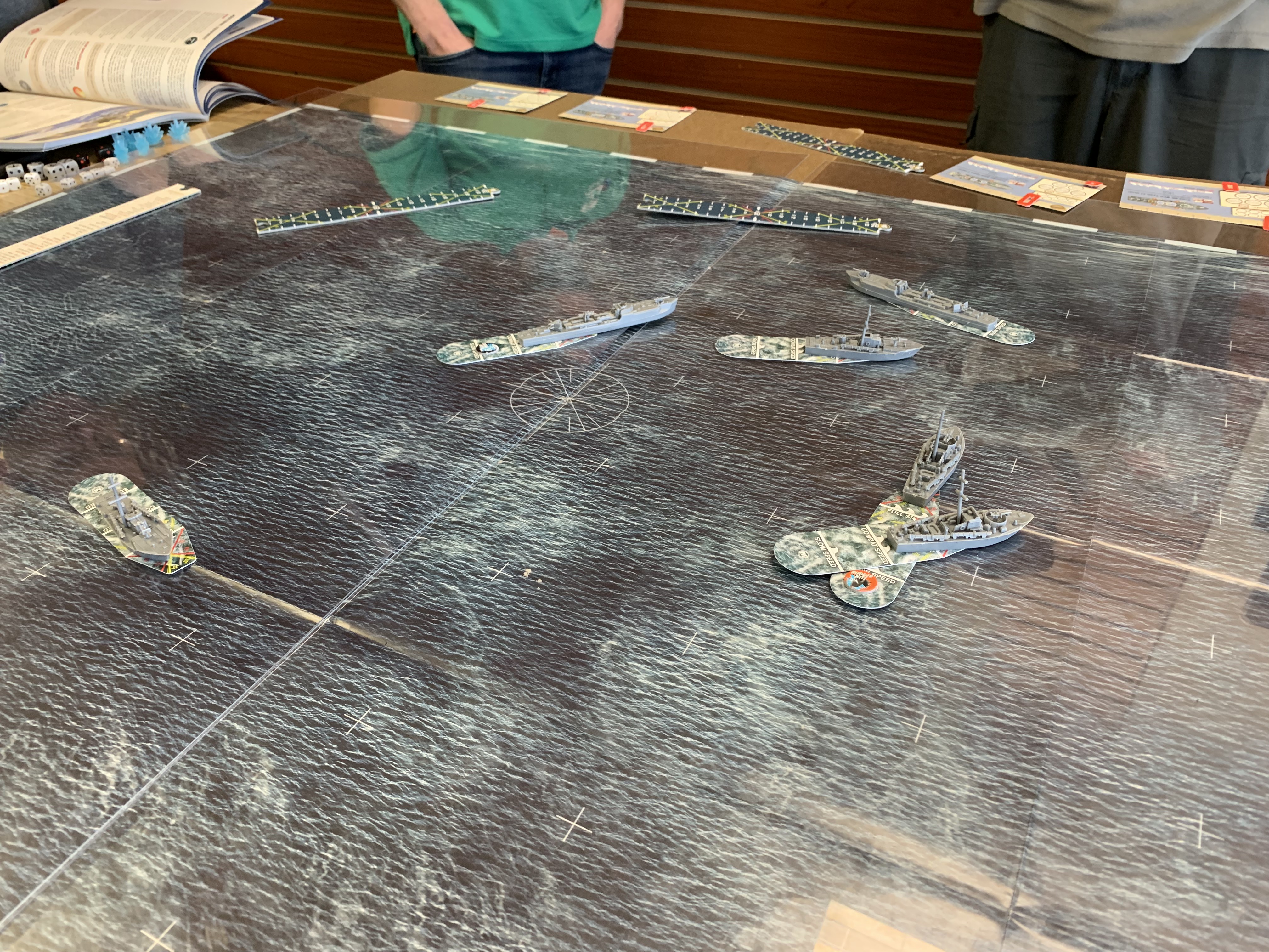 With torps in the water I steered direct into their path. Torps drop into the water at the end of activation for the boat firing them. Then when that boat activates the next turn they move 40 knots in a straight direction. You’re able to fire up to 30 degrees off the bow so you have some ability to compensate for your ability to pilot.
