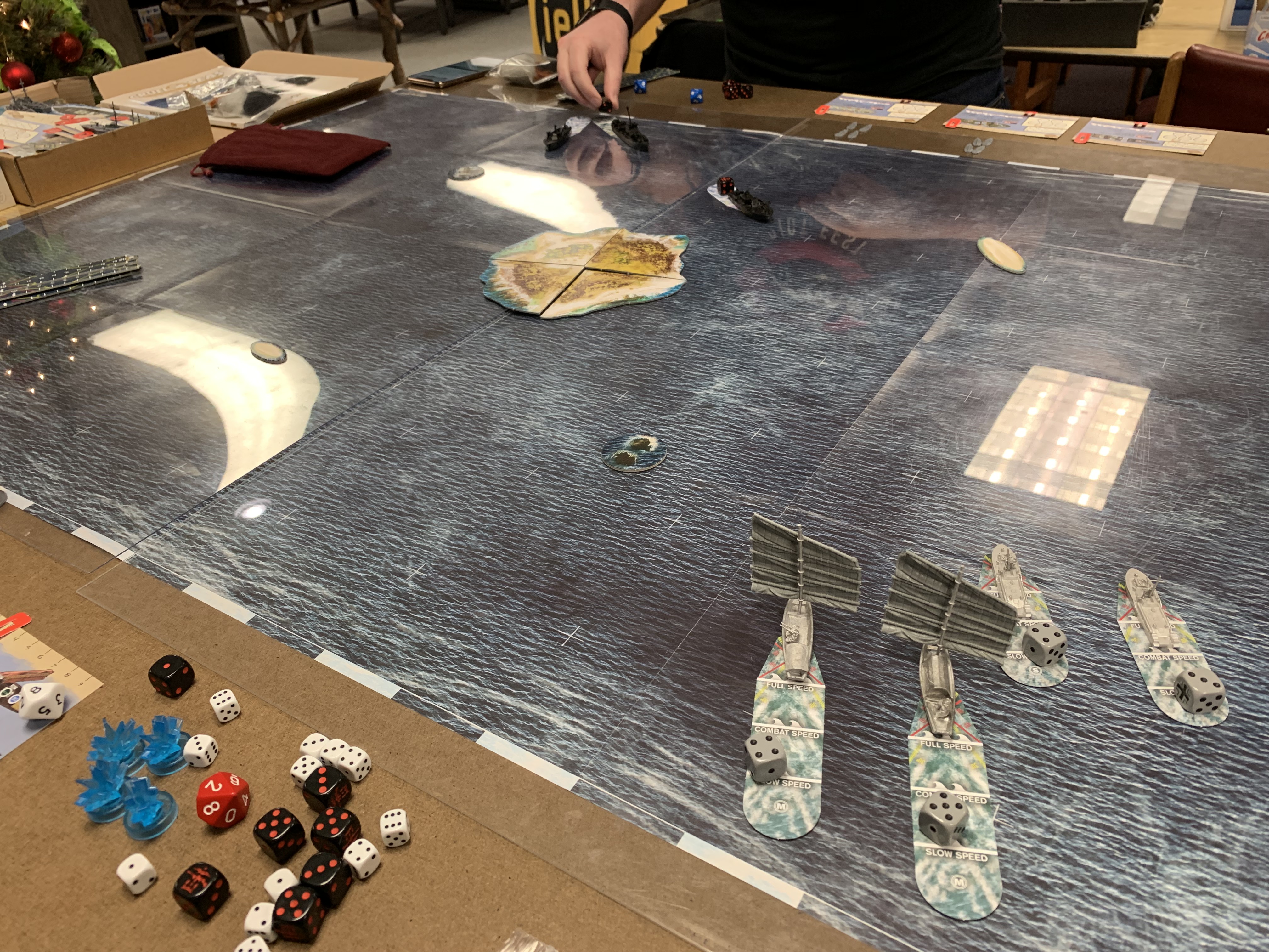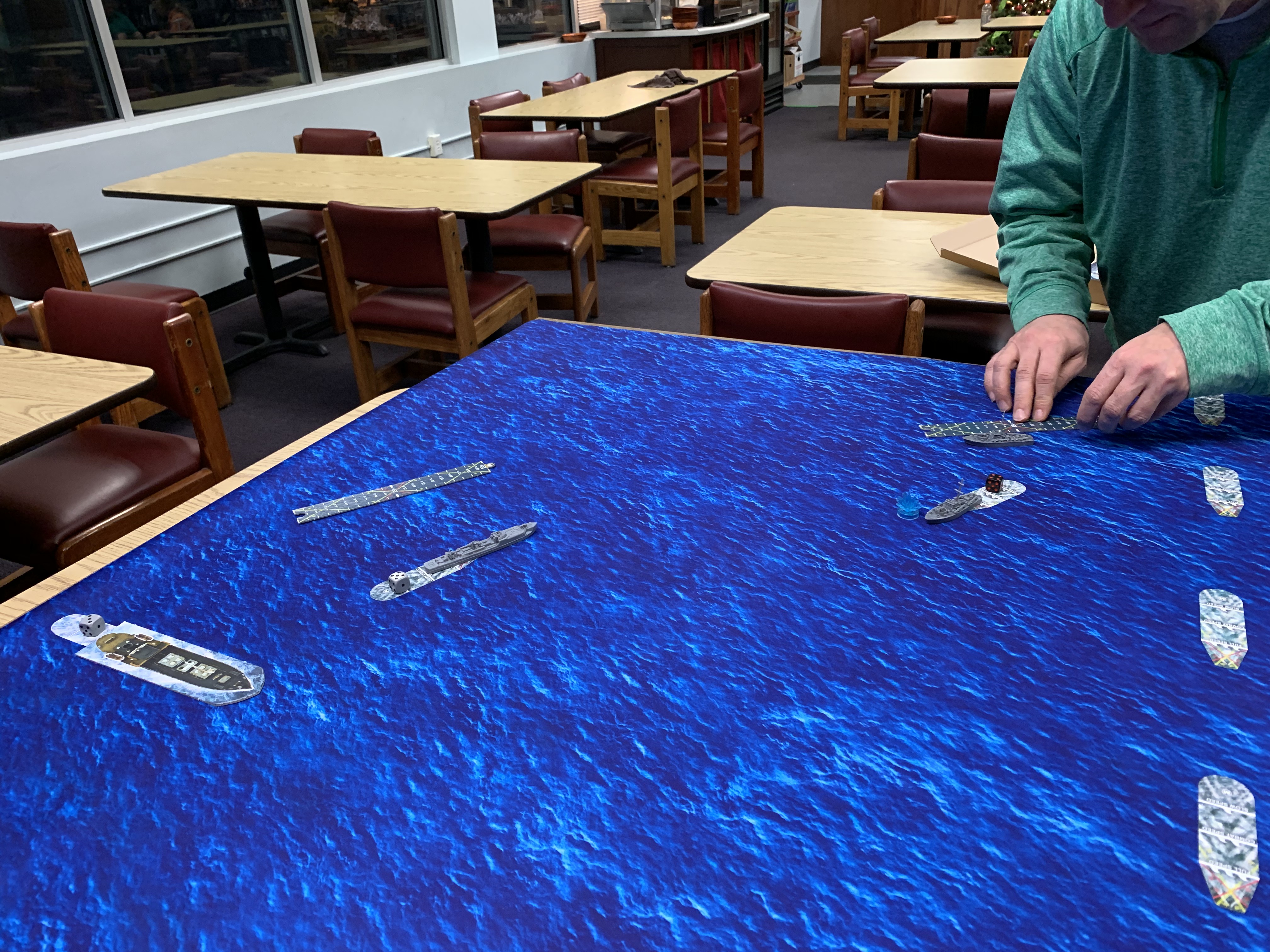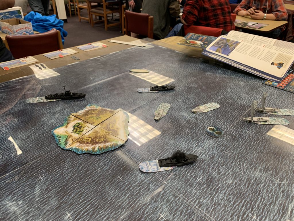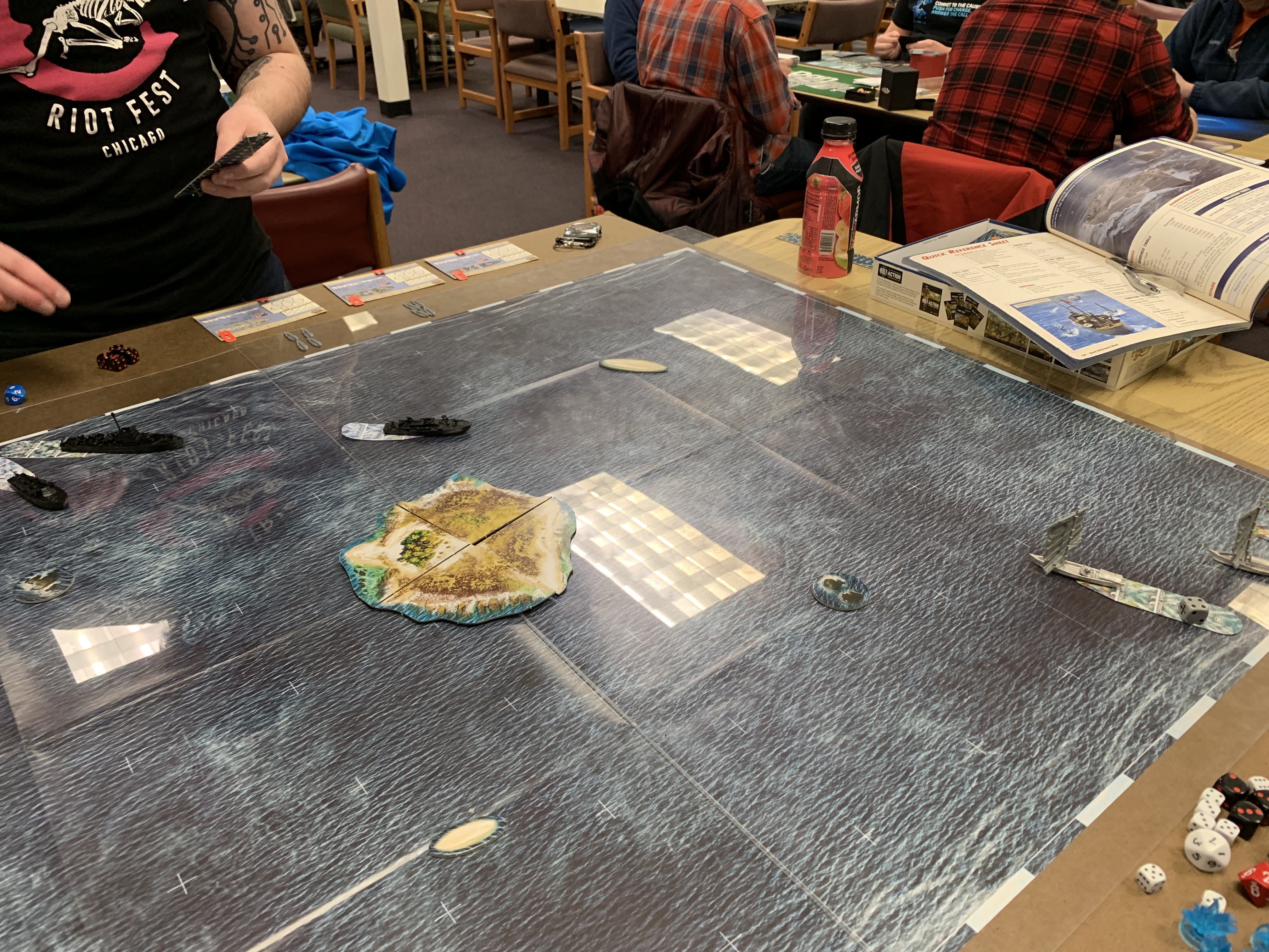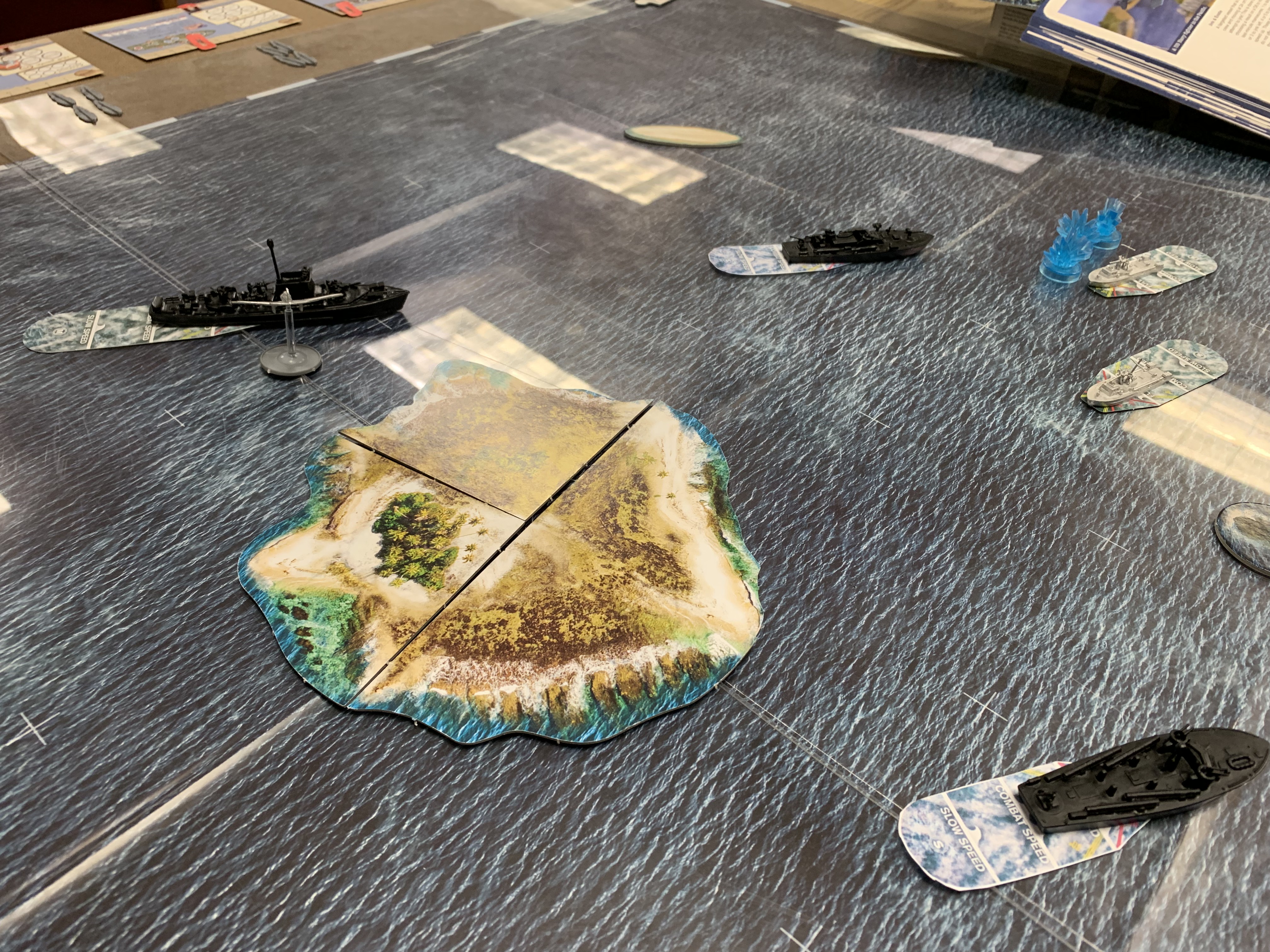 With torps in the water I steered direct into their path. Torps drop into the water at the end of activation for the boat firing them. Then when that boat activates the next turn they move 40 knots in a straight direction. You’re able to fire up to 30 degrees off the bow so you have some ability to compensate for your ability to pilot.