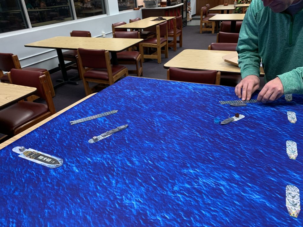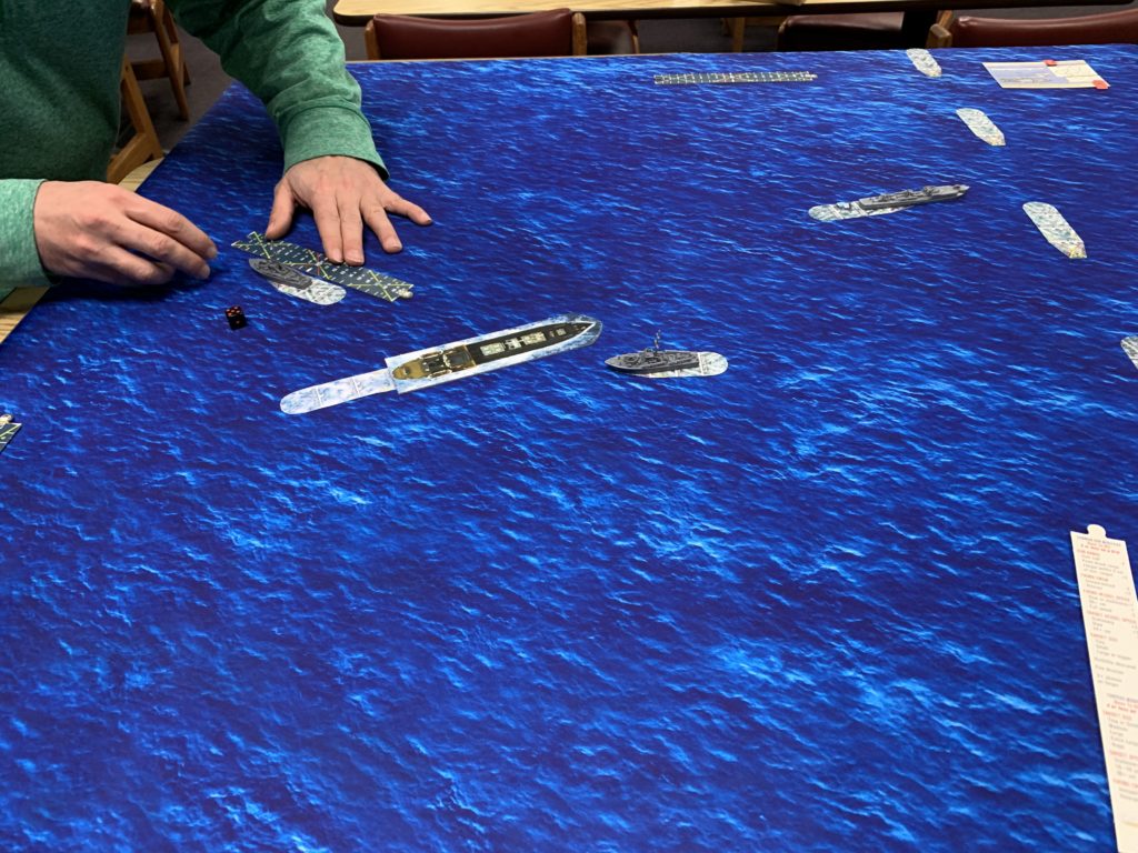 We pulled out my 4×6 mat and cut down the space. The freighter does not have all that great of a speed, 15 knots top so I had my work cut out for me as the Vospers were assured a torpedo run or two. I figured my S-Boat would have to concentrate fire on a single Vosper and go for sinking one in hopes of then being able to deal with the other.