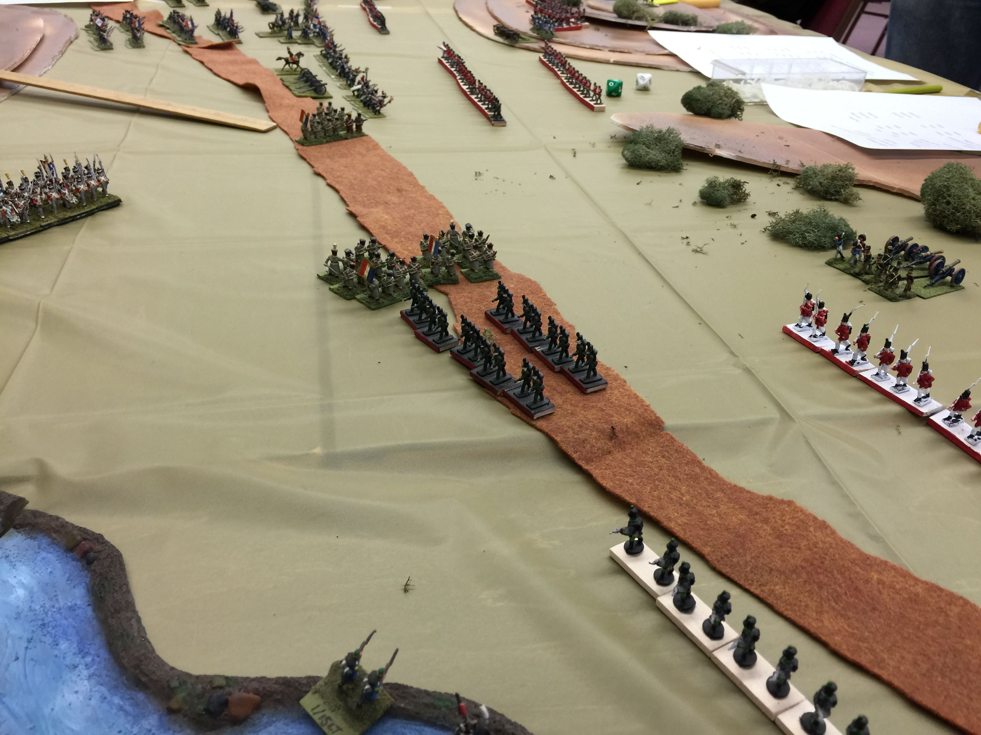 We played from right to left as of course all the students were new to the rules. Here the Brits came forward to give battle, one division of Brits vs 2 of French. Note the gap in the British line. Two battalions of the 95th Rifles are involved and certainly the quality of the British across the line was generally better than the French so nothing bad will come of that right? 🙂