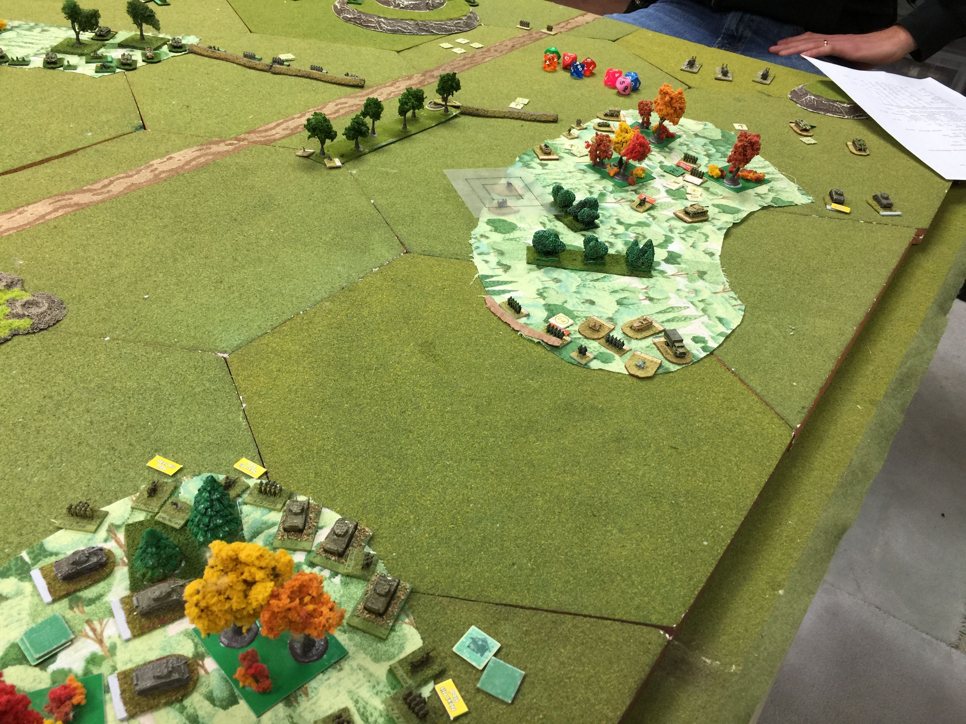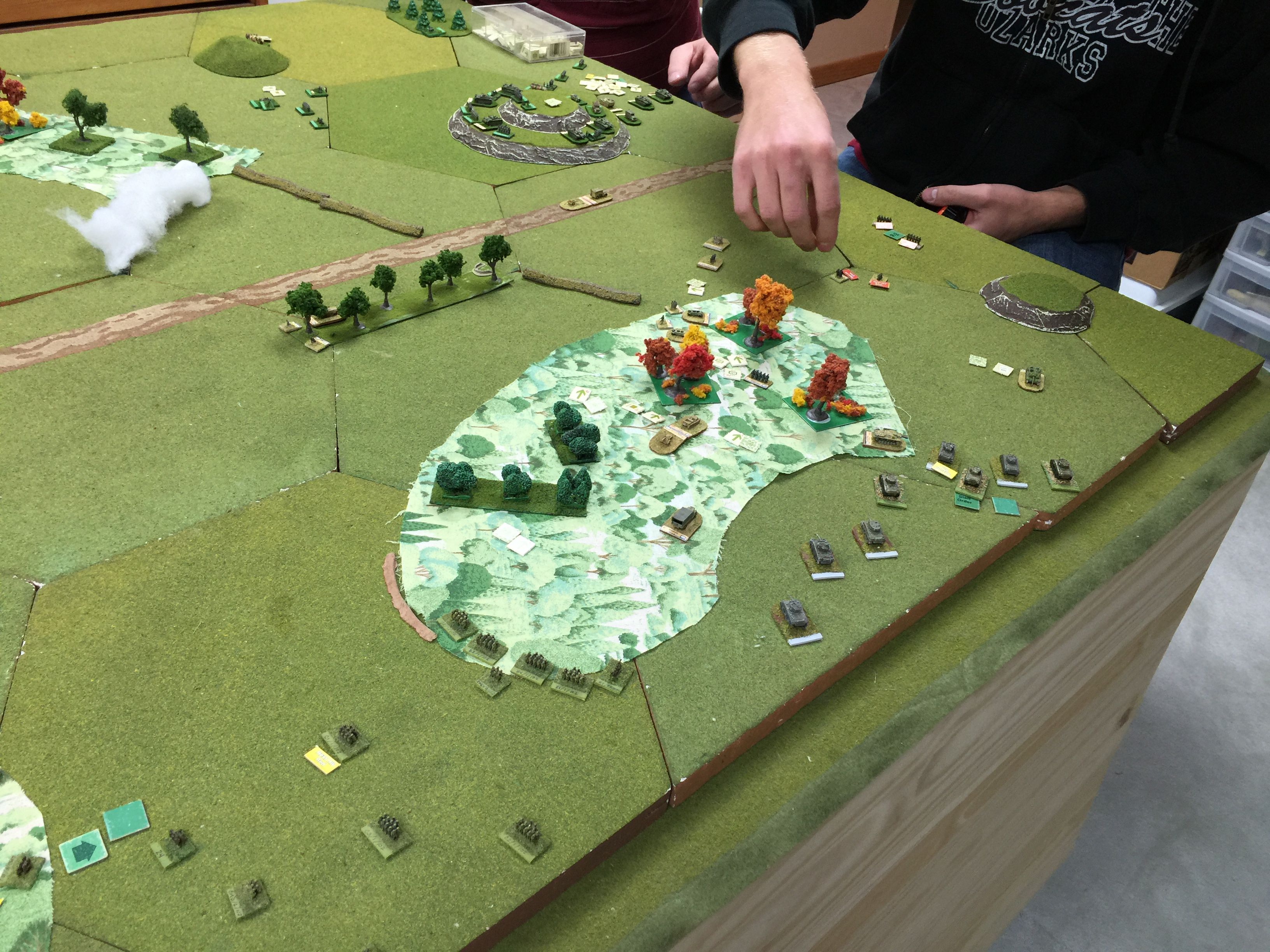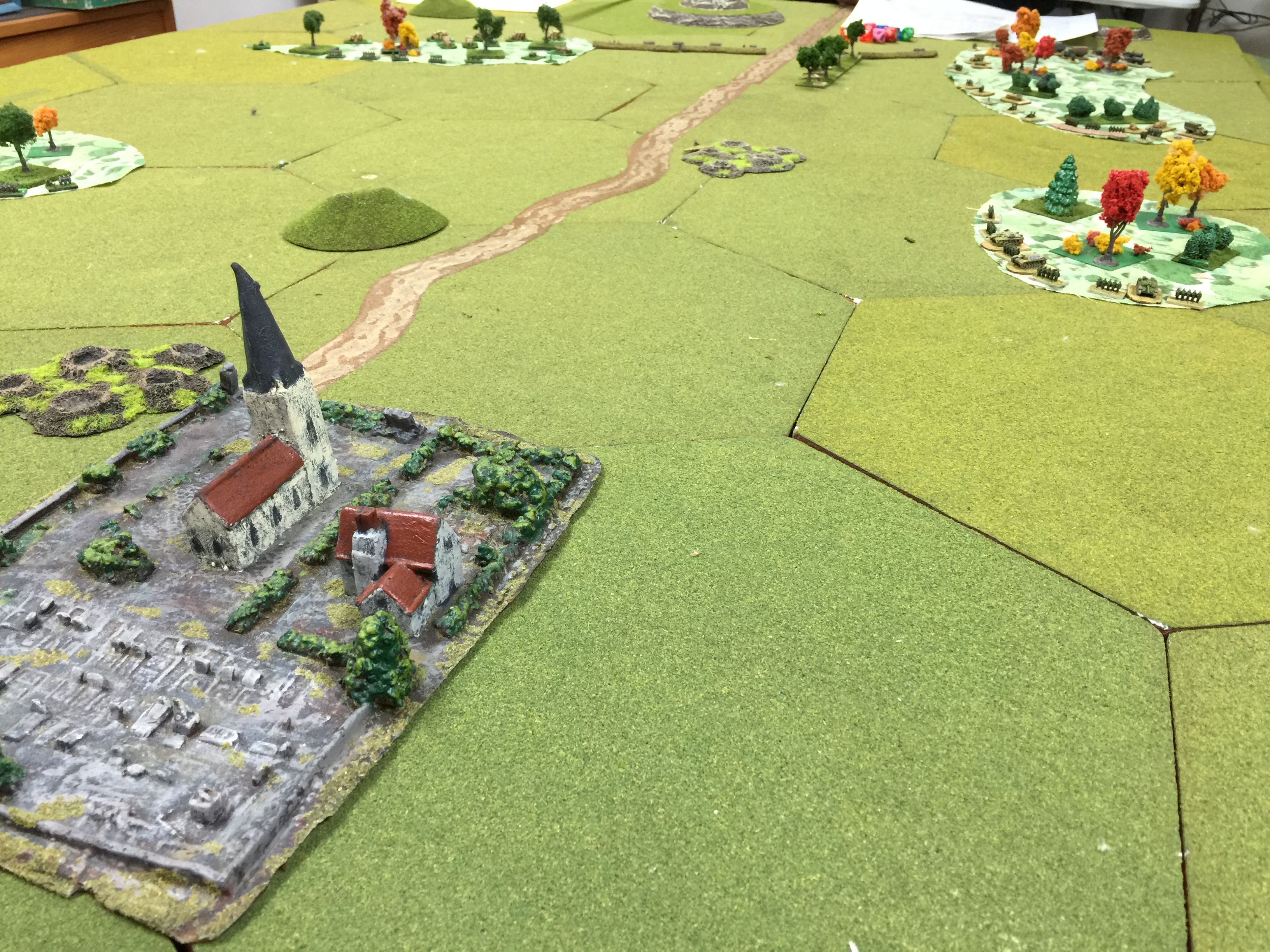 This is the view from our end of the table and the identified route of our offensive. Chuck and I figured we’d pick one side of the road and push away. We liked the shorter distances between the two woods on this right side and as Chuck put it, “looks to be more tank friendly.”