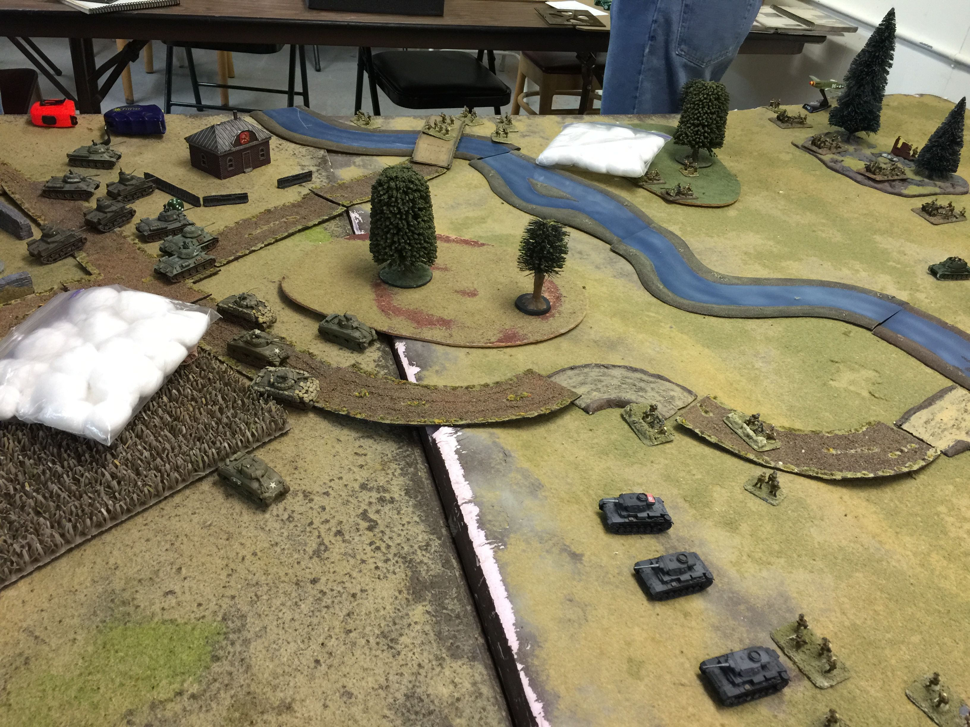 In the center of the table I moved up my IIIMs as far as I dared. I figured they would be easily outclassed by the American Shermans. With us overloading on the left flank I figured I just needed to hold in the center. Bill faced a choice of hold or move forward on the right. A hard choice to be sure given what was on the other side of the river!