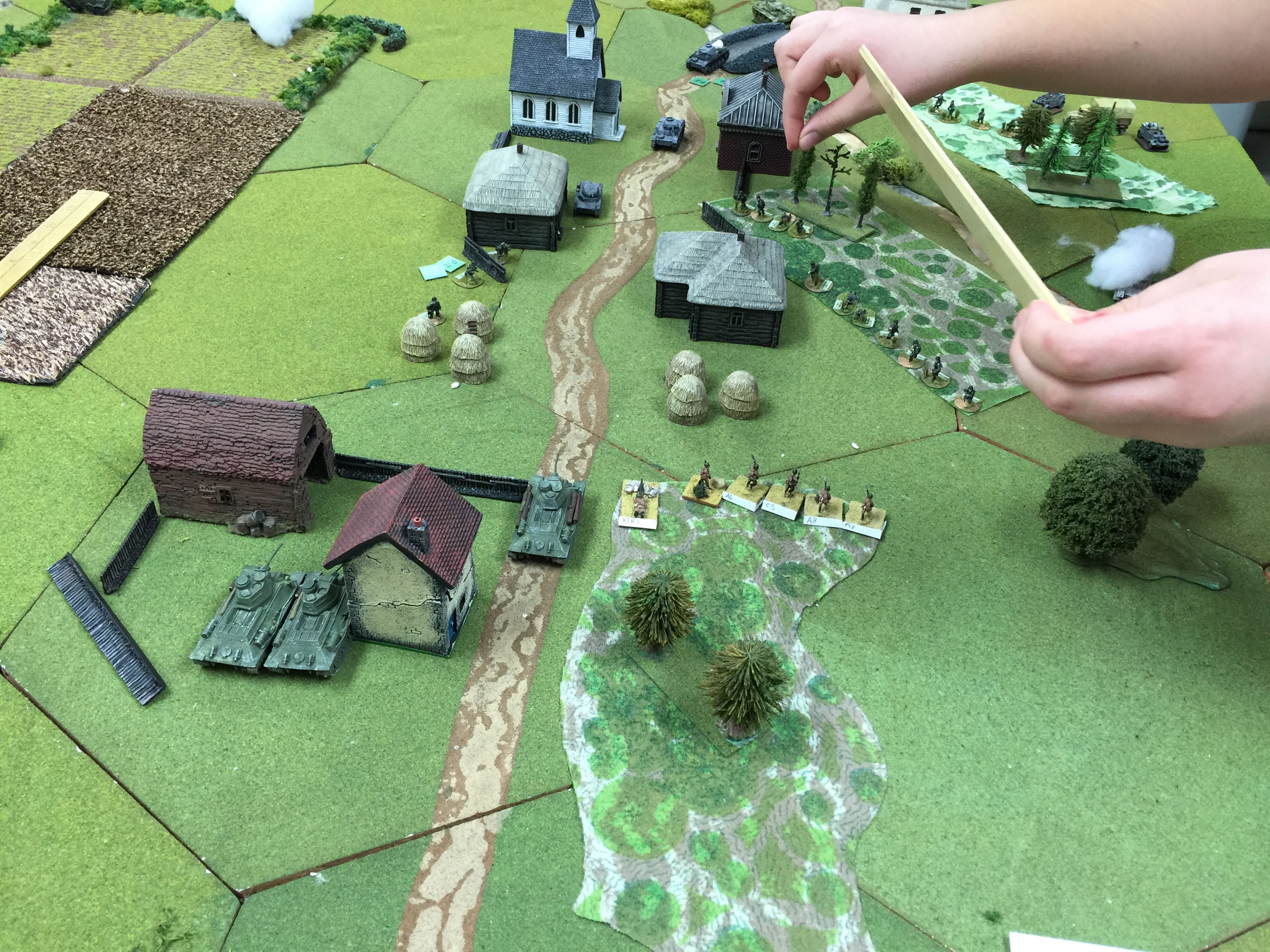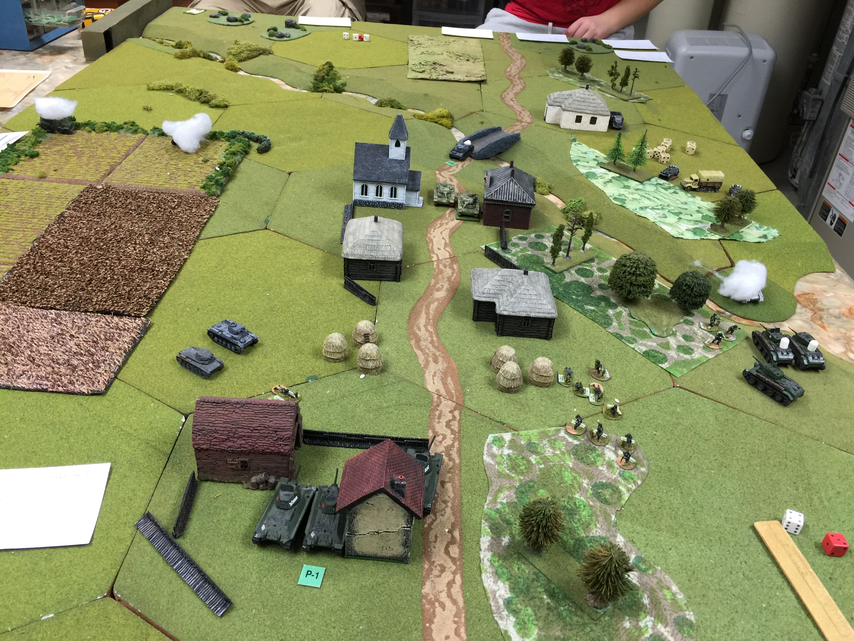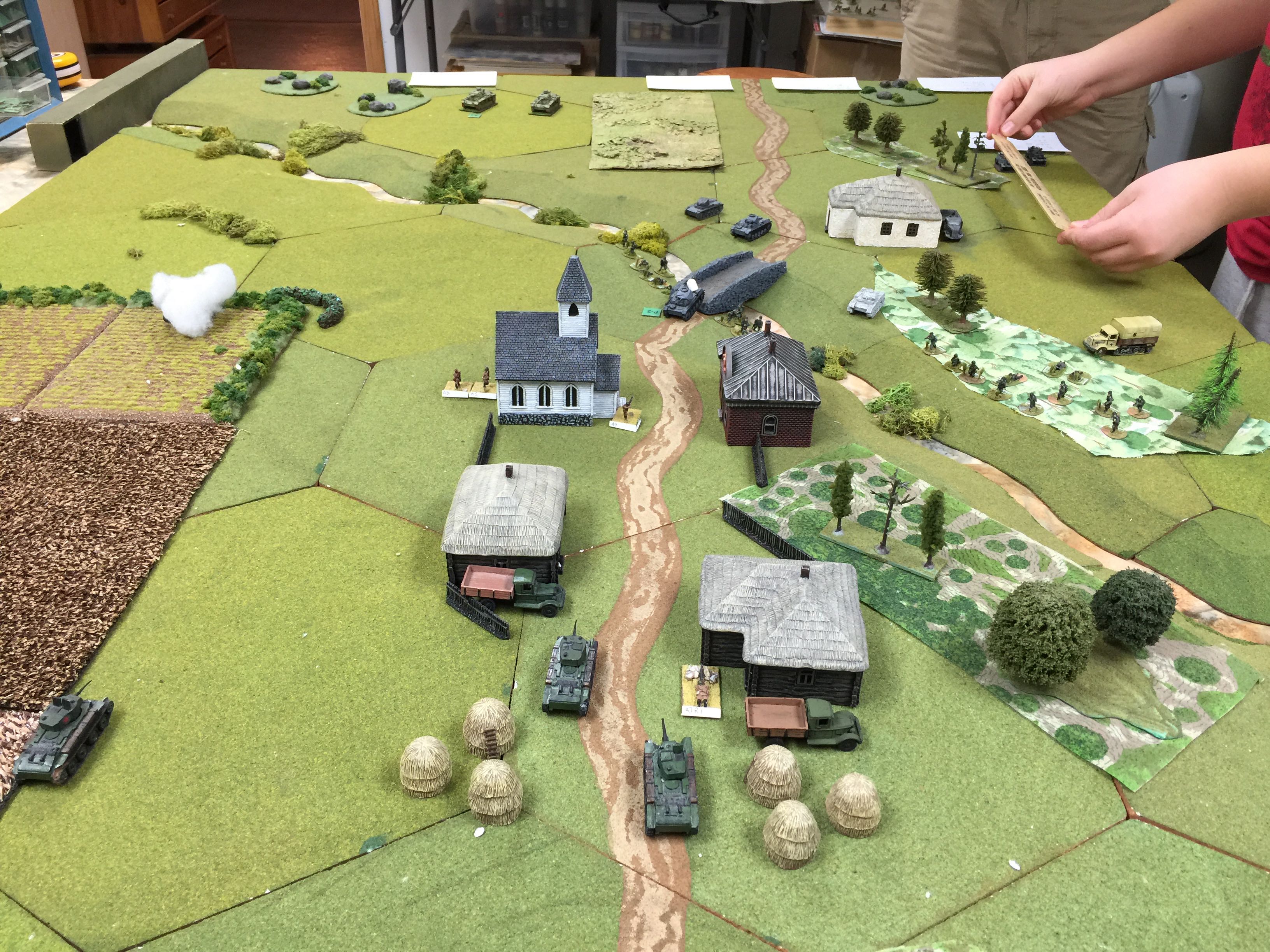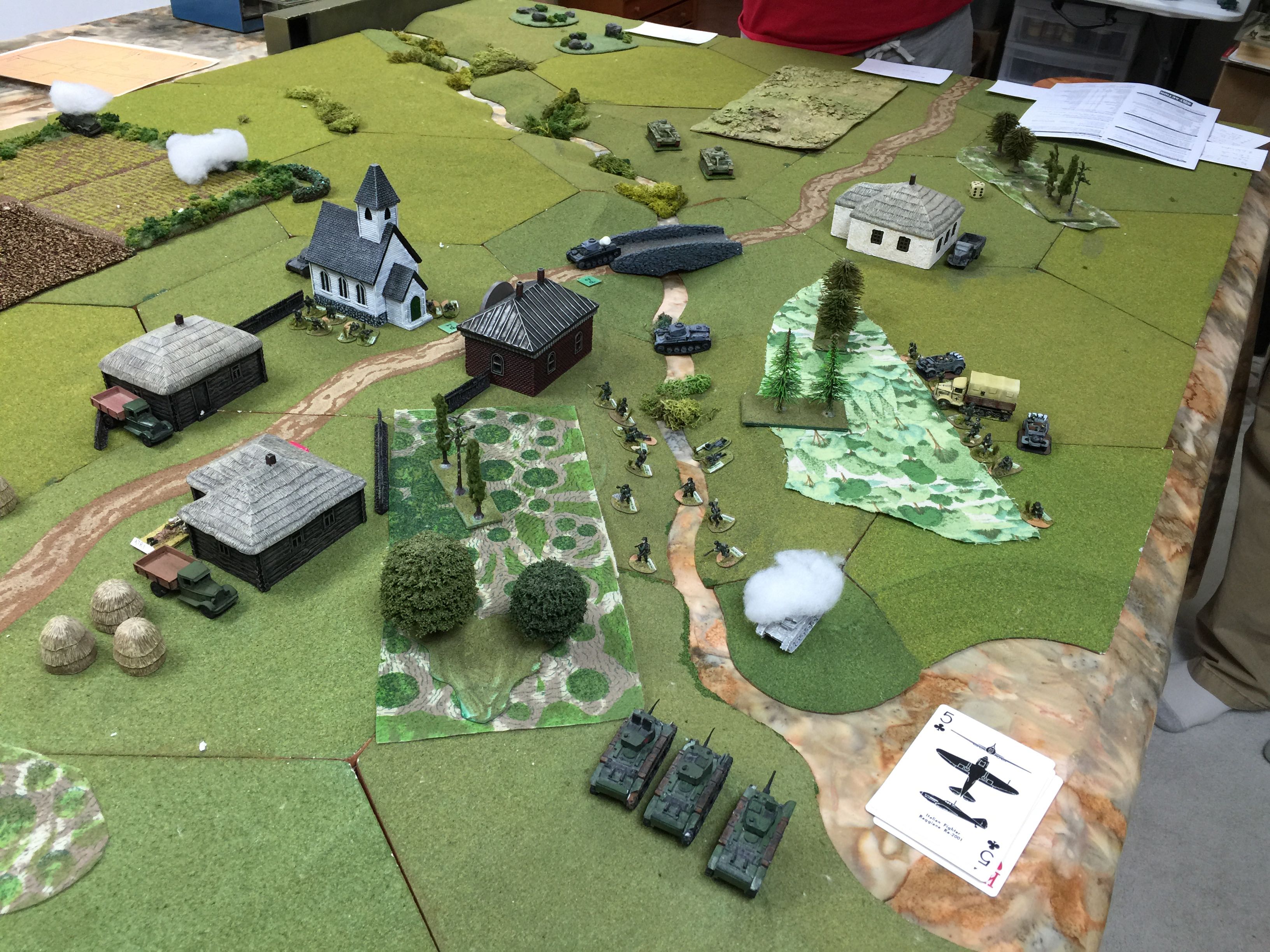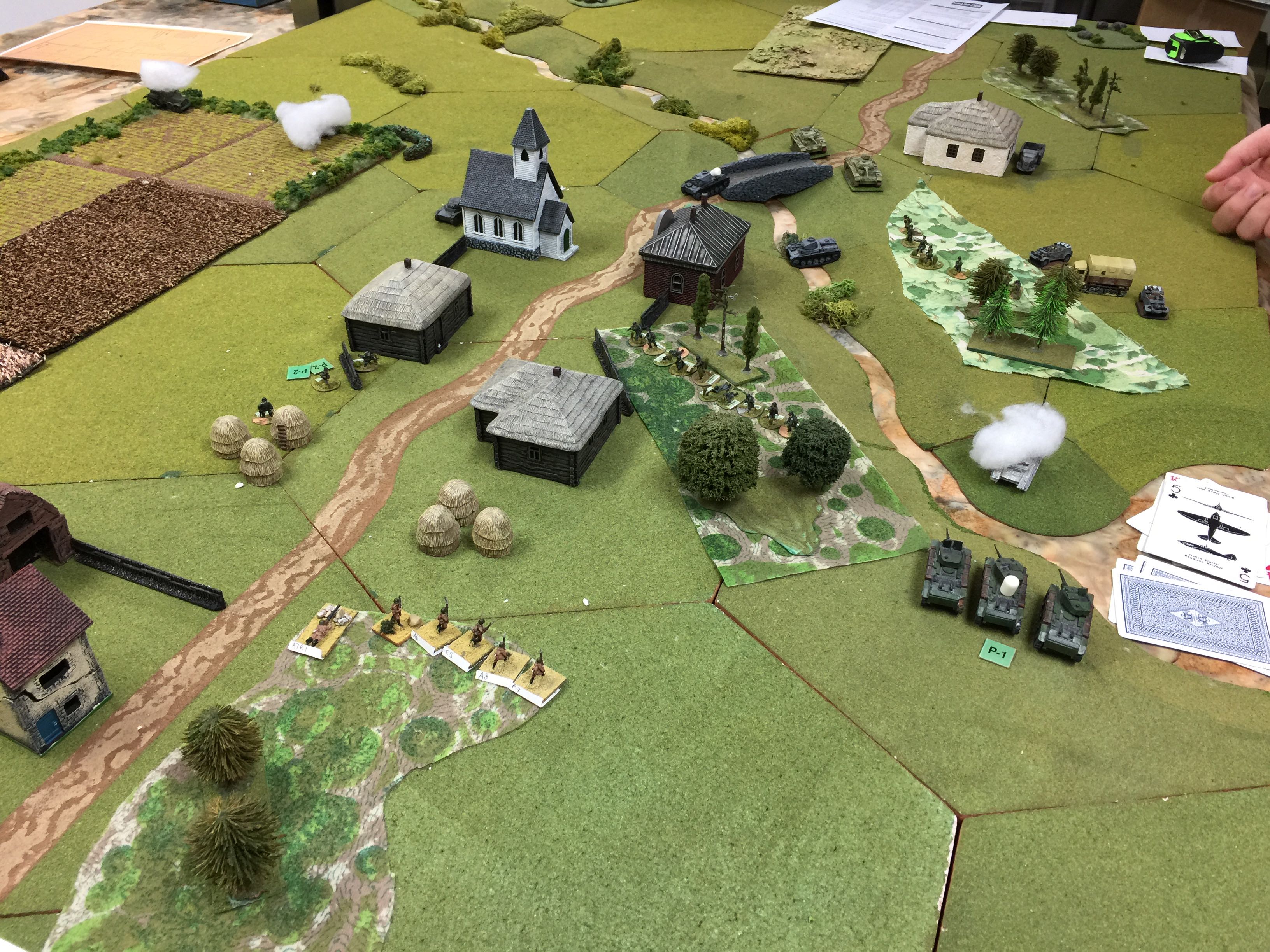 The other Pz IIc you can’t see as it’s on the other side of the river obscured by the buildings and under the smoke right by the cards is a brewed up Pz IIc, the victim of decent BT7 shooting and about the last of the good shooting by the Russians as we were about to be rained on with pin markers.