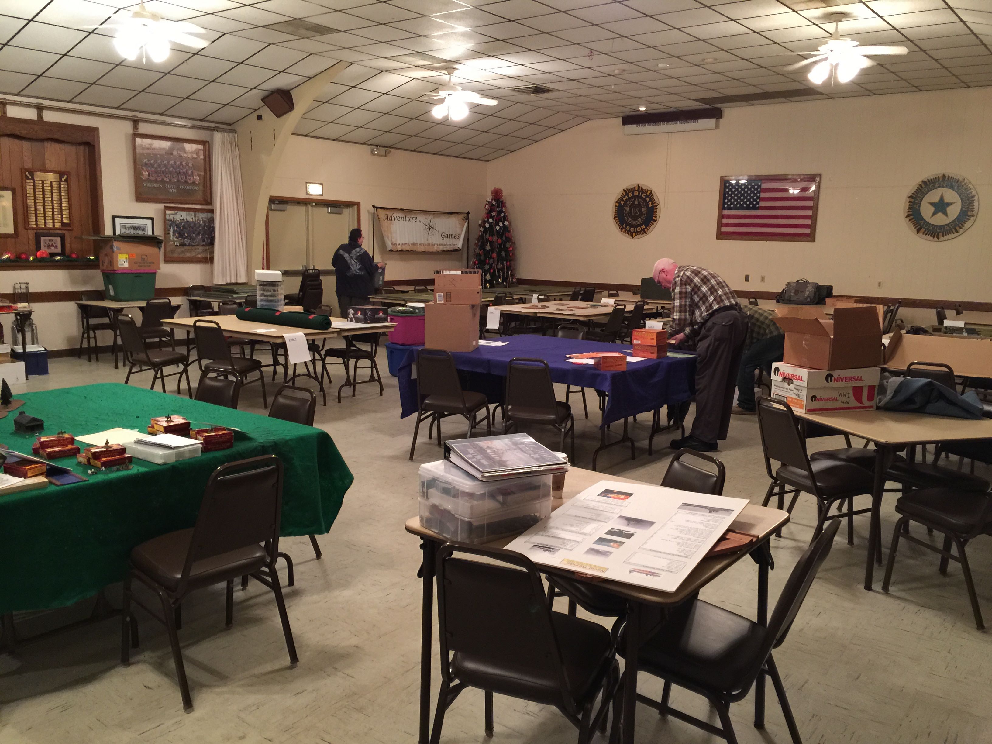 Bright and early Saturday morning, Chuck and I arrived. Last year I had been in this same spot for a refight of Gettysburg using Johnny Reb III. The Legion Hall is a great locale (tho a bit dark!) with onsite food and plenty of space. For all the tables running and all the people there it was a perfect venue.