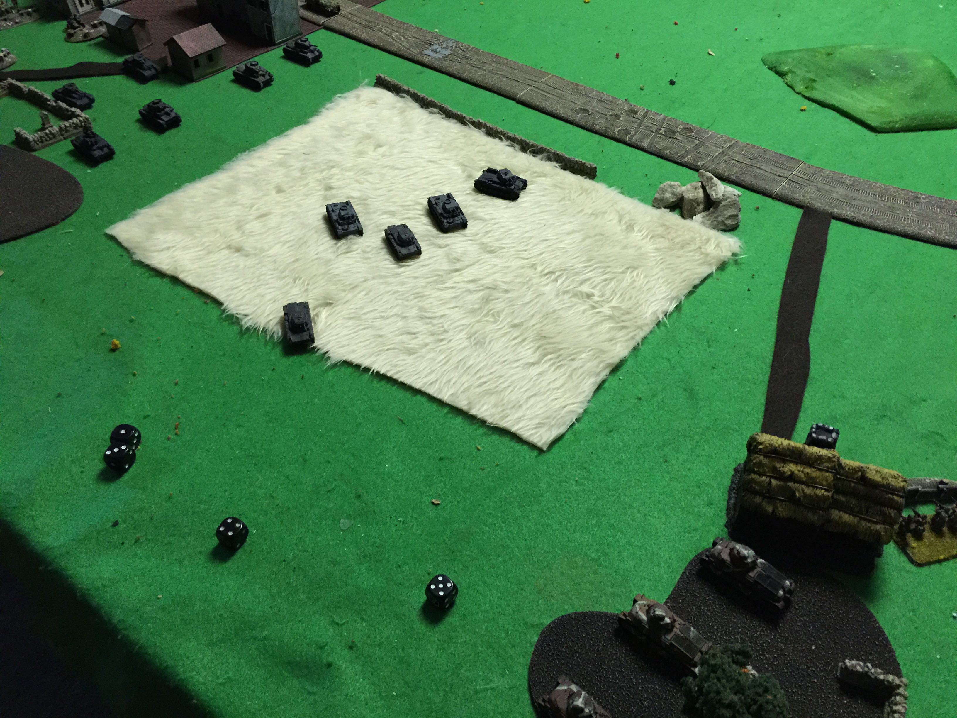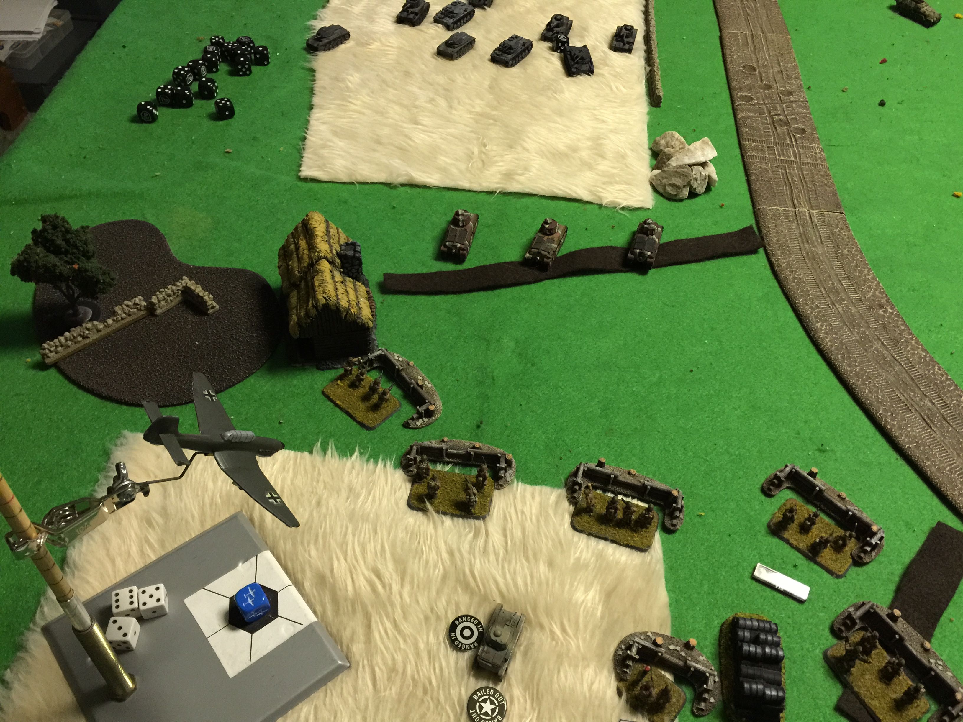 With air and artillery aiming for my infantry I lucked out with a hit on my company command tank since the Stuka scored a hit on him, I failed my armor save and then Ian rolled for his 2+ firepower roll and got a 1. Whew!
