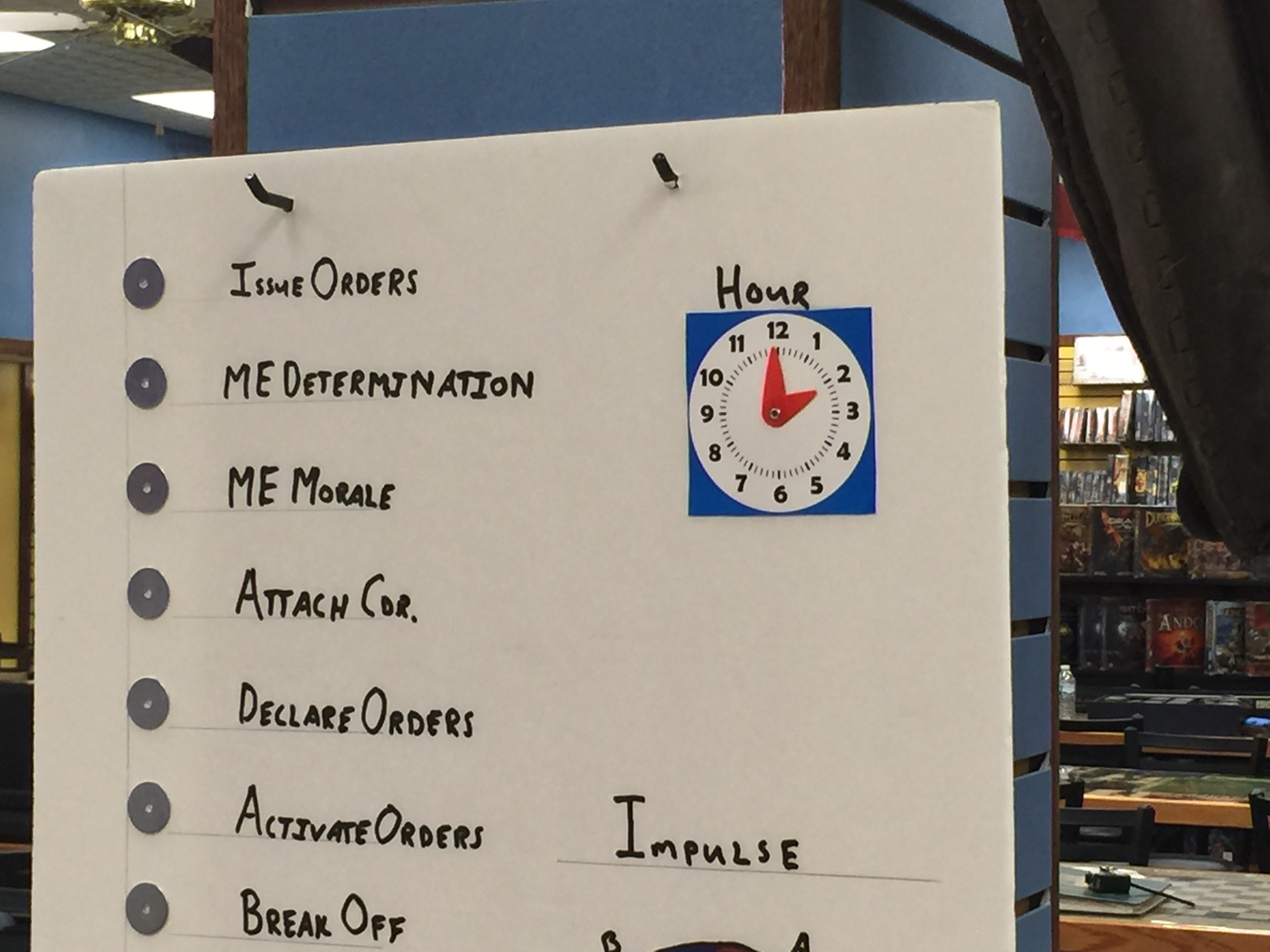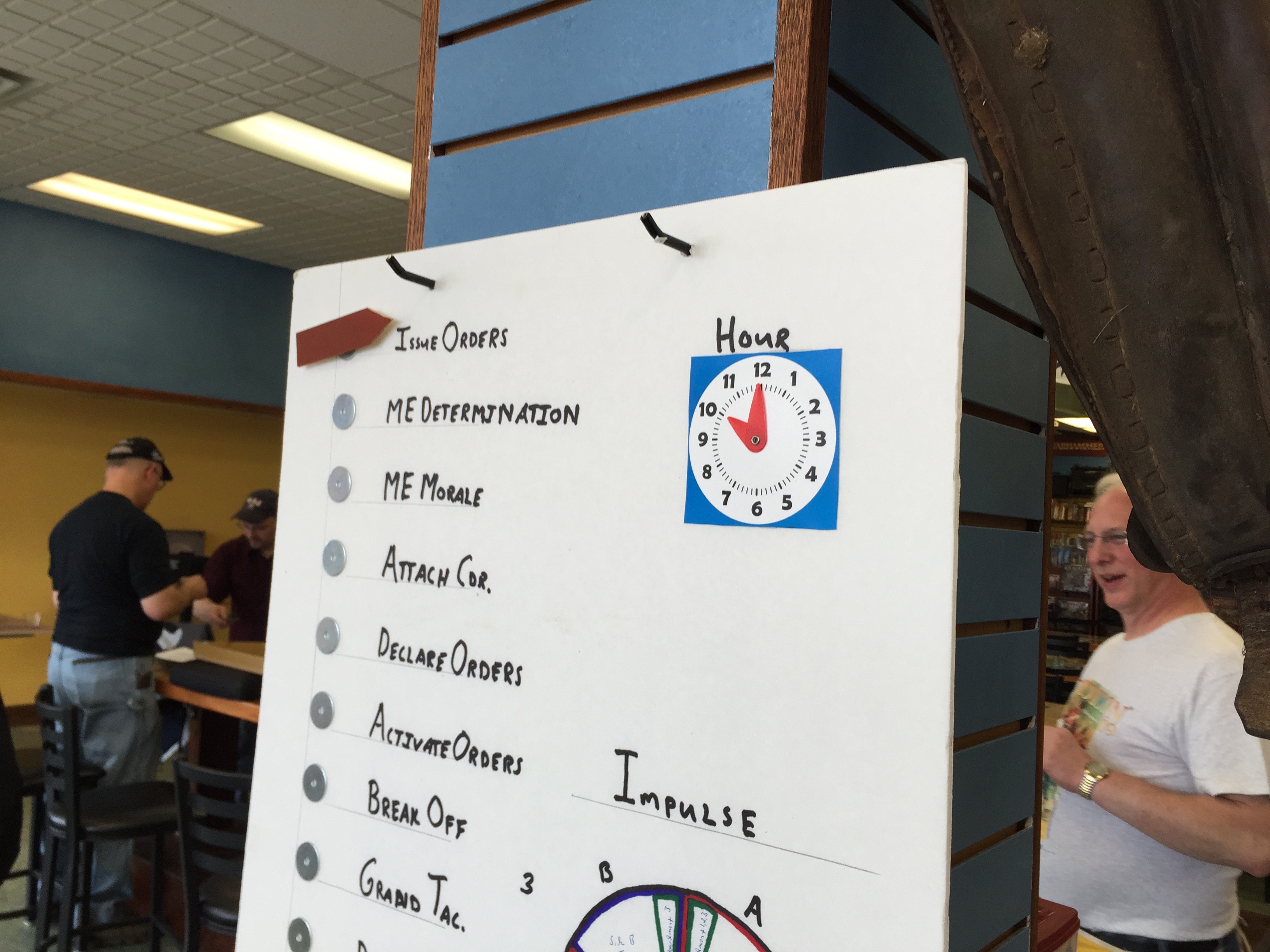 We had these great markers for keeping track of where we were in the game. Not sure who made them, (Dan?) but they were great. As you can see the bombardment from the grand battery was at the 10am hour.