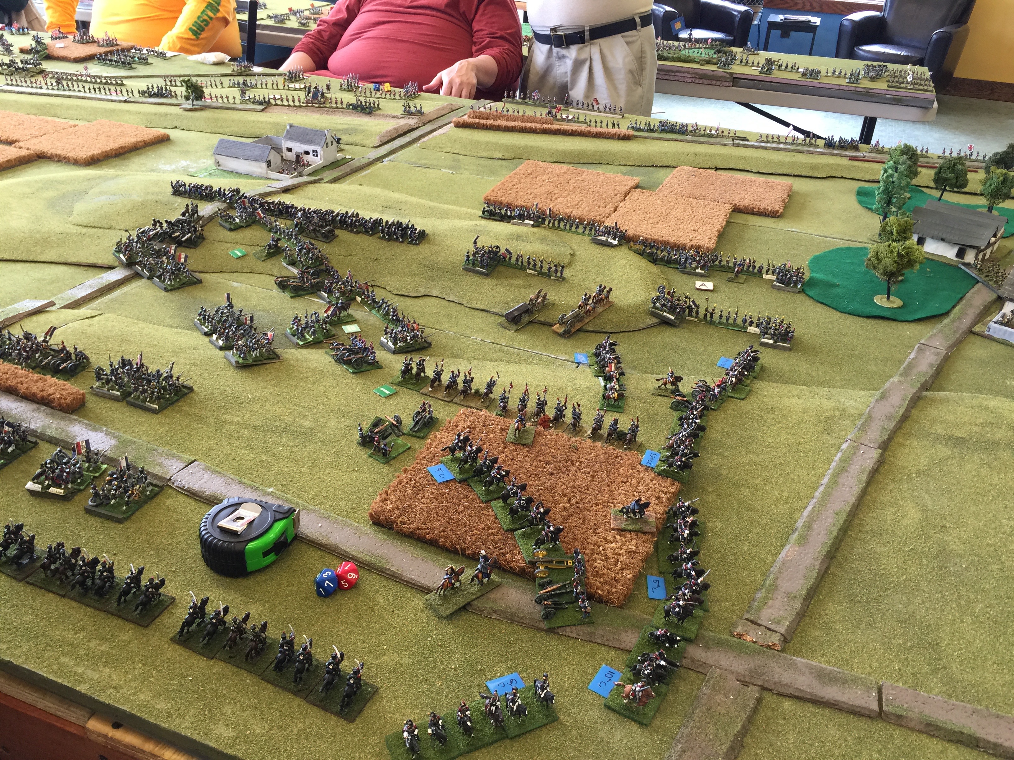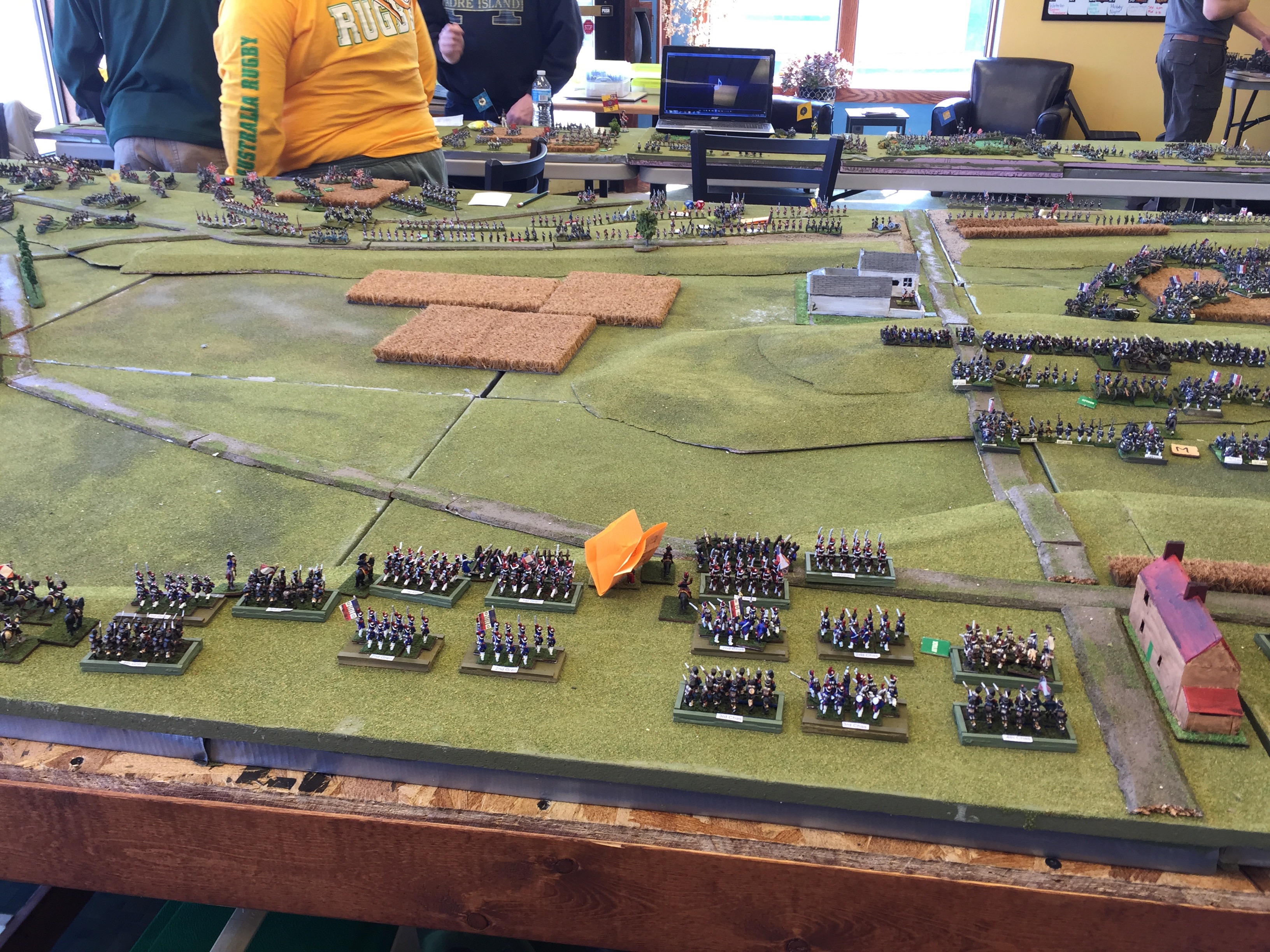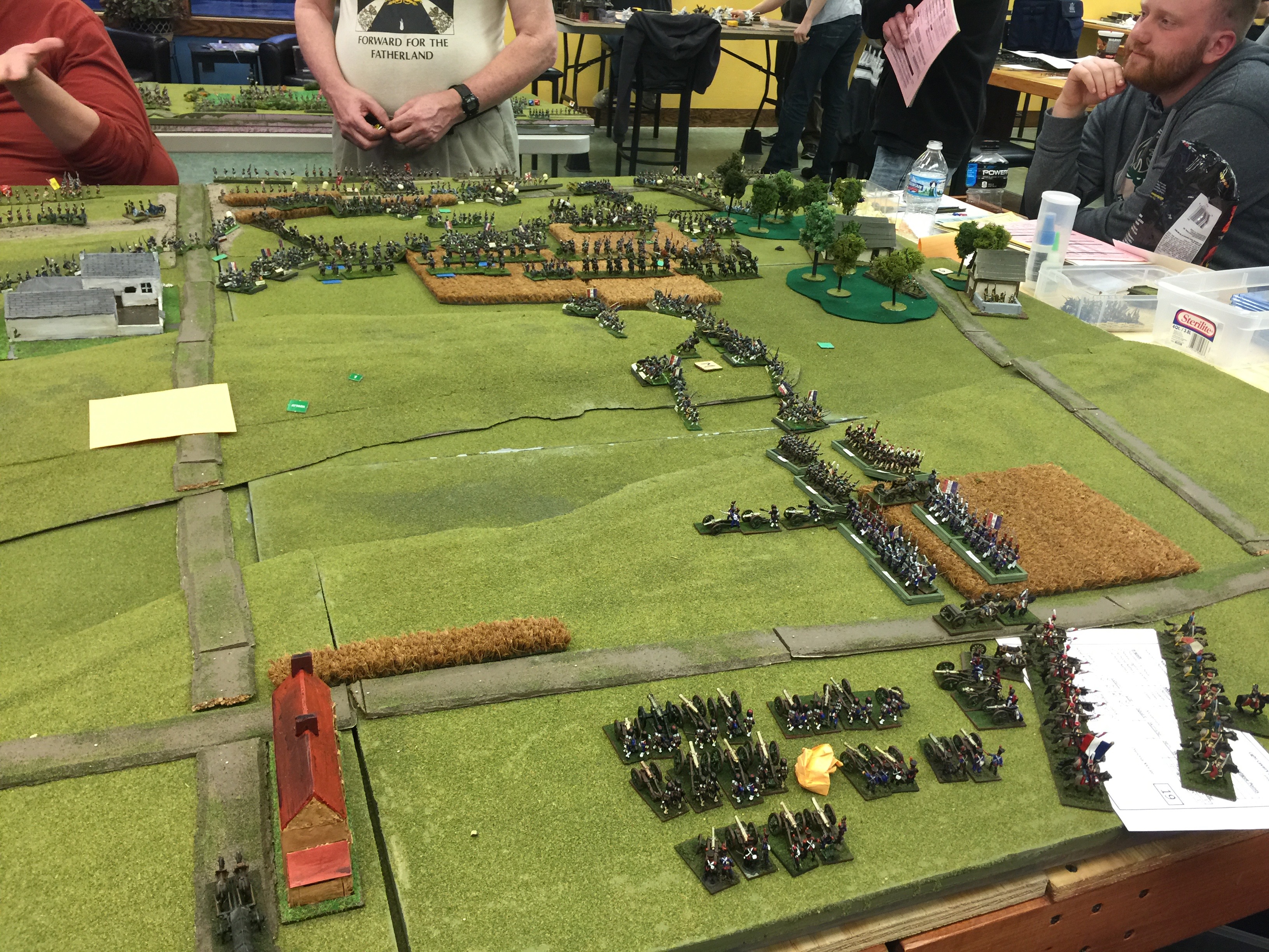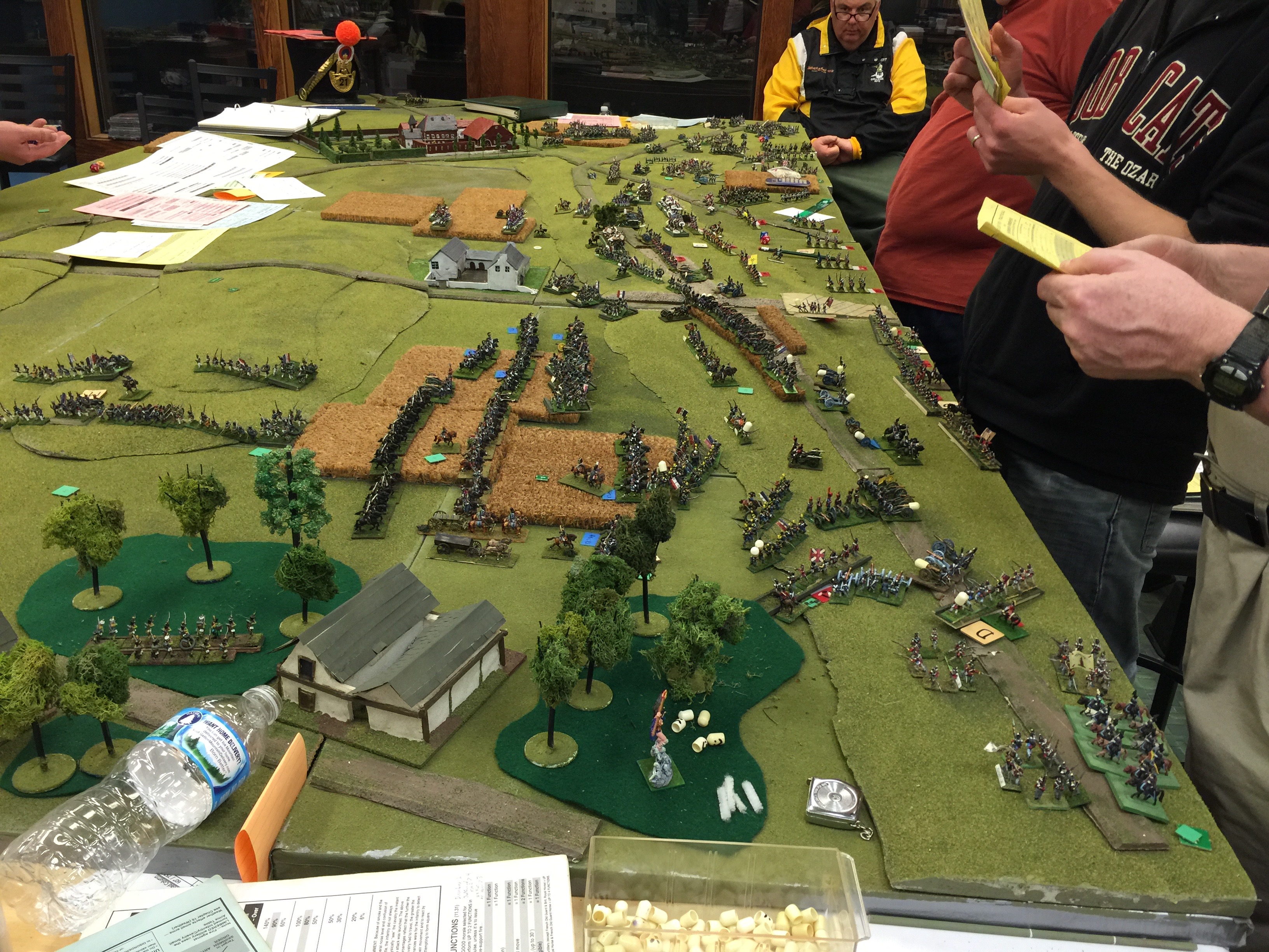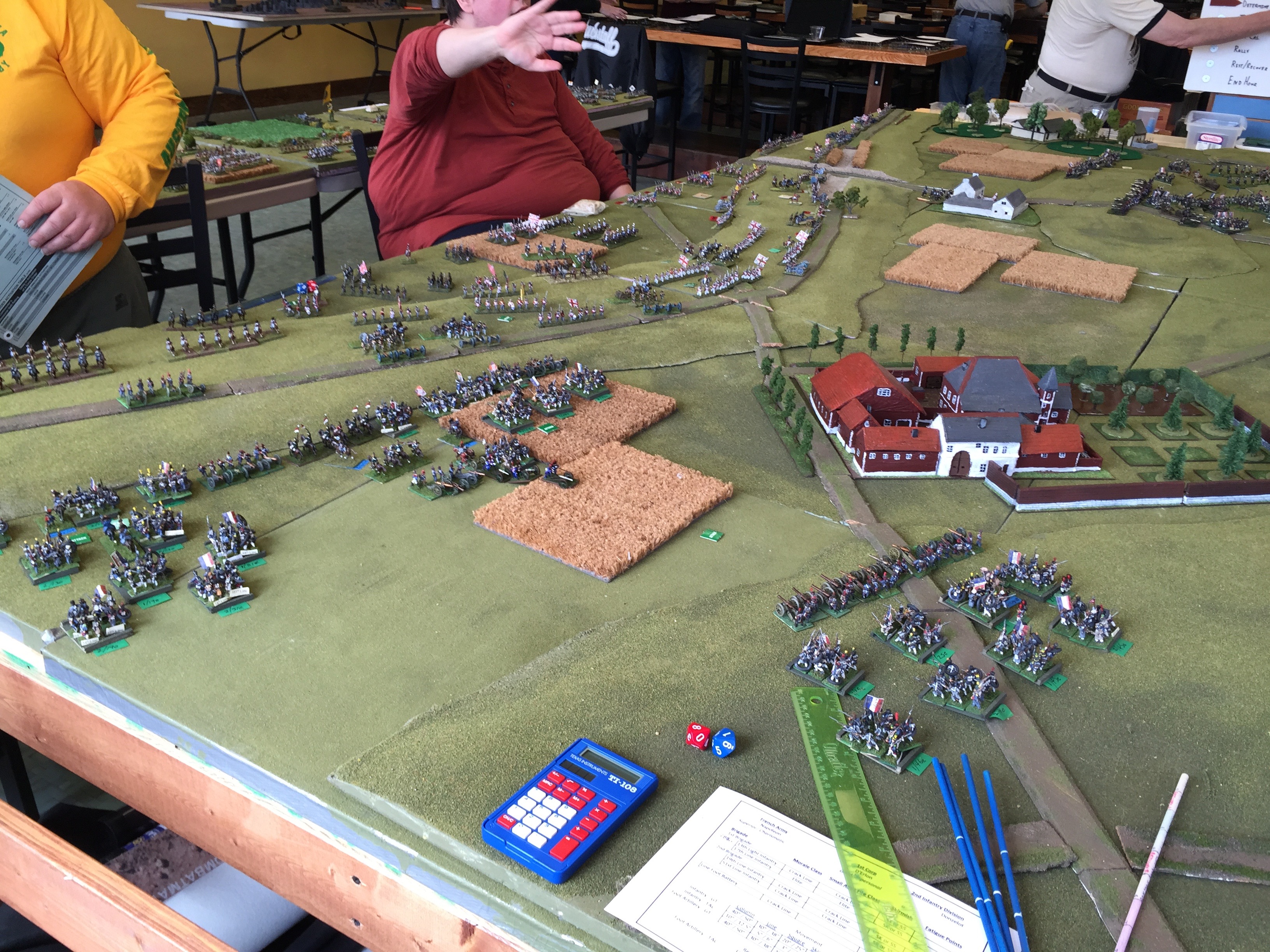 Here we’re oogling what will be but 1 of 3 tables setup for the game. Both on the left and on the right were yet another table (tho not quite as wide) to give depth to the game. On the left in the foreground is Dan Wideman who was serving as Wellington. On the right in the picture Michael Mathews who commanded the 1 Corps and Ney. On the table the closest built up area of course is Hougoumont which was scratch built. Off in the distance the white is la Haye Sainte and way on the table edge on the far end is la Haye/Saxe Weimar/Papelotte.