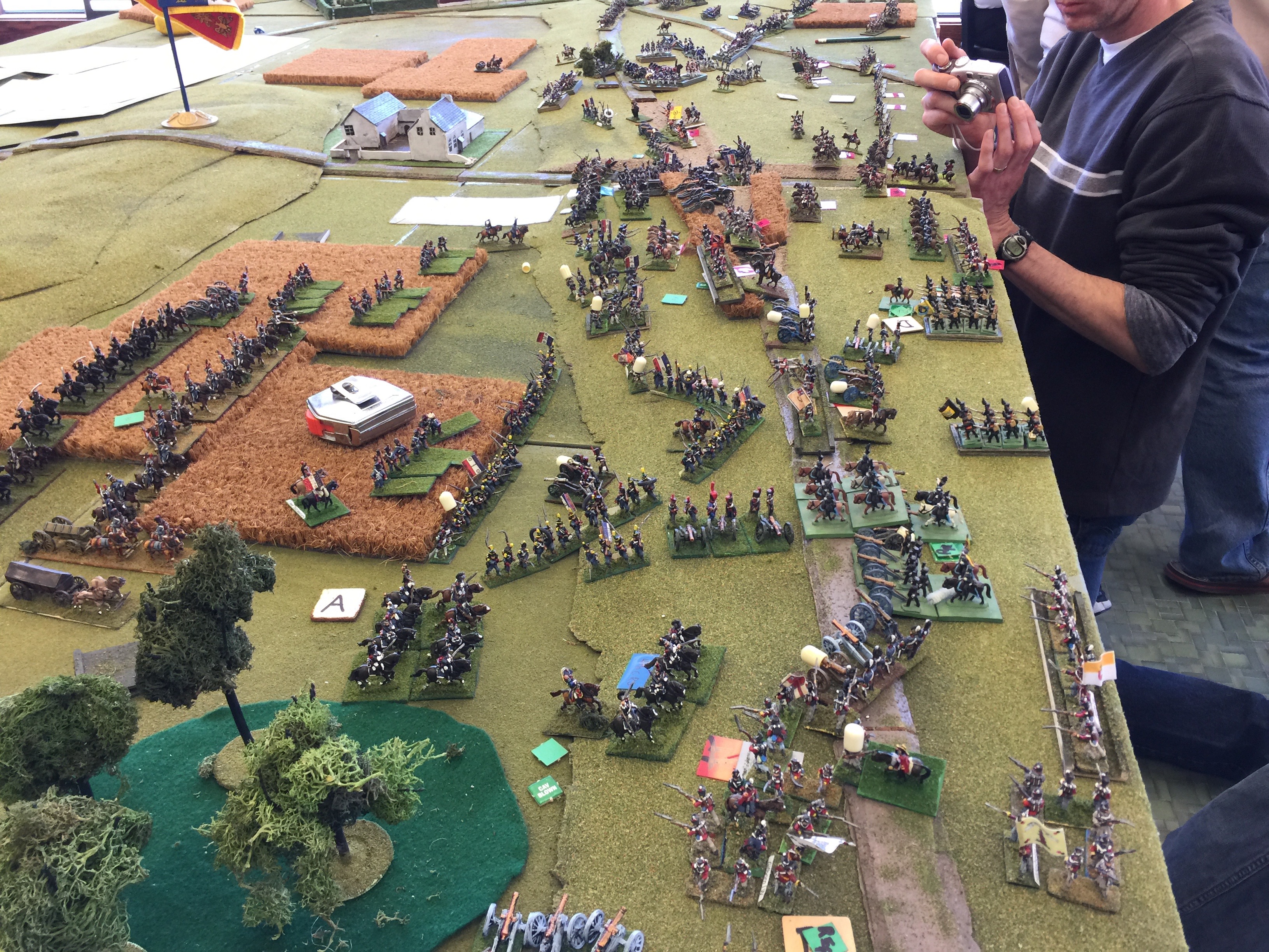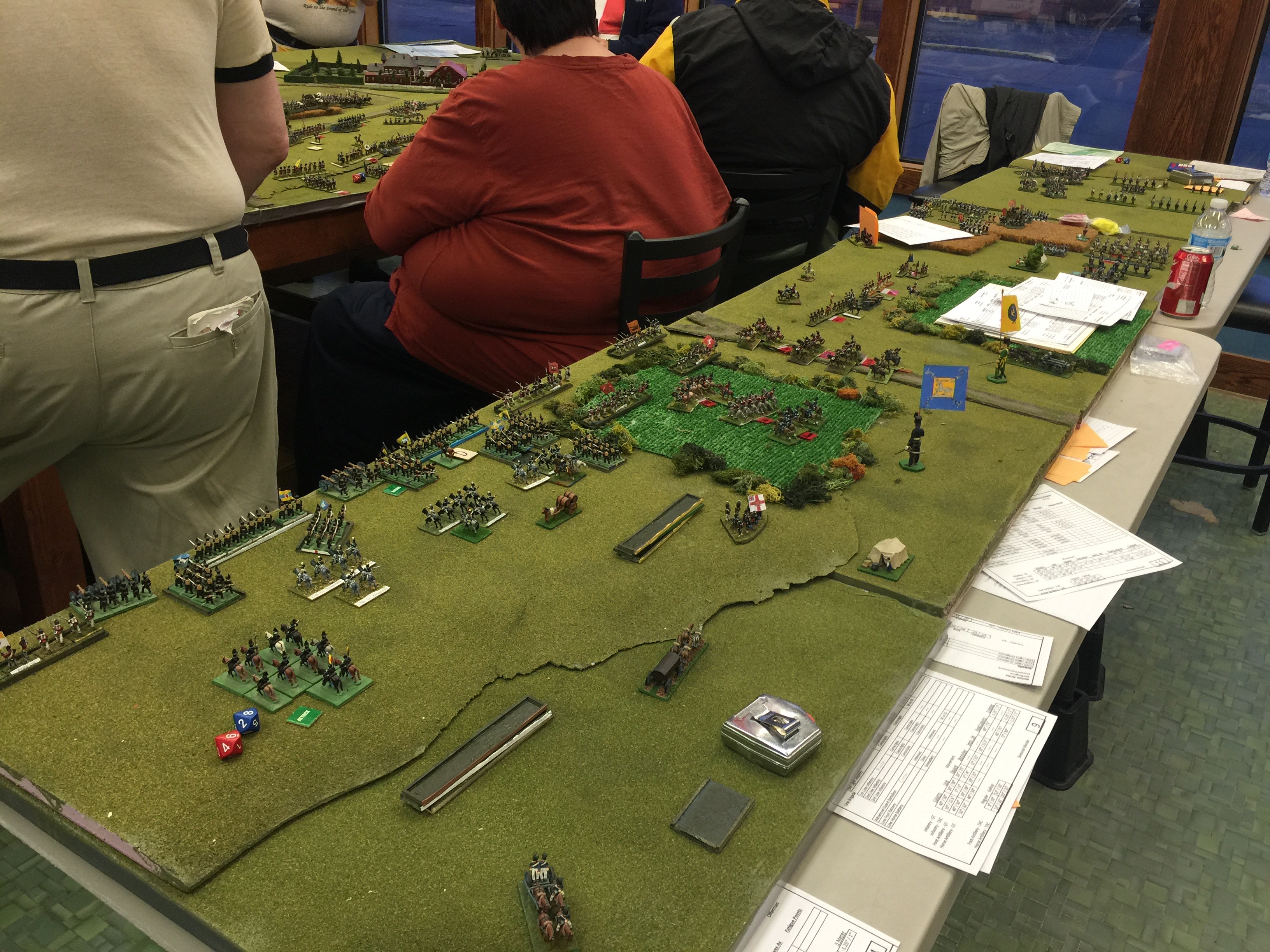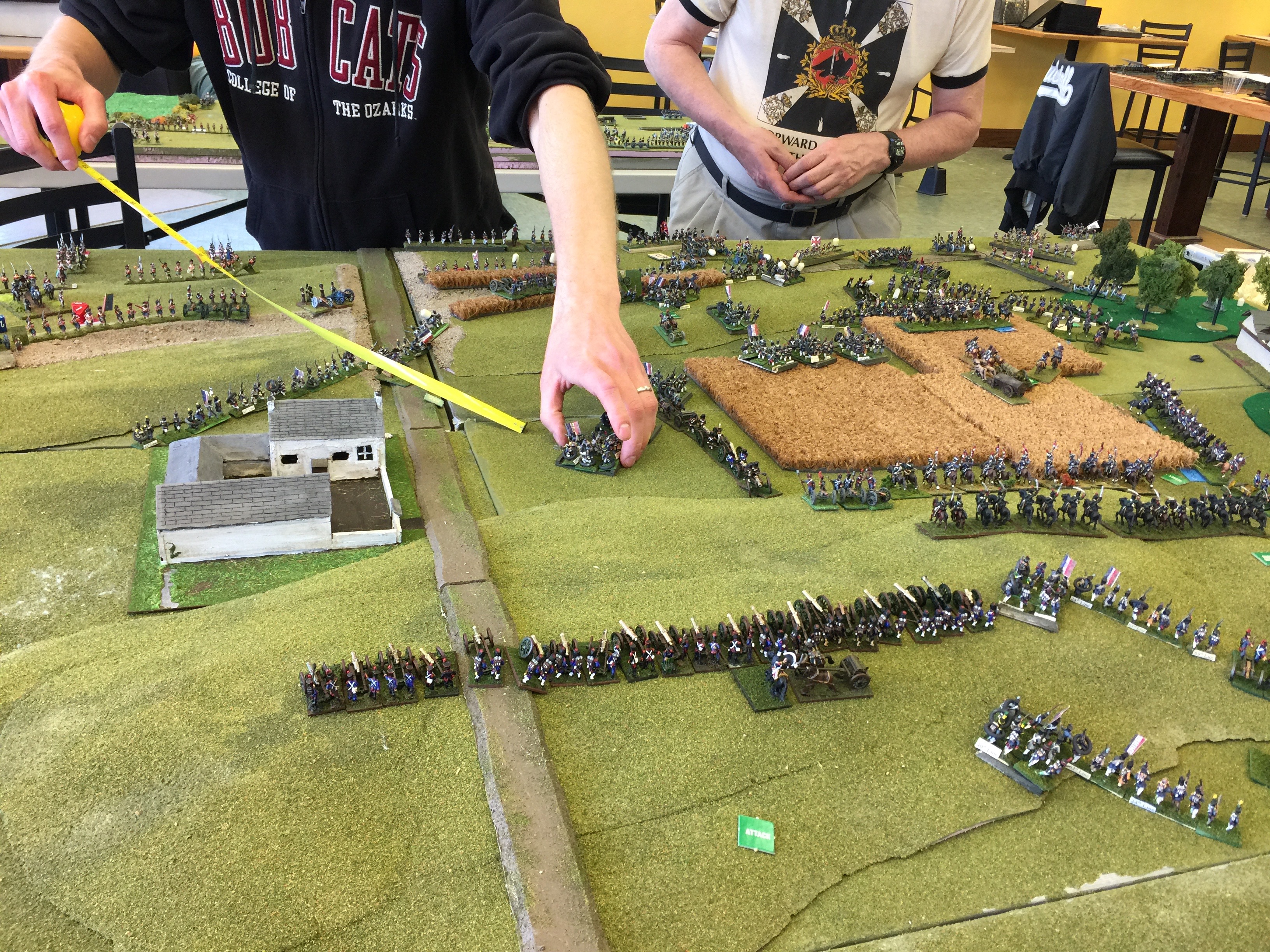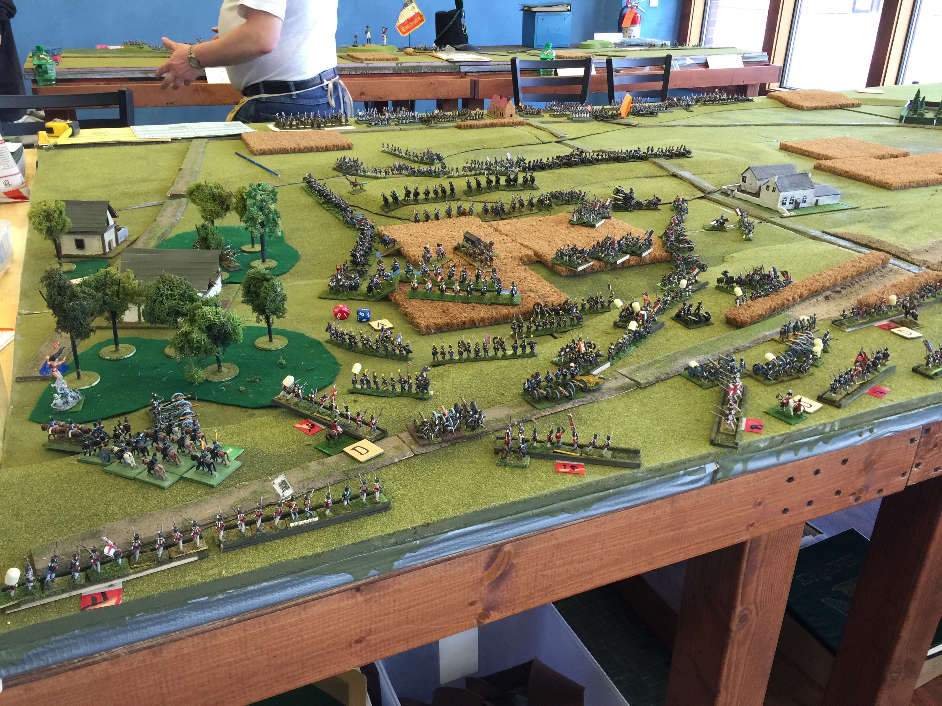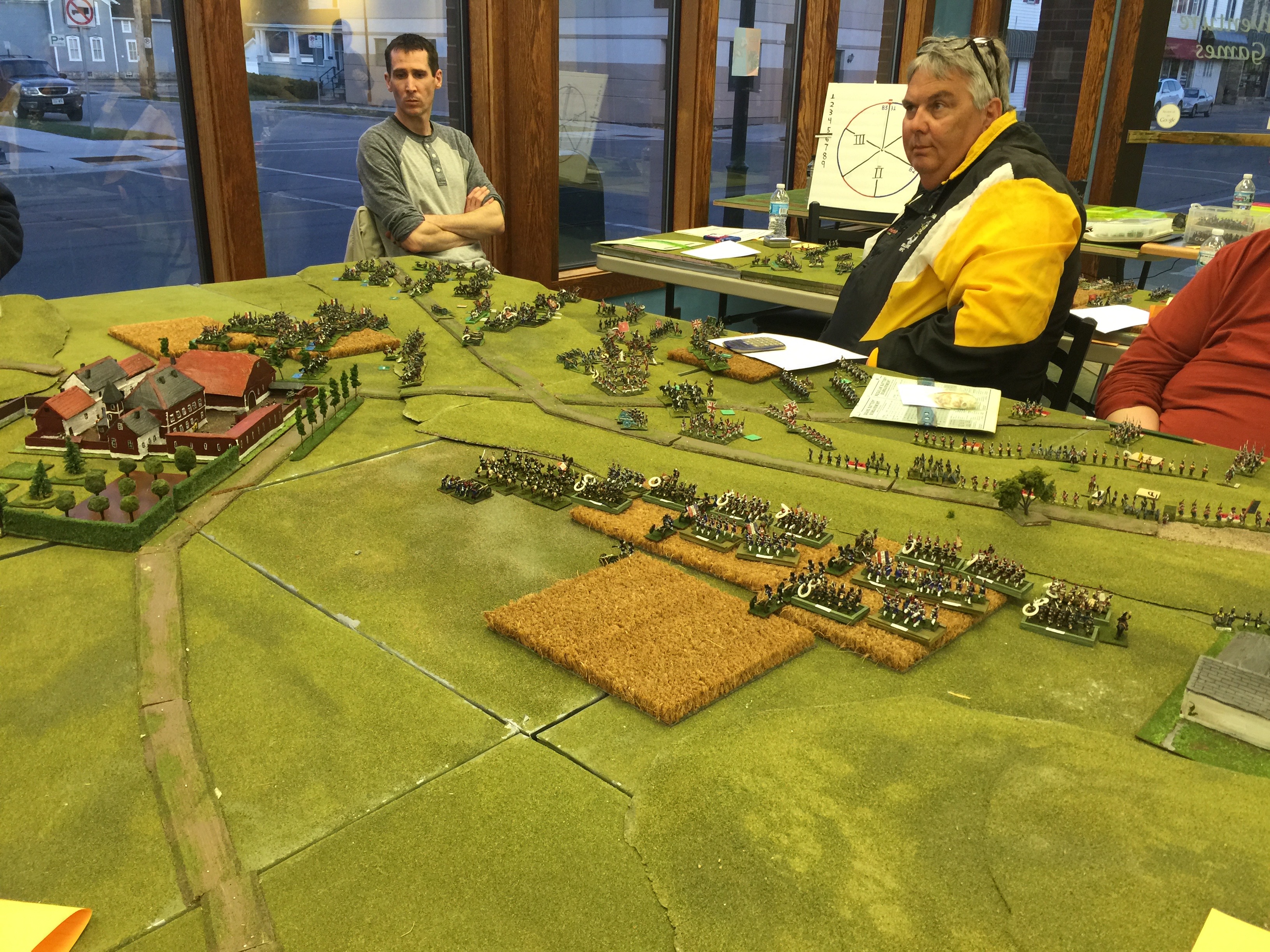 Here we’re oogling what will be but 1 of 3 tables setup for the game. Both on the left and on the right were yet another table (tho not quite as wide) to give depth to the game. On the left in the foreground is Dan Wideman who was serving as Wellington. On the right in the picture Michael Mathews who commanded the 1 Corps and Ney. On the table the closest built up area of course is Hougoumont which was scratch built. Off in the distance the white is la Haye Sainte and way on the table edge on the far end is la Haye/Saxe Weimar/Papelotte.