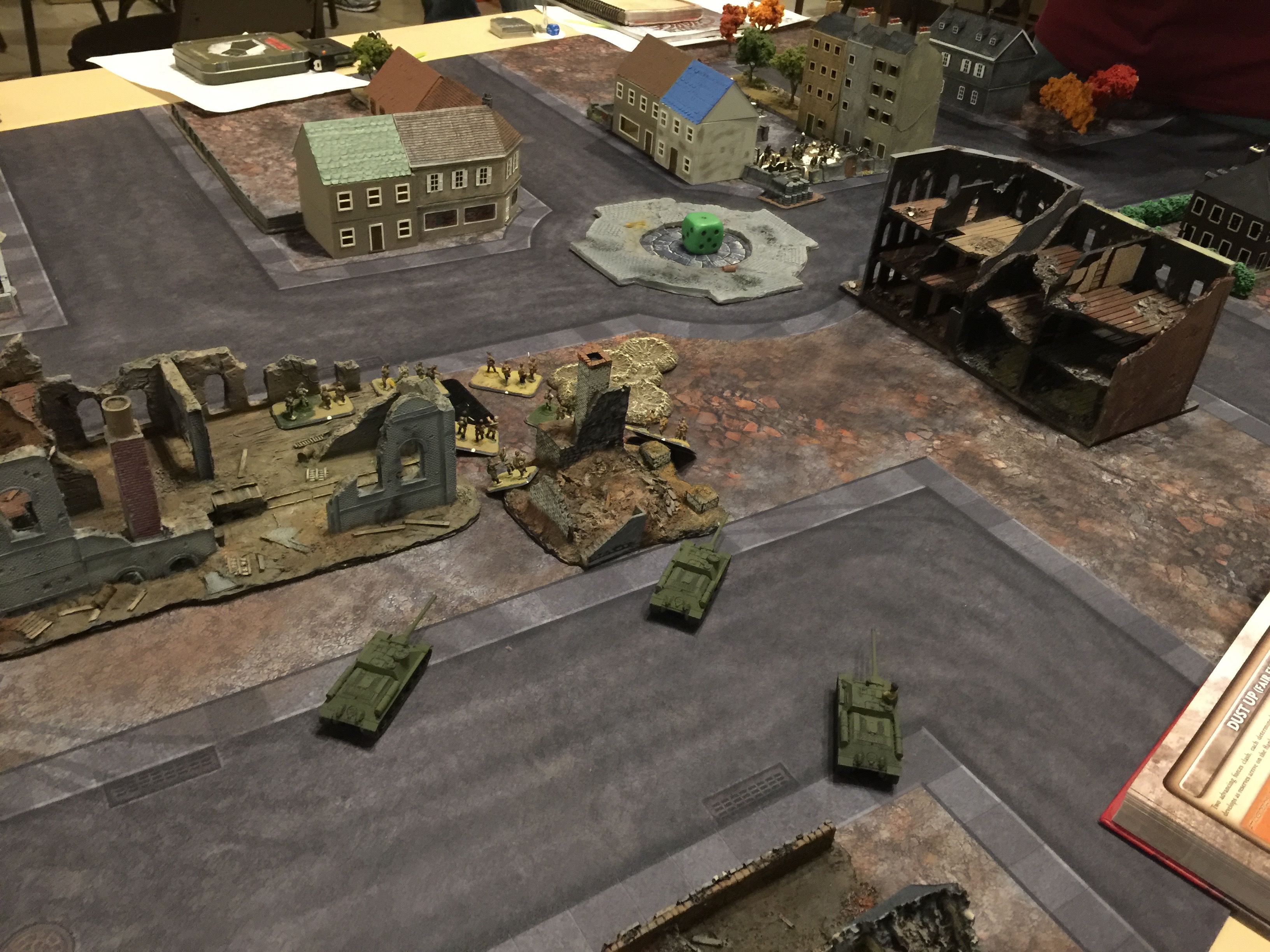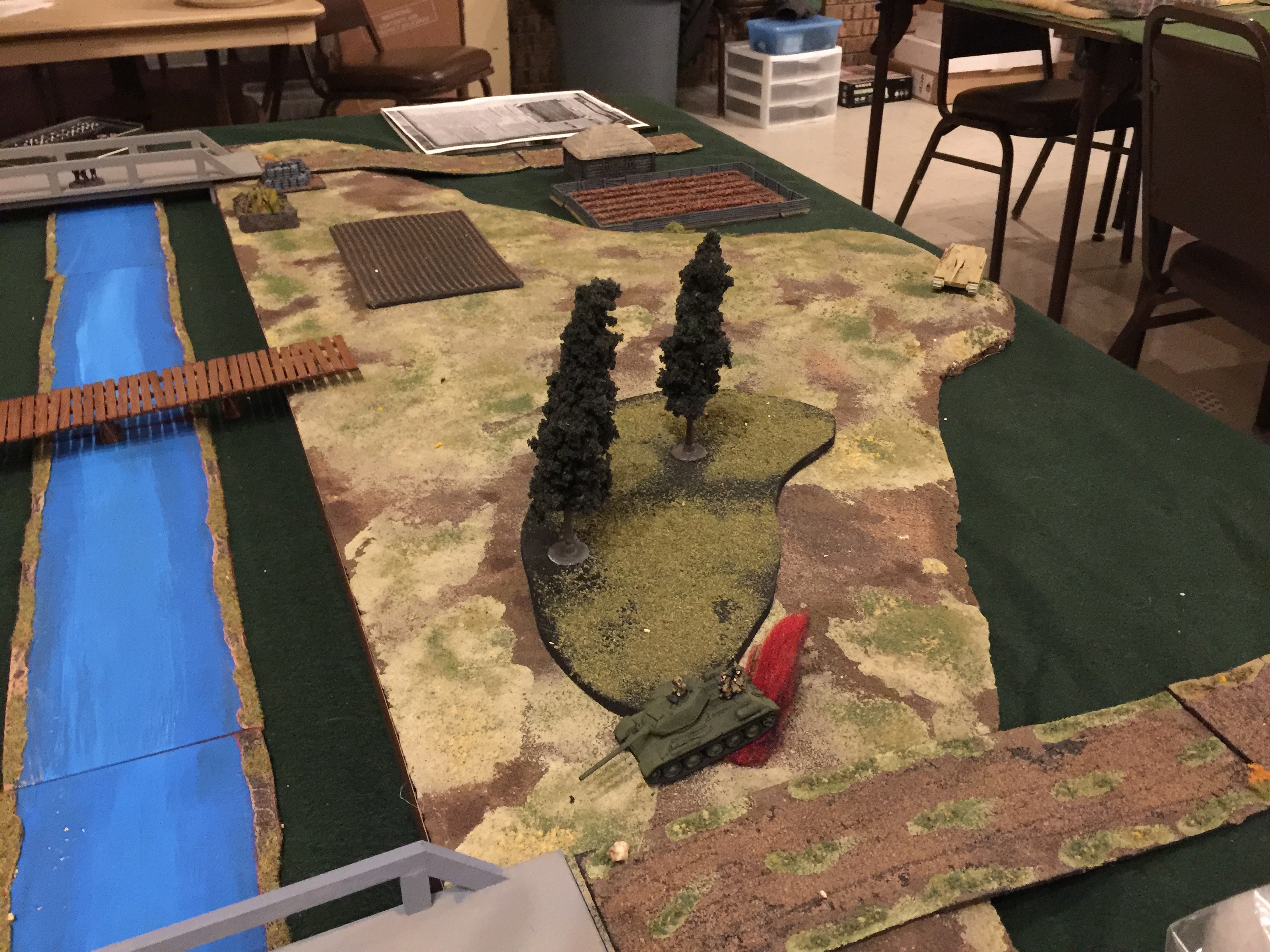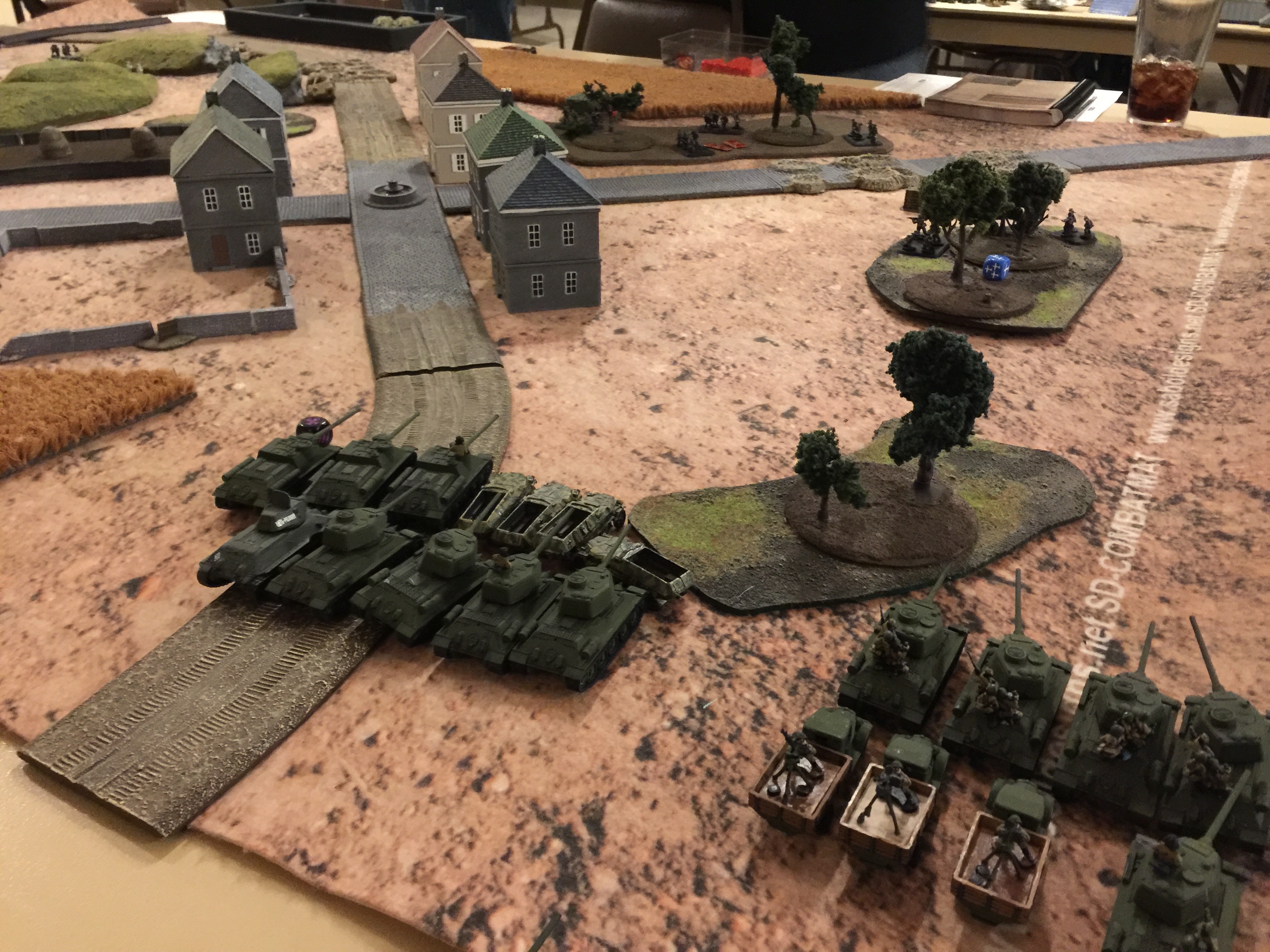 It was a Late War 1420 point affair. I fielded a Russian Guards Armor formation, with 11 T-34-85s, 3 AA trucks, 3 SU-100s and Speznacki platoon. (Infantry dressed up like Germans that can do recon and infiltration).