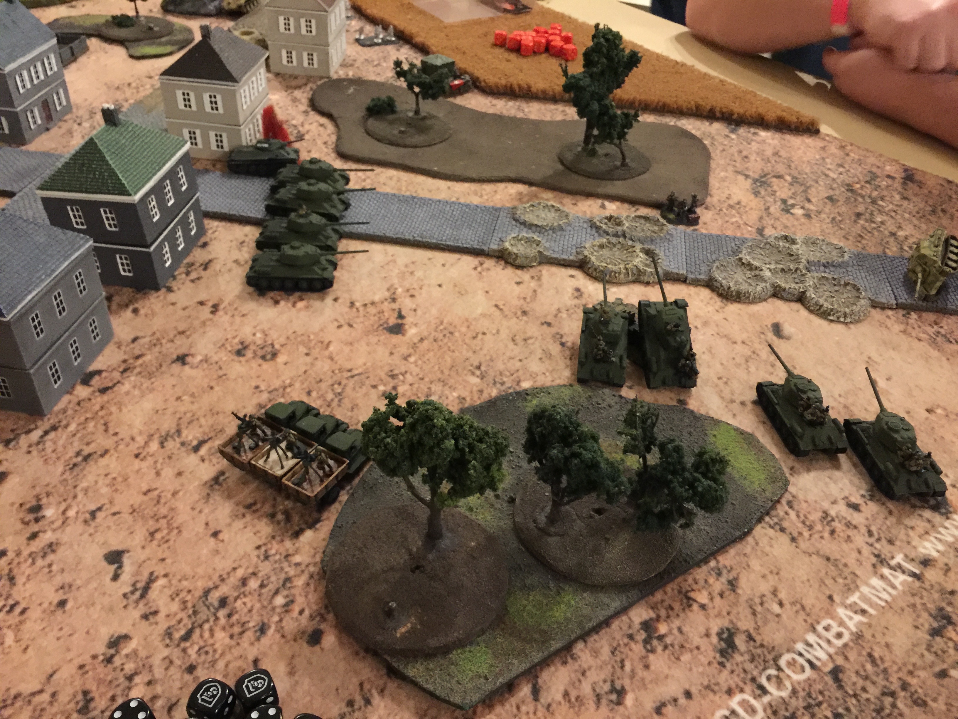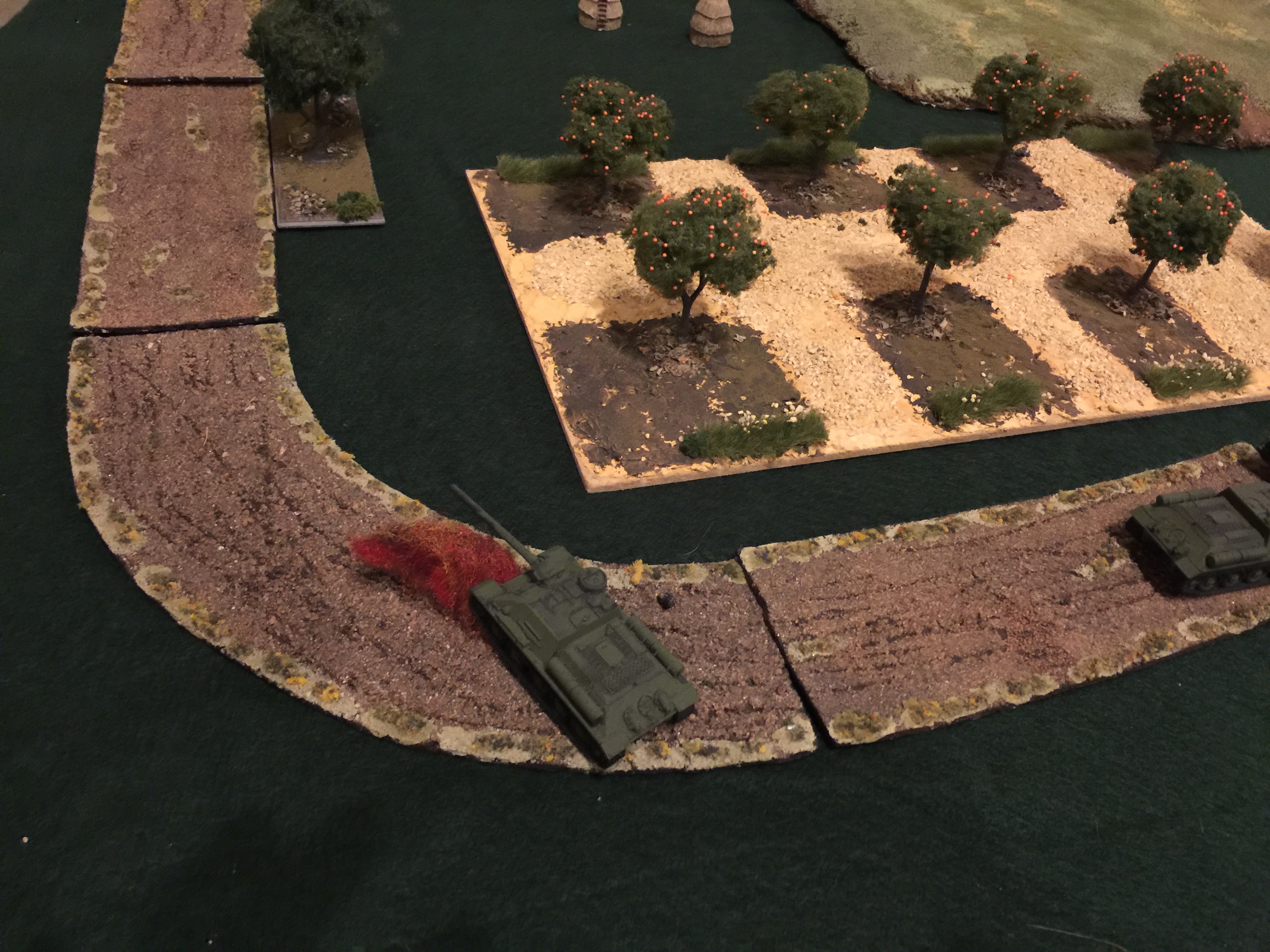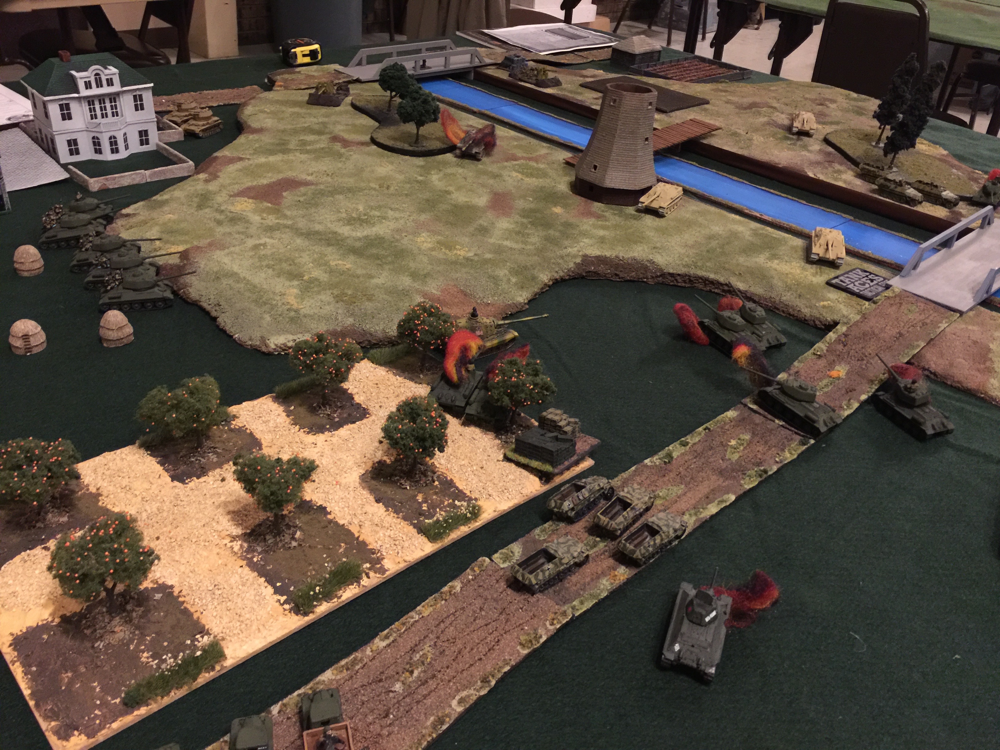 It was a Late War 1420 point affair. I fielded a Russian Guards Armor formation, with 11 T-34-85s, 3 AA trucks, 3 SU-100s and Speznacki platoon. (Infantry dressed up like Germans that can do recon and infiltration).