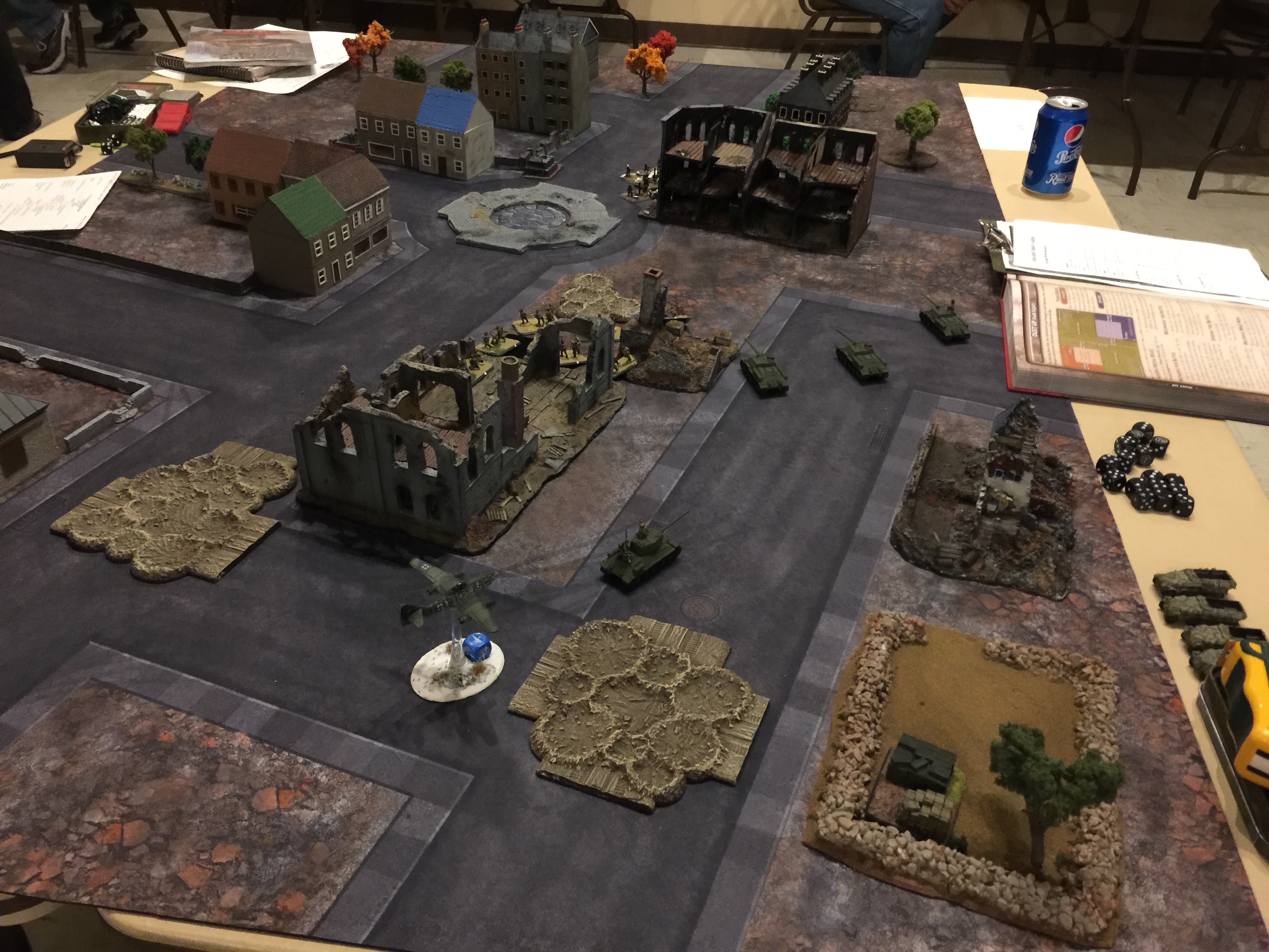 Generally it was a fun but unfortunately flawed game for a couple of reasons. First we weren’t clear on the terrain so the areas in between the builds which was supposed to be rubble caused trouble as far as the effects were concerned. Lee ended up giving us a ruling which was that it gave bullet proof cover to infantry but nothing else. (Our group treats it akin to area effect trees as thing of it as piles of rubble and thus blocks line of sight.) This would have changed my initial placement significantly as my SU-100s needed to avoid Roy’s air as well as position for his Panthers which were in this picture behind the building on the right. As the tournament veterans know, discuss terrain first! My fault.