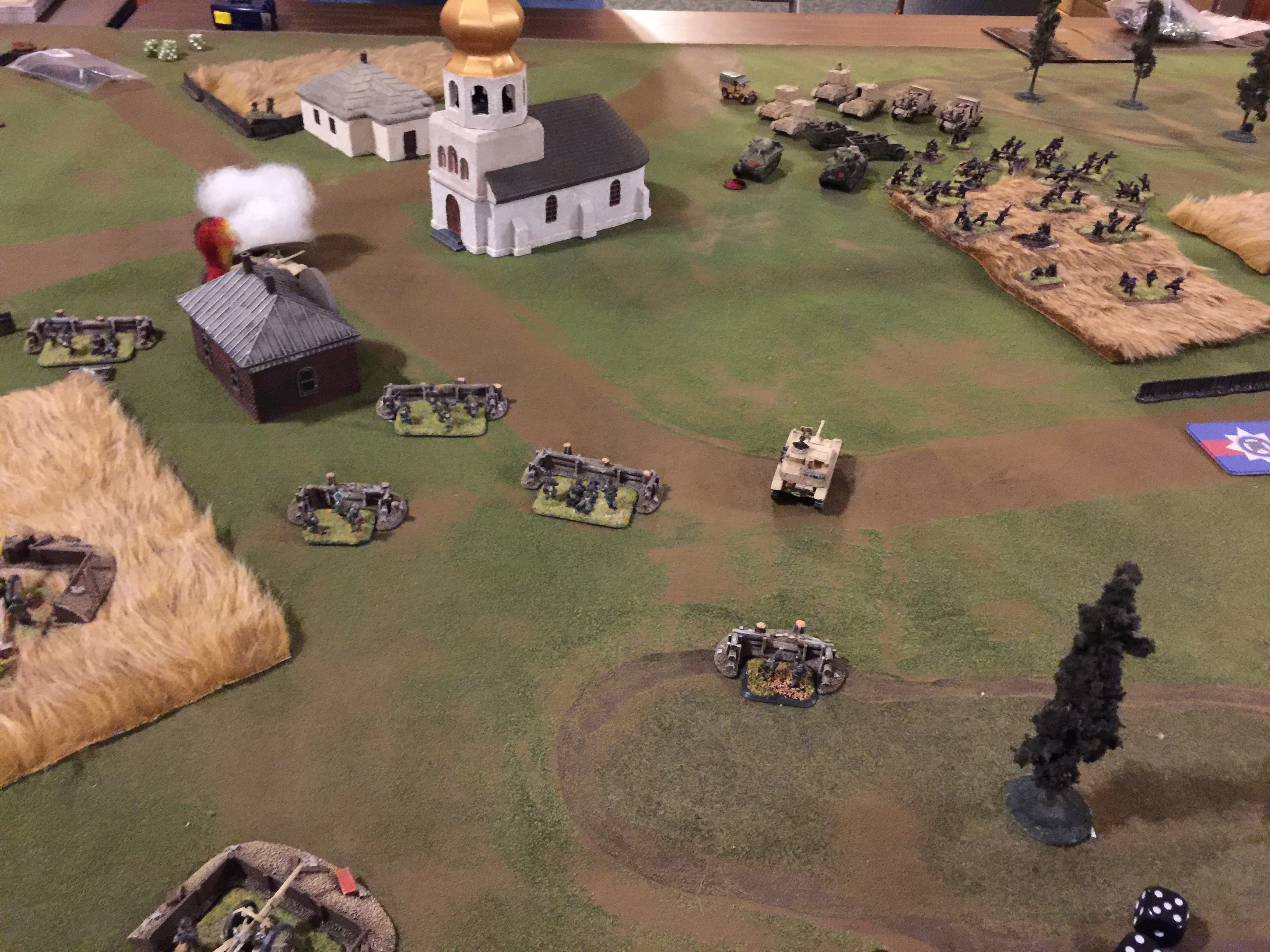 Joe came at my right flank fairly hard. In my initial placement I keep my mobile stuff generally in the middle with fire lanes towards both sides and then my infantry to secure the flank objectives. Joe had to get in close to me as my Hs129 in my first defensive turn immediately started to produce results by brewing up a number of half tracks to take that platoon almost to it’s testing point.