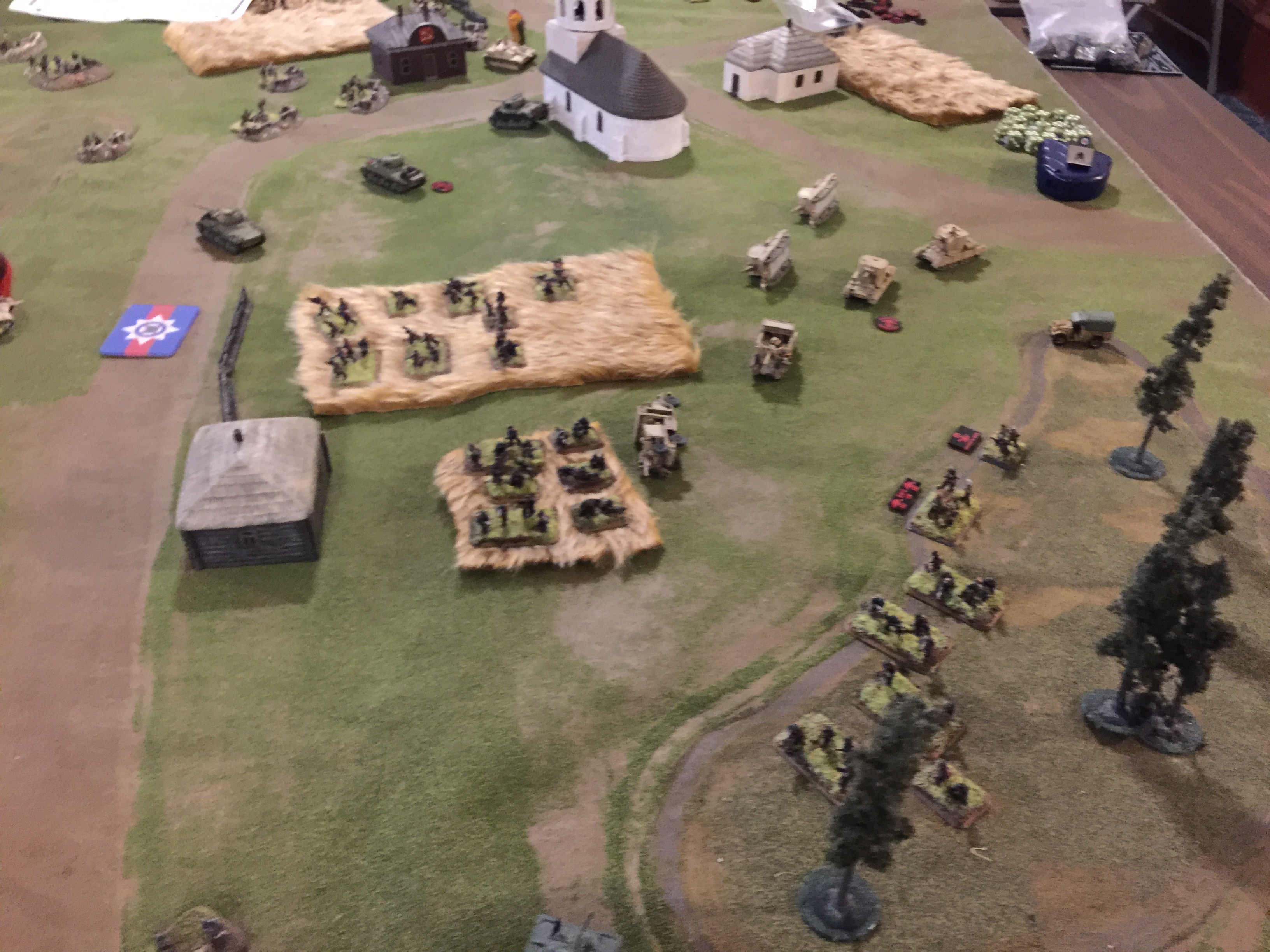 My recce attempting to win the game rushed just the two artillery stands in defense of the objective, an observer team and a staff team. I assaulted, and won and the staff team broke off. Next turn, with nothing else able to react to assault the unlikely of unlikely events happened, where my armored car was assaulted, hit, with it’s zero top armor vs a tank assault of 2, just needed to not roll a 1 or 2 … and I roll a one. Dead recce, which bought just enough time for the infantry to fall back to a point where it could be in assault range… That’s what decided the game. My KV, StuGs just didn’t have enough time to pepper the infantry (with gobs of bazookas in their hands of course) to prep it for their own assault and therefore take another run at the objective because on the other side…