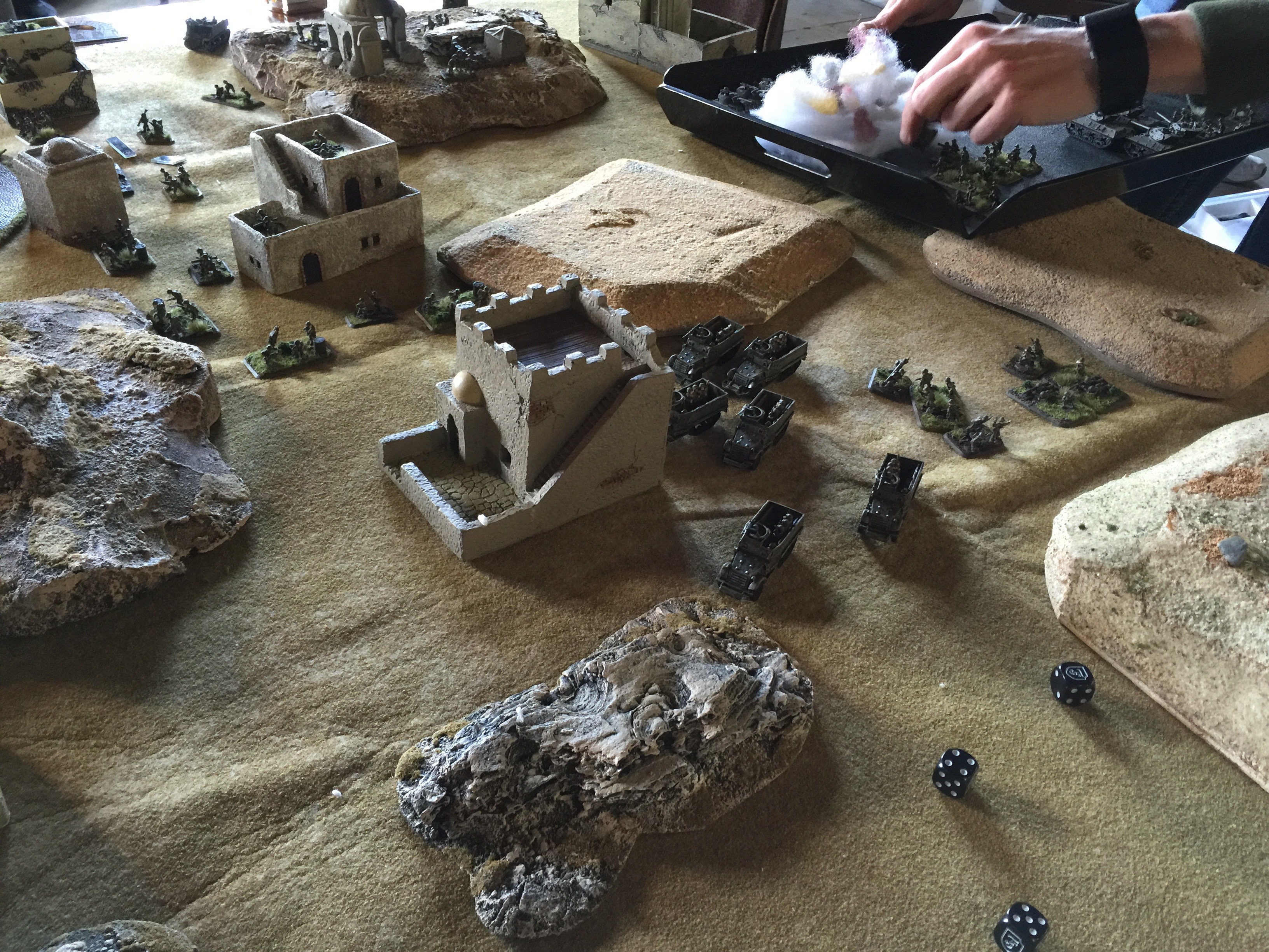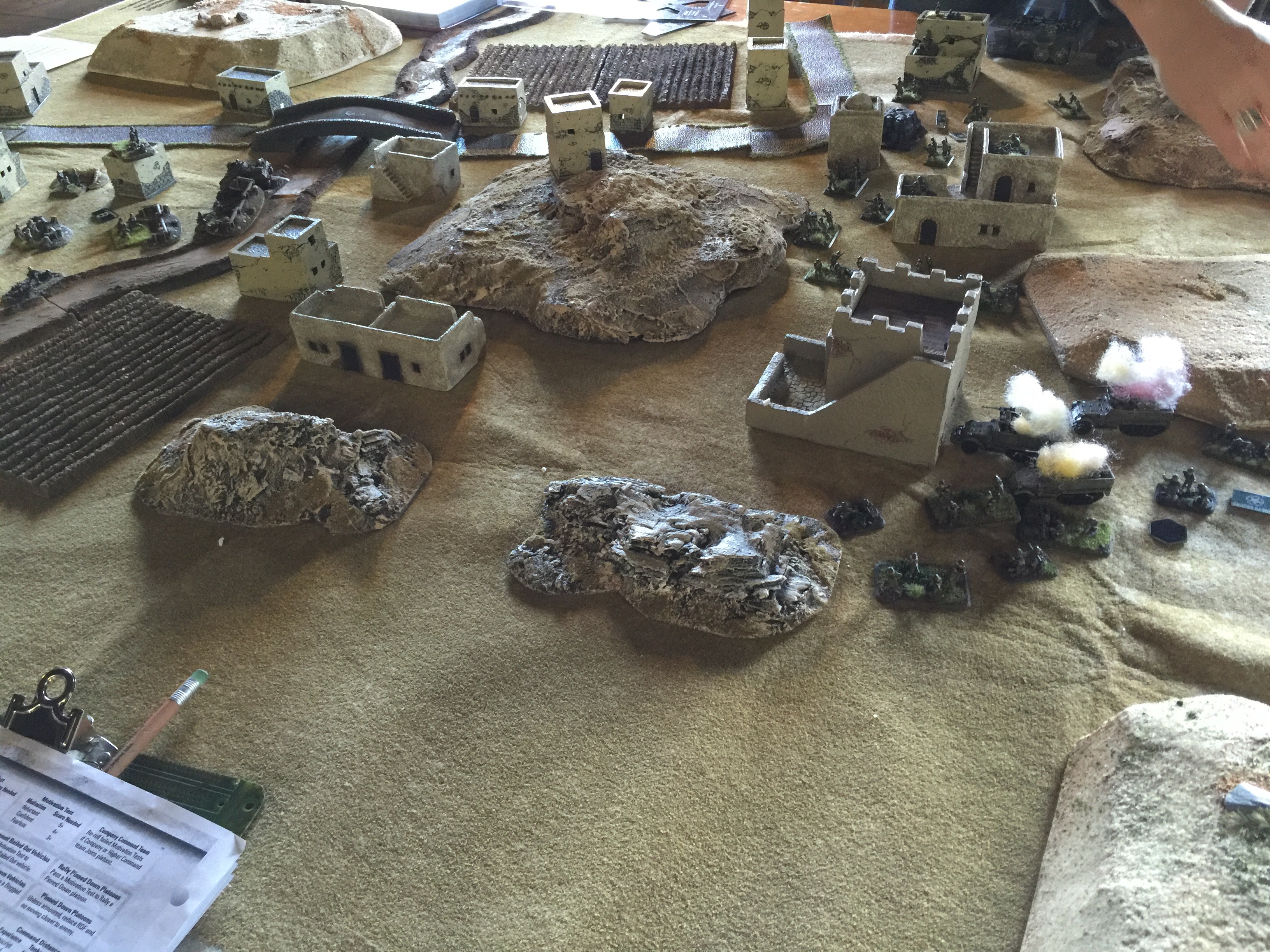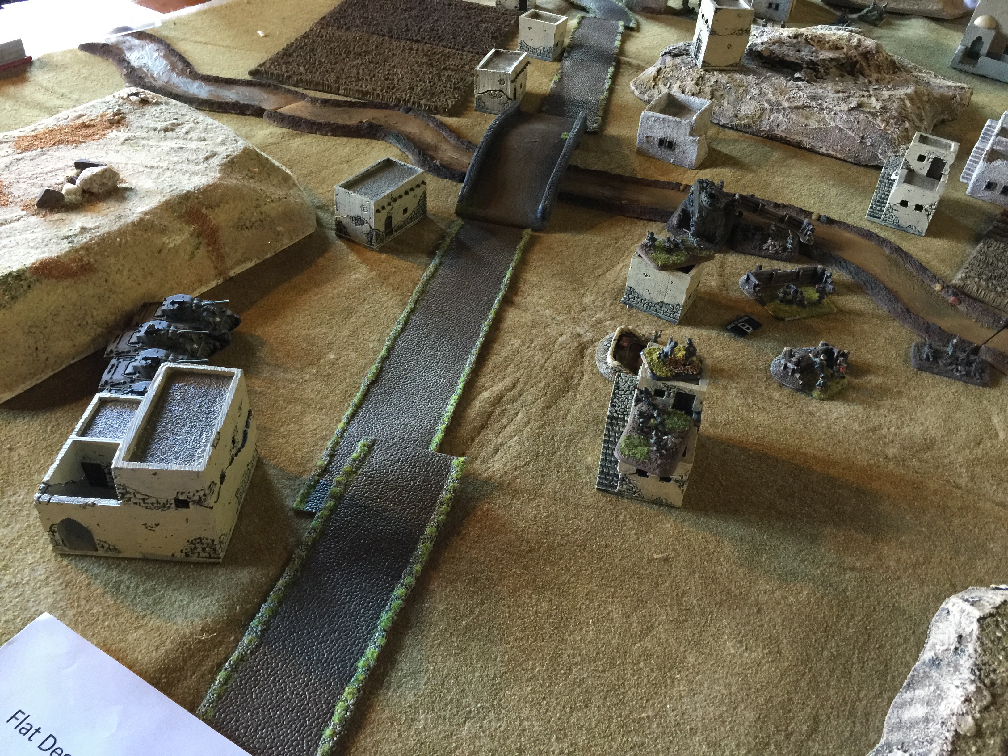 The table was a north Africa locale with lots of special terrain rules. The scenario was dust up and as fate would have it I was the attacker. I picked the quadrant I felt offered the best deal on defenses. It’s just on the right. Defender being on the far left.