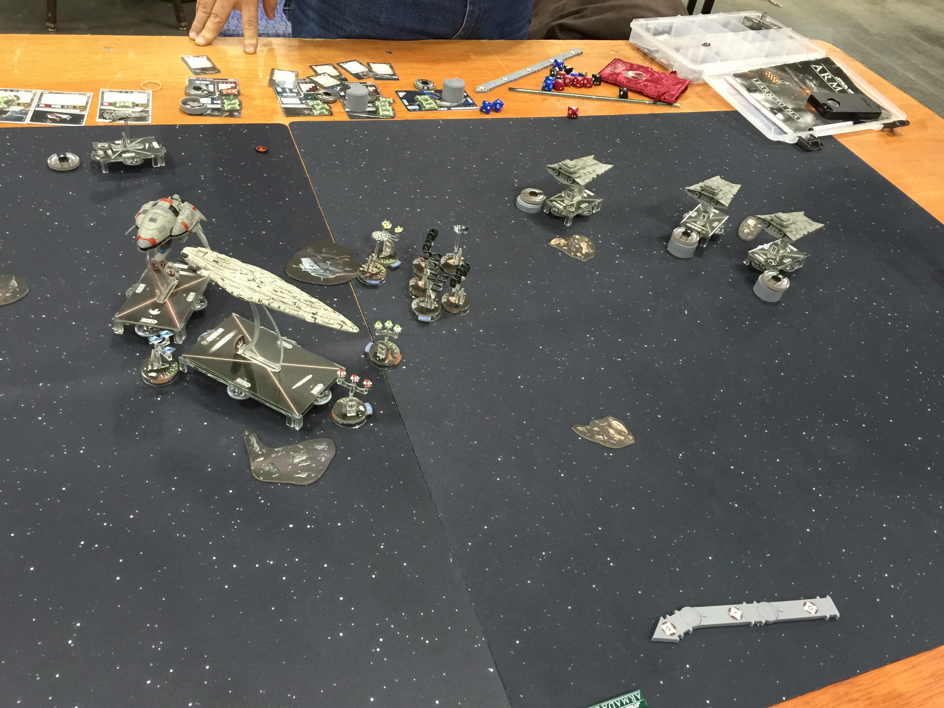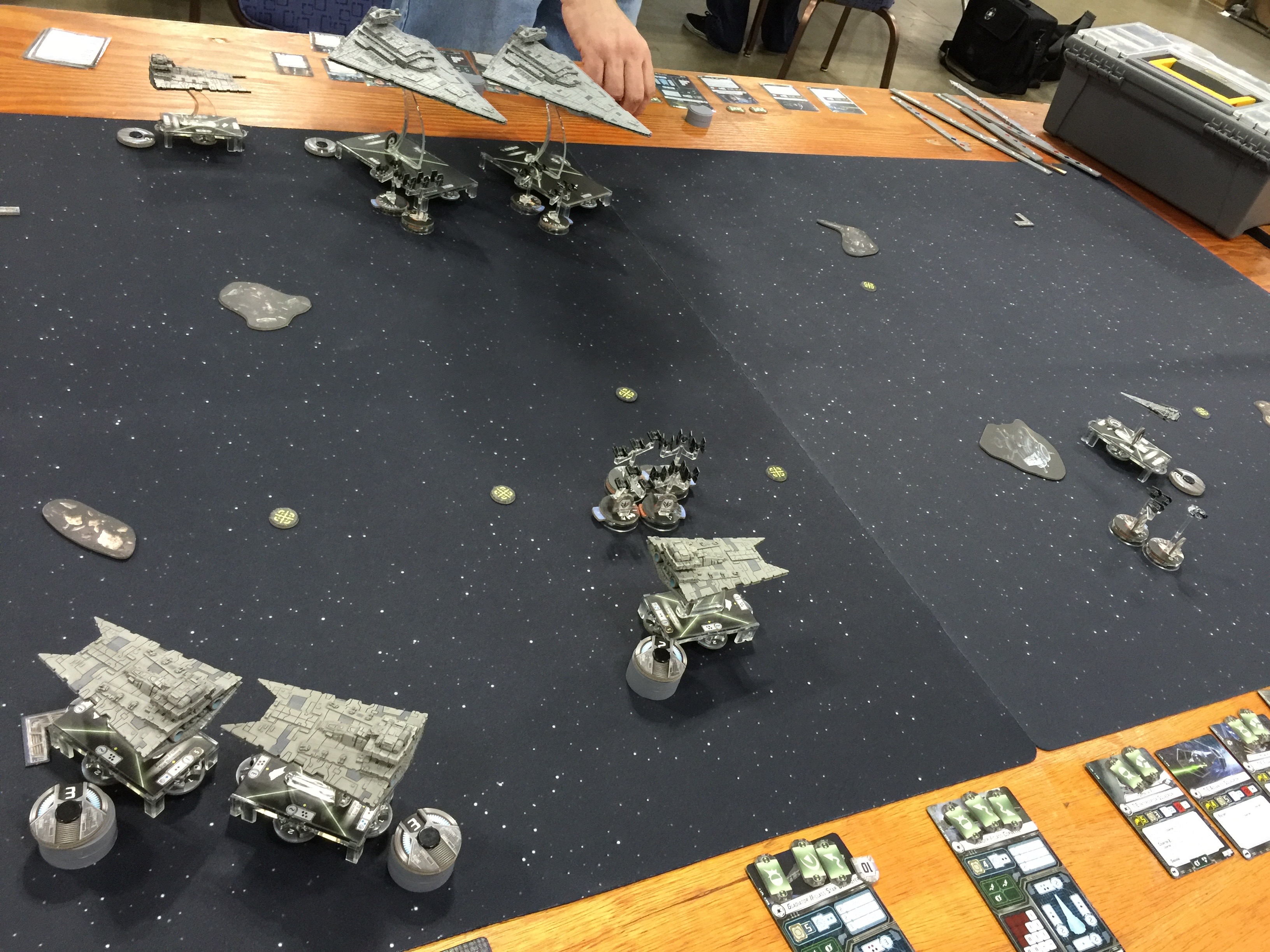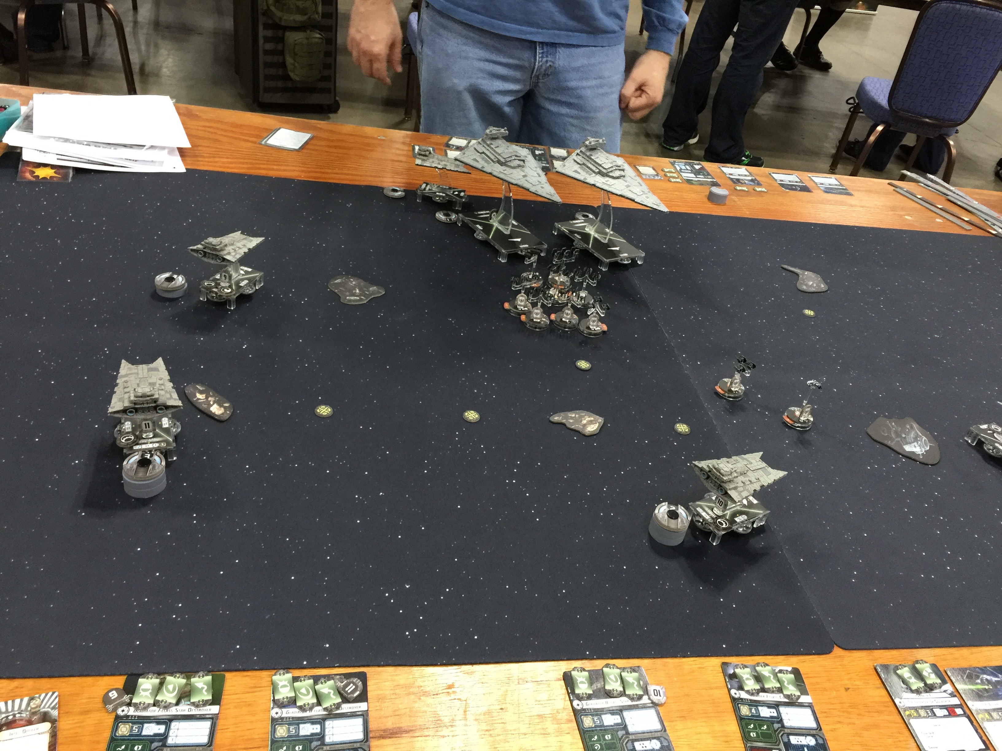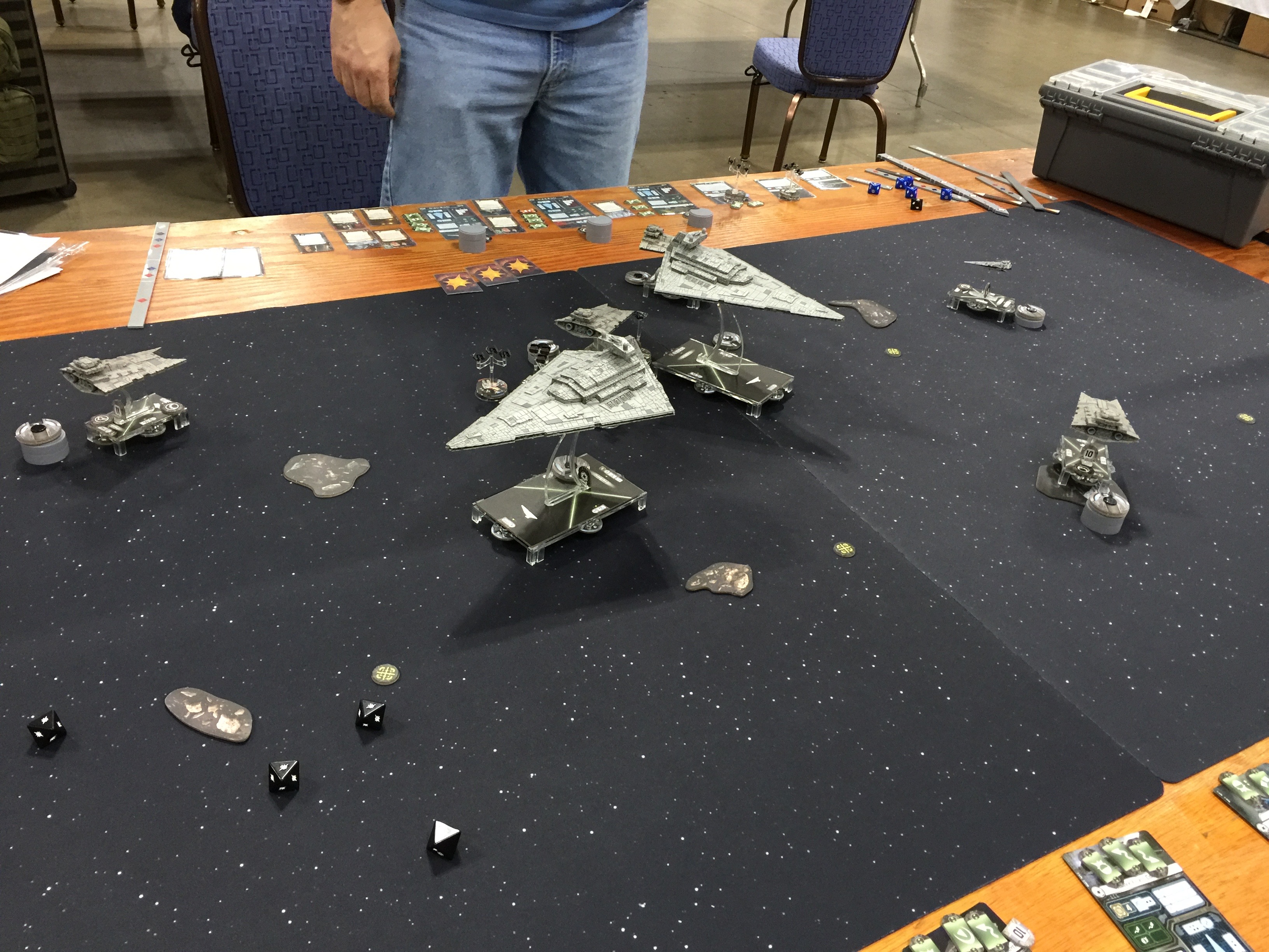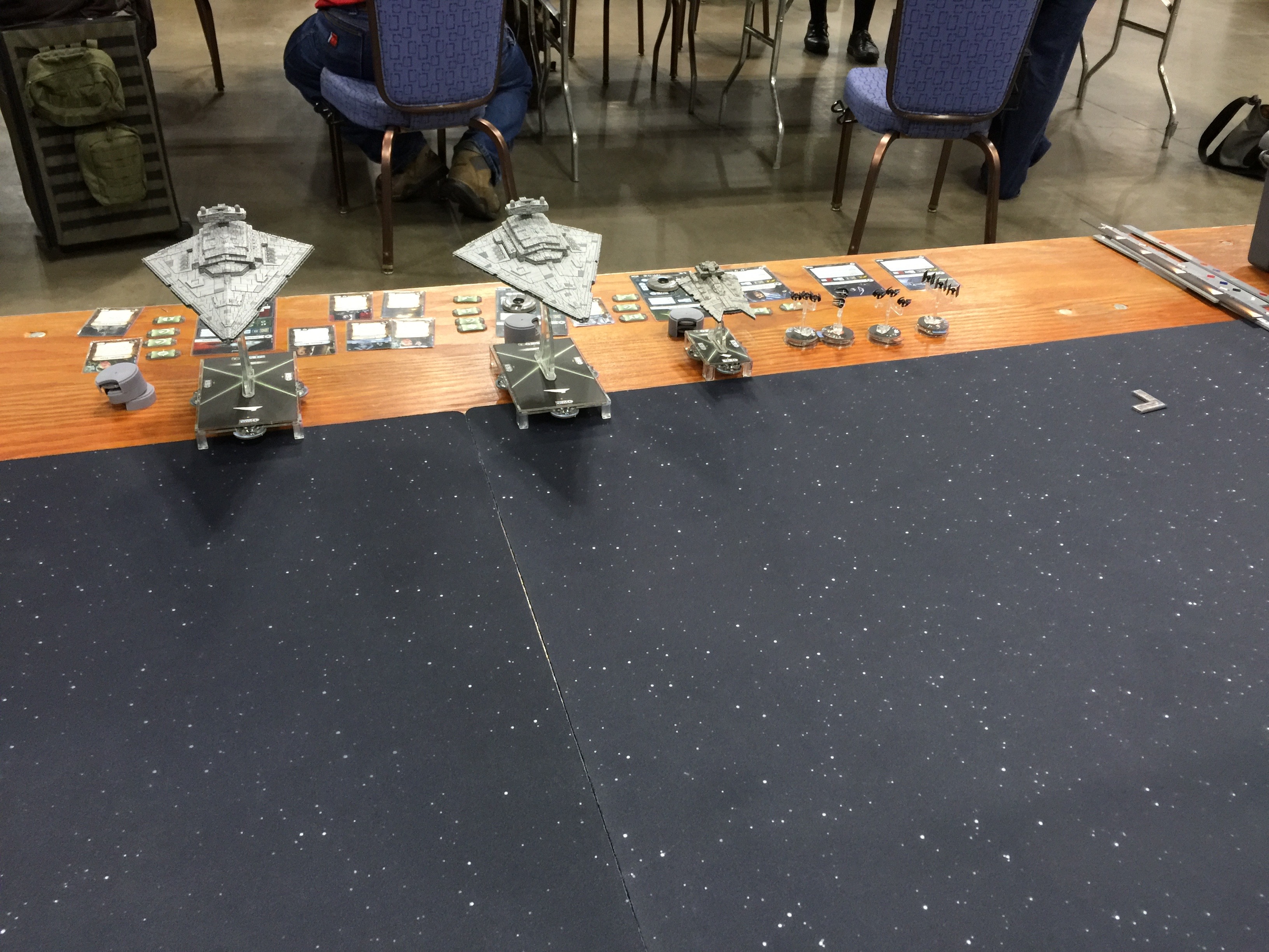 Thursday started with Ian playing in the Hoth X-Wing tournament and I played in the Armada tournament. The Schaumburg convention center is pretty nice and all the FFG events were pretty much in the same place. The tables were umm … pretty crappy so for 3×3 and 3×6 surfaces there was a very noticeable dip where the two tables joined together that didn’t match. Players just had to make do. Otherwise lots of space and elbow room to setup and keep your force.