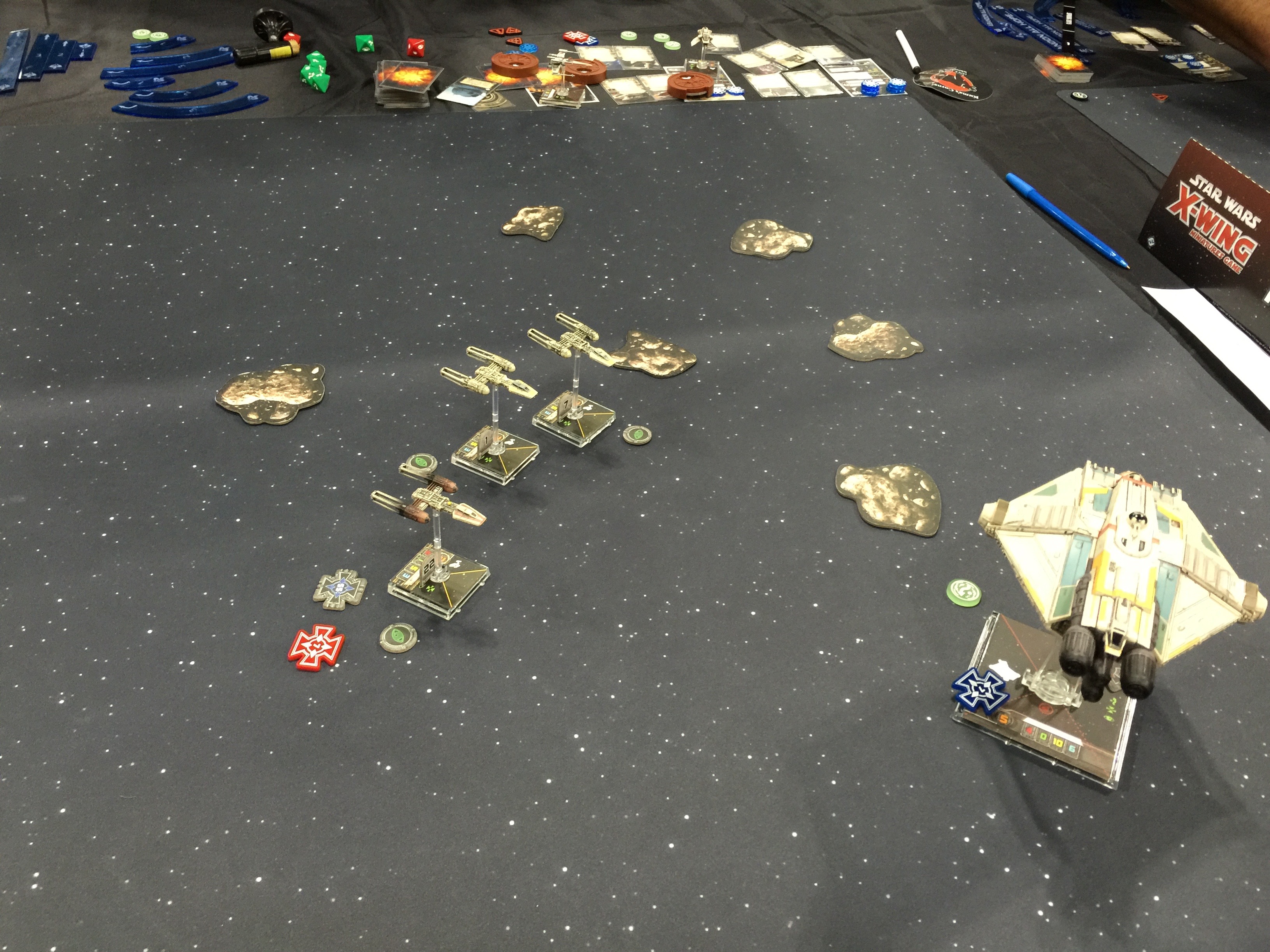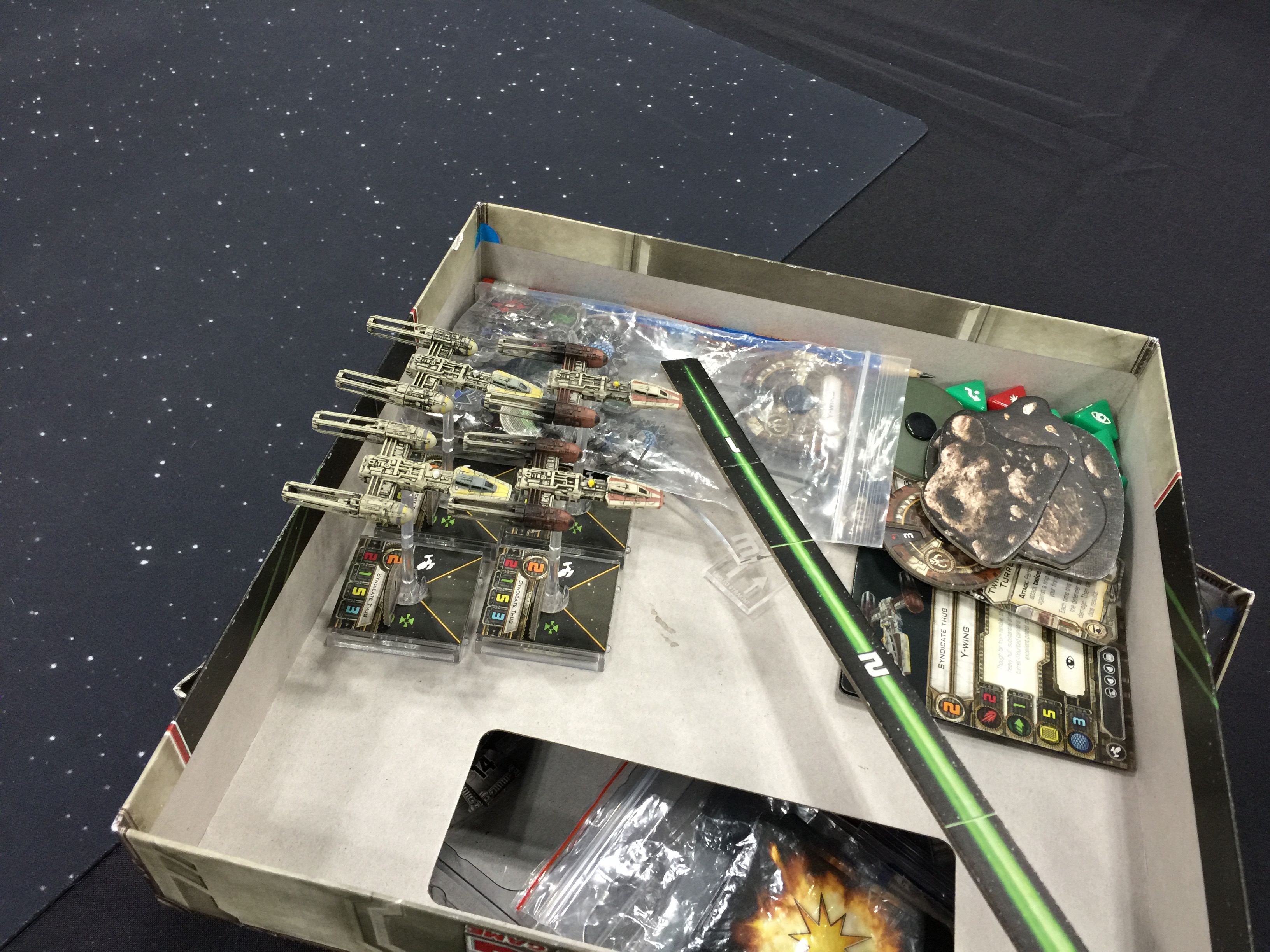 Hoth X-Wing tournament day two. I was ready for my try with 4 scum Y-Wings fitted out with Twin Laser Turrets and the card that fixed the turret forward but allows you the extra shot.