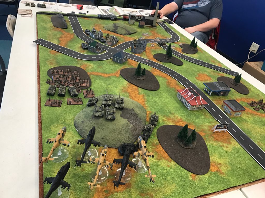 I decided to push hard on the left flank. With cover of darkness I figured I could get my infantry, tanks and helicopters into place with the intention of striking fast before Keith’s reinforcements might show. At this point the tanks were more or less even between sides and in theory my Hinds and T72 could take them out quickly.