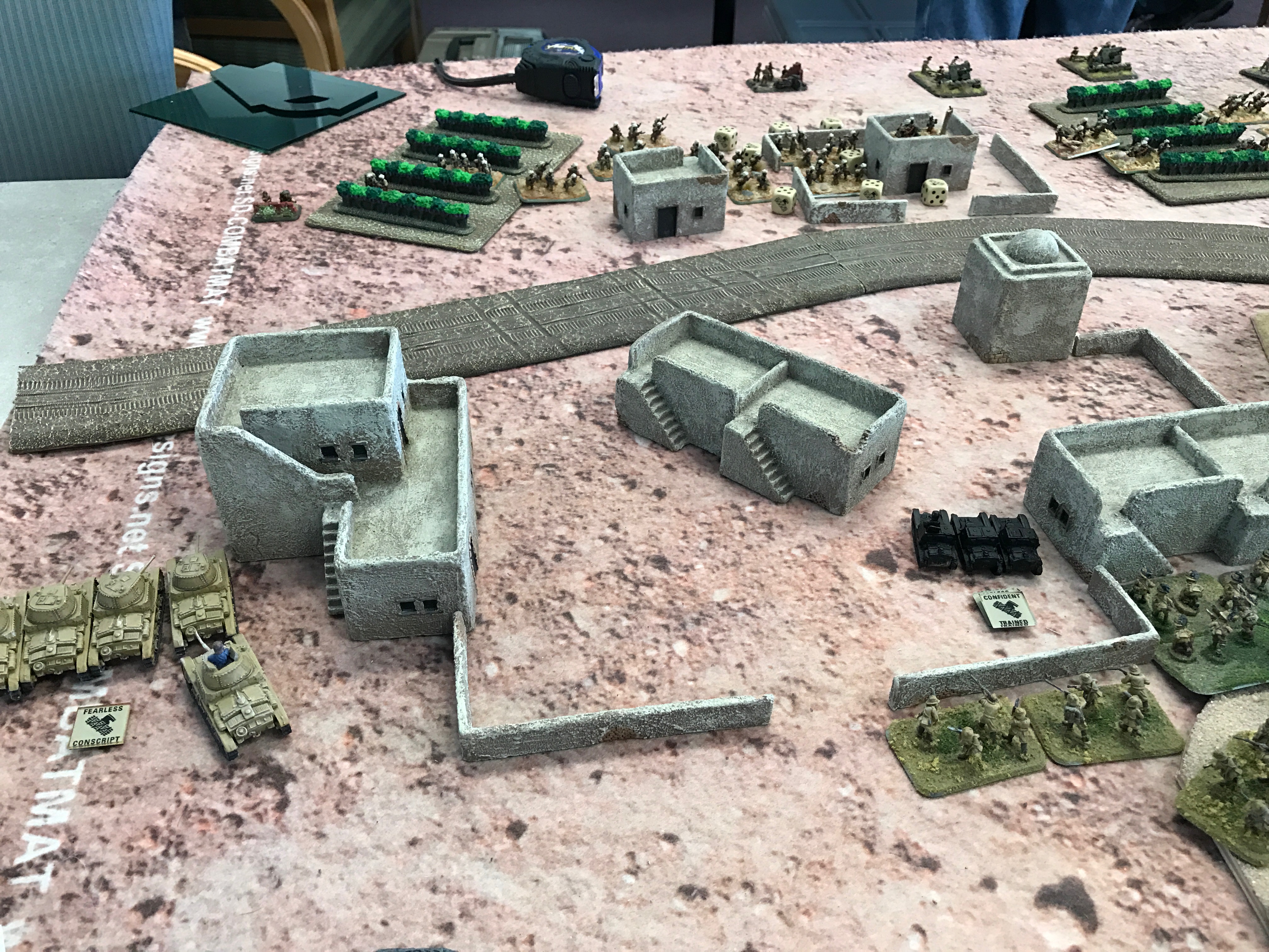Another turn, (3 I think), both my platoons of infantry are in the buildings, the HMG platoon is in the far right building in the picture and the tanks are inching their way towards the middle, showing destruction as they go. The Vickers platoon is down to 2 stands and the infantry platoon is chewed up enough that it won’t be on the offensive. Unfortunately across from it is my platoon of reluctant trained and fearless trained infantry. Not quite good offensive material thus it was pretty much up to the thanks to drive for that objective over on the hill. Just some infantry and those 25lbers to brush out of the way.