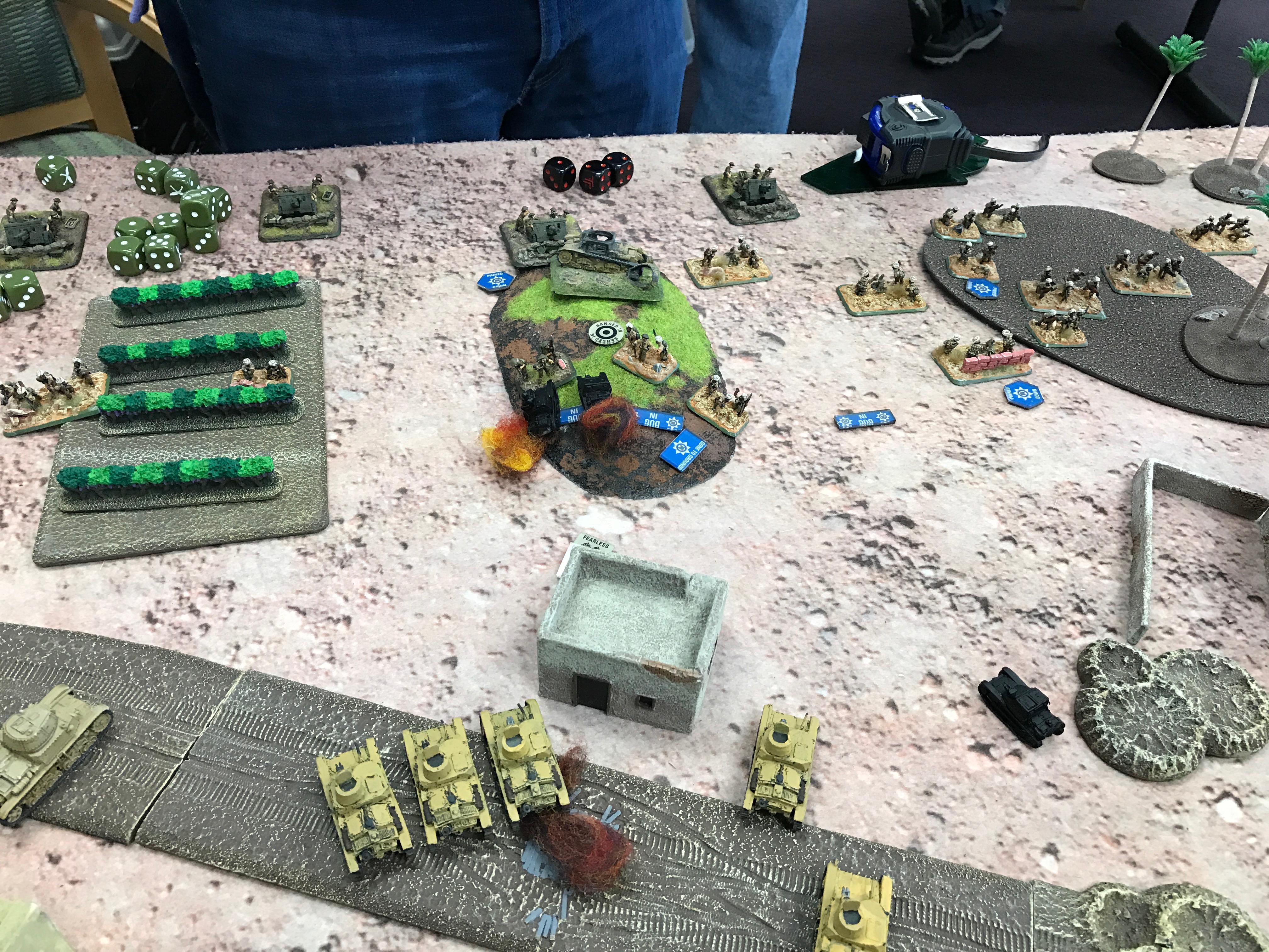 From my right flank I brought in my M11/39s when then caused Chuck to pull his infantry covering the far corner. With my slow tanks they weren’t going to be able to counter back. 8″ tactical isn’t that fast!
