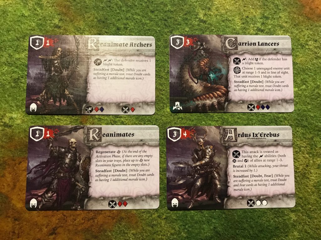 Last is Ardus, the hero of the Waiqar, rolling a double white in melee unlike any other current units on the table. His attack ability pulls in the surge abilities of nearby allies. As an example, if he’s distance 1-3 to a Carrion Lancer and he’s attacking he gets to take advantage of doing an unblockable wound if the unit he is attacking has a blight token.
