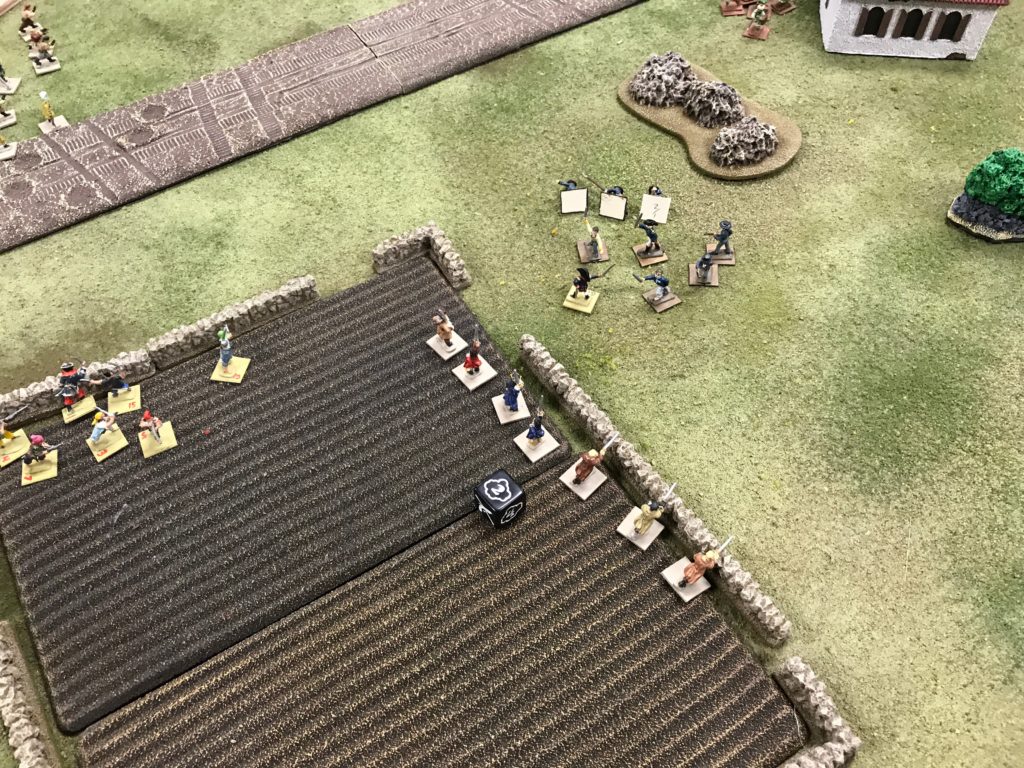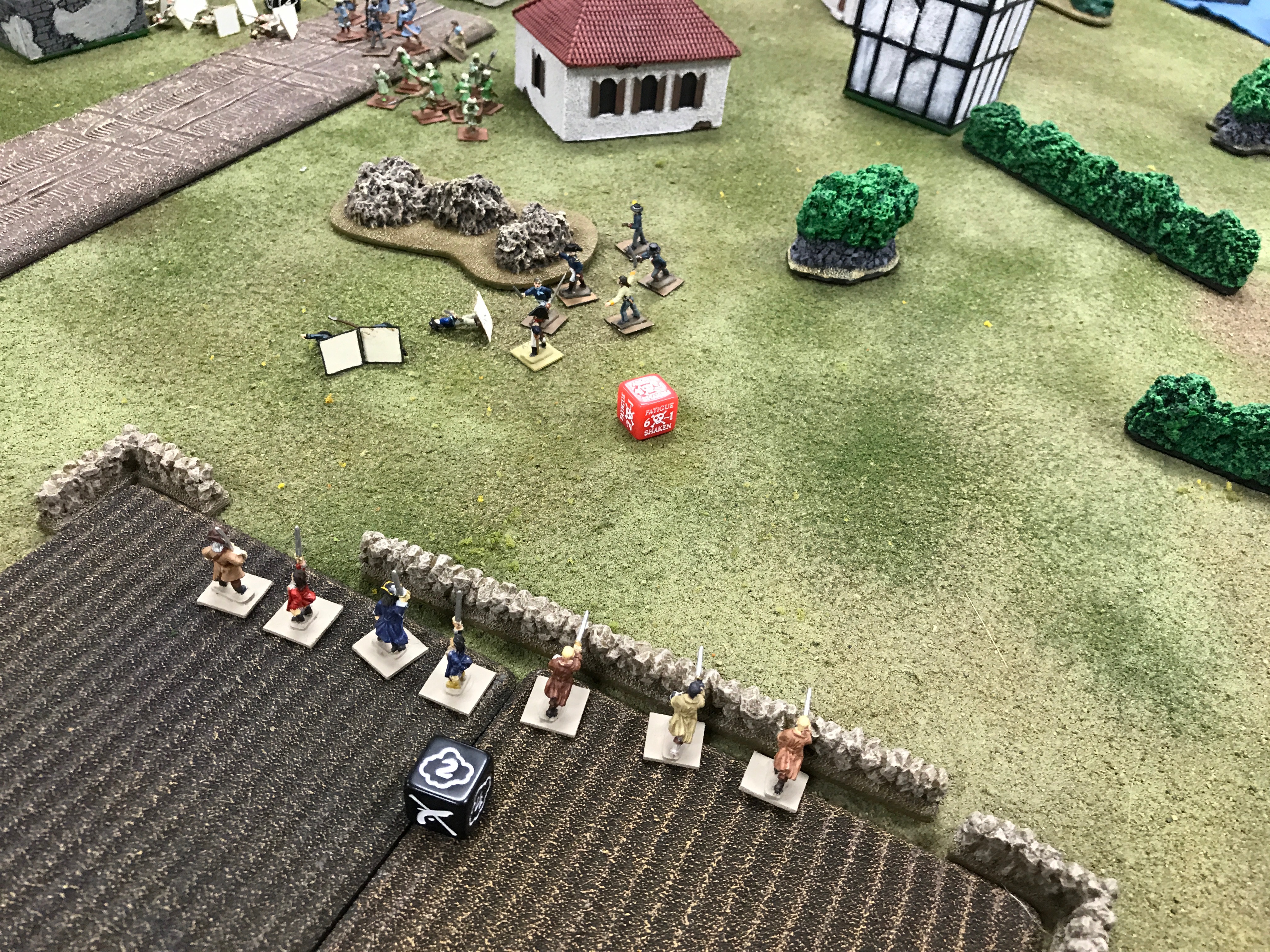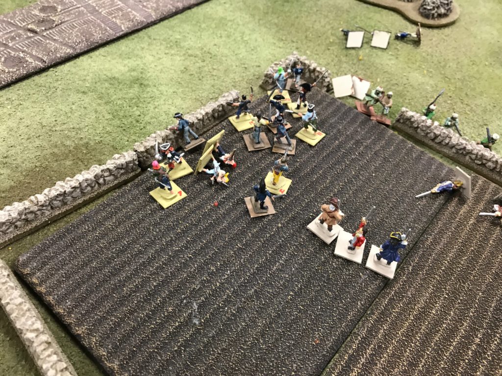 So while activation allowed for the great results on the road for me, it also allowed Ian to get his Lanceros into melee with my Flibustiers. Since I hadn’t been able to reload, no defensive fire. We went back and forth in melee but Ian ended up winning that and my Milices des Caraibes needed to rush in to help their friends.