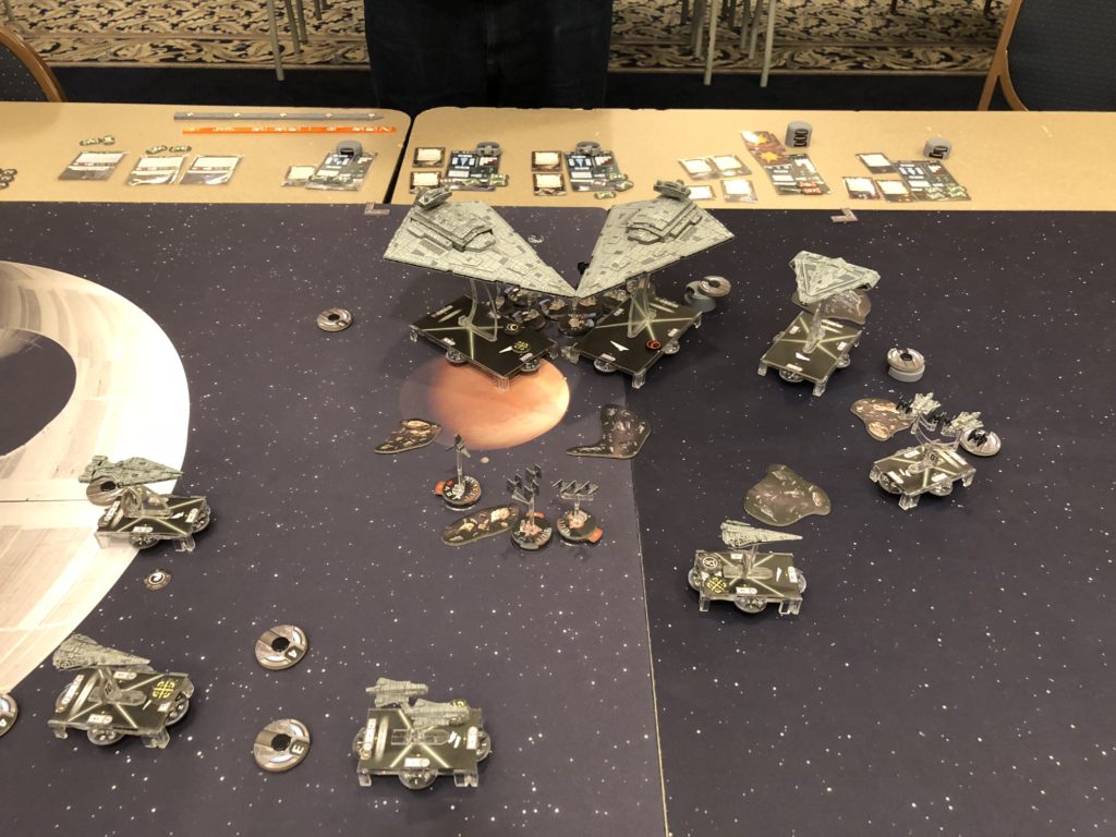Round two was a fun one where we were doing blockade run. Given my opponent was running JJ as his admiral those Raiders and Arq had the full ability to pick where they were going to dash to escape. No surprise we were playing Blockade.