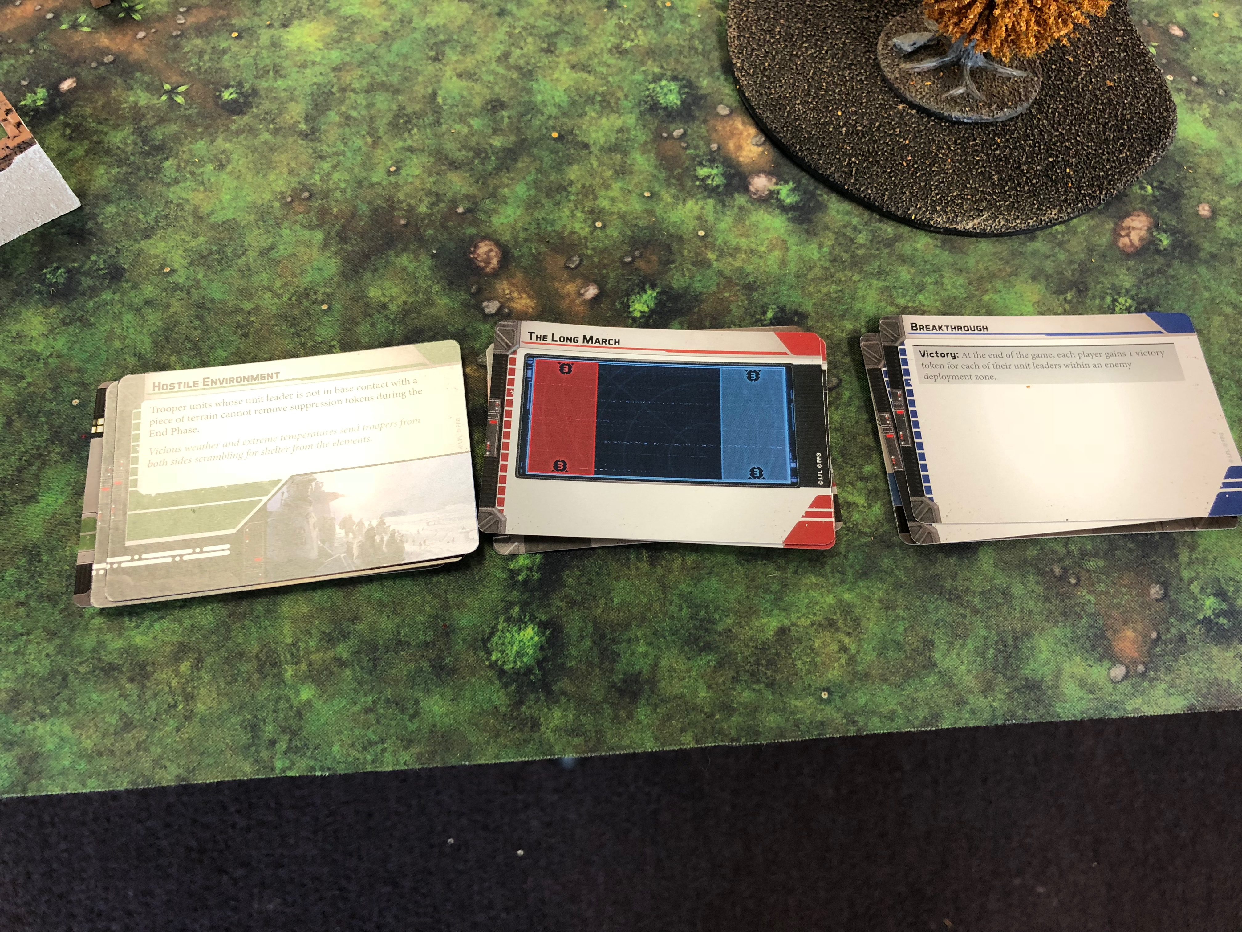 This is what we had chosen. Basically playing the ‘long way’ on the 3×6′, victory tokens only if you’re able to get into the other guys deployment zone and hostile conditions meaning that you only lose suppression when you’re in terrain, not out in the open.