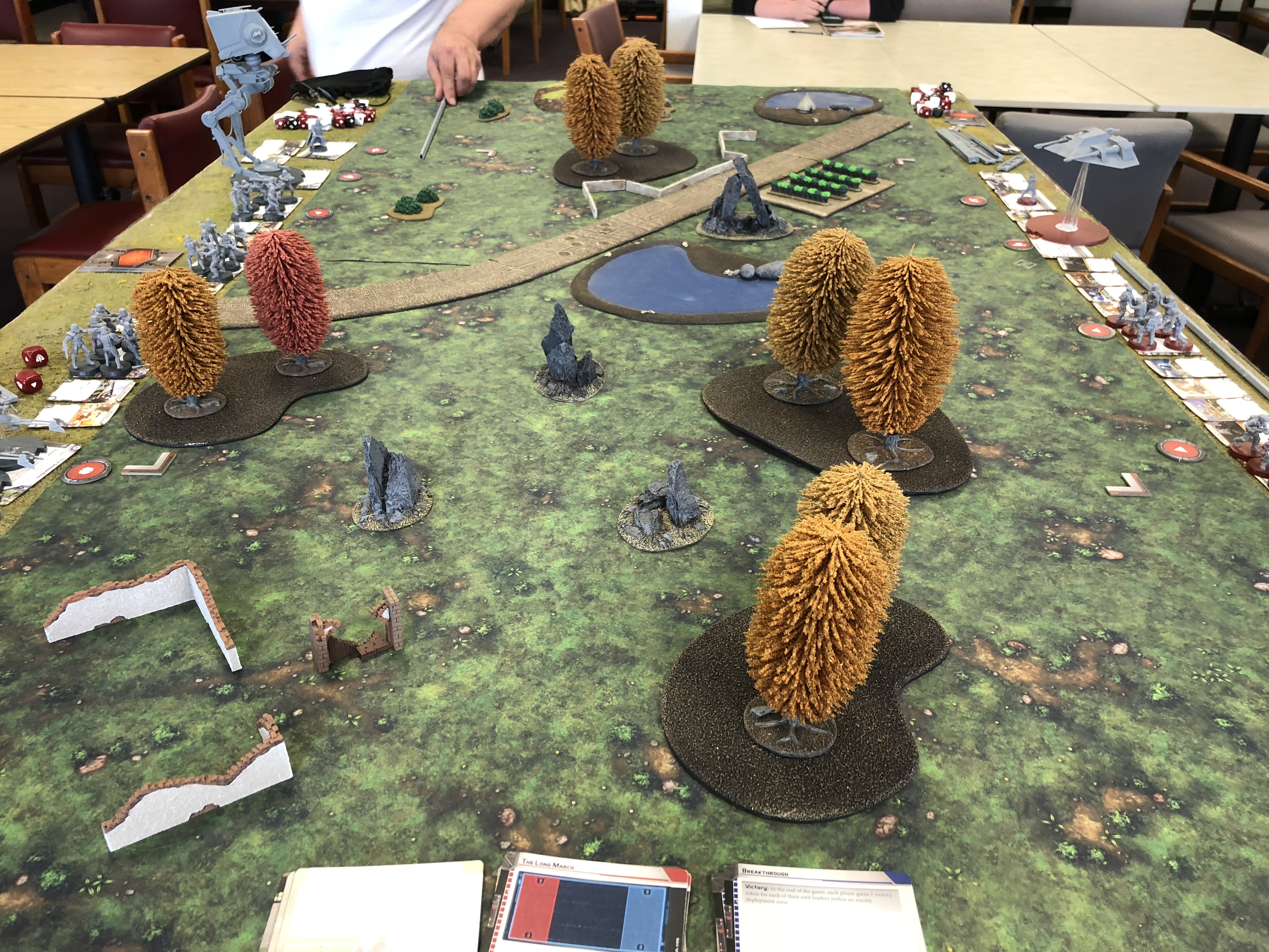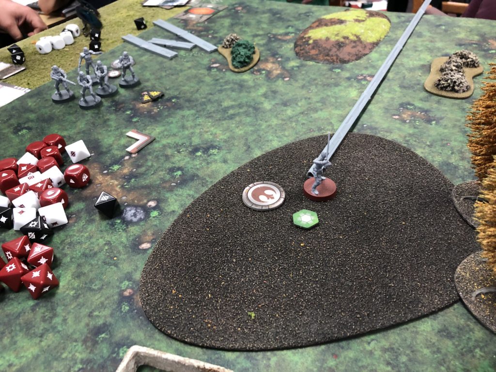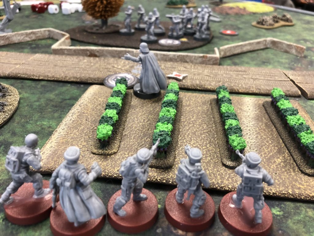 But wait, there’s a bunch of enemy stormtroopers just outside the woods. Using a jedi mind trick causes them to panic and run away since Vader isn’t nearby to …. um… motivate them. On Luke’s turn 6 activation, he makes a run for it and just barely crosses into imperial territory for the victory.